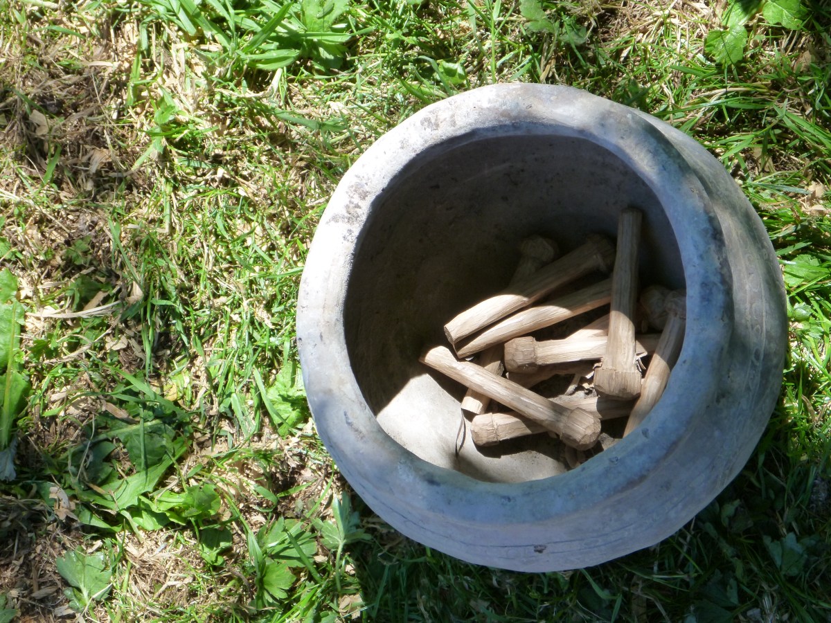 P1000494 Published July 4, 2013 at 4000 × 3000 in Ancient Doorways to Discovery Pt 3. The saga concludes… ← Previous Next → Our pot of pegs. Twenty hand crafted oak trennels ready to be bashed into position.