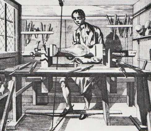 17cturner2 Published August 12, 2013 at 487 × 425 in Tool of the Month- The Pole Lathe Next → An 18th century turner in his workshop with a treadle-lathe.