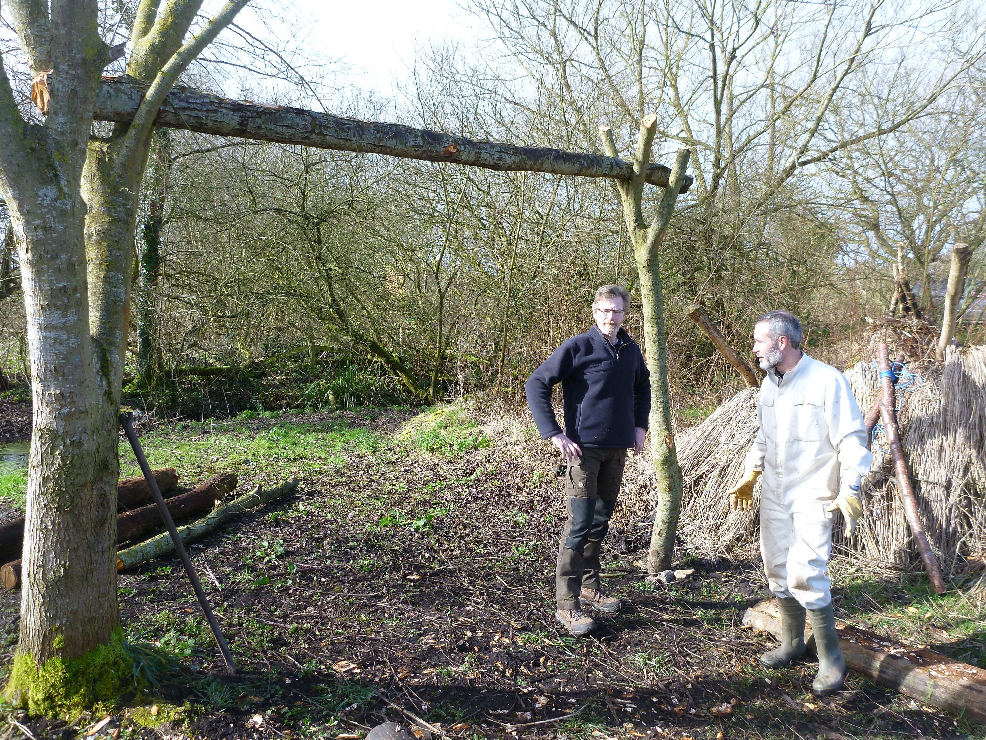 P1010300 Published April 11, 2014 at 4000 × 3000 in Sheds, Shacks and Shelters Pt.1 ← Previous Next → The first wall plate sits between a willow tree and a willow cruck (hopefully the post will sprout and grow!)