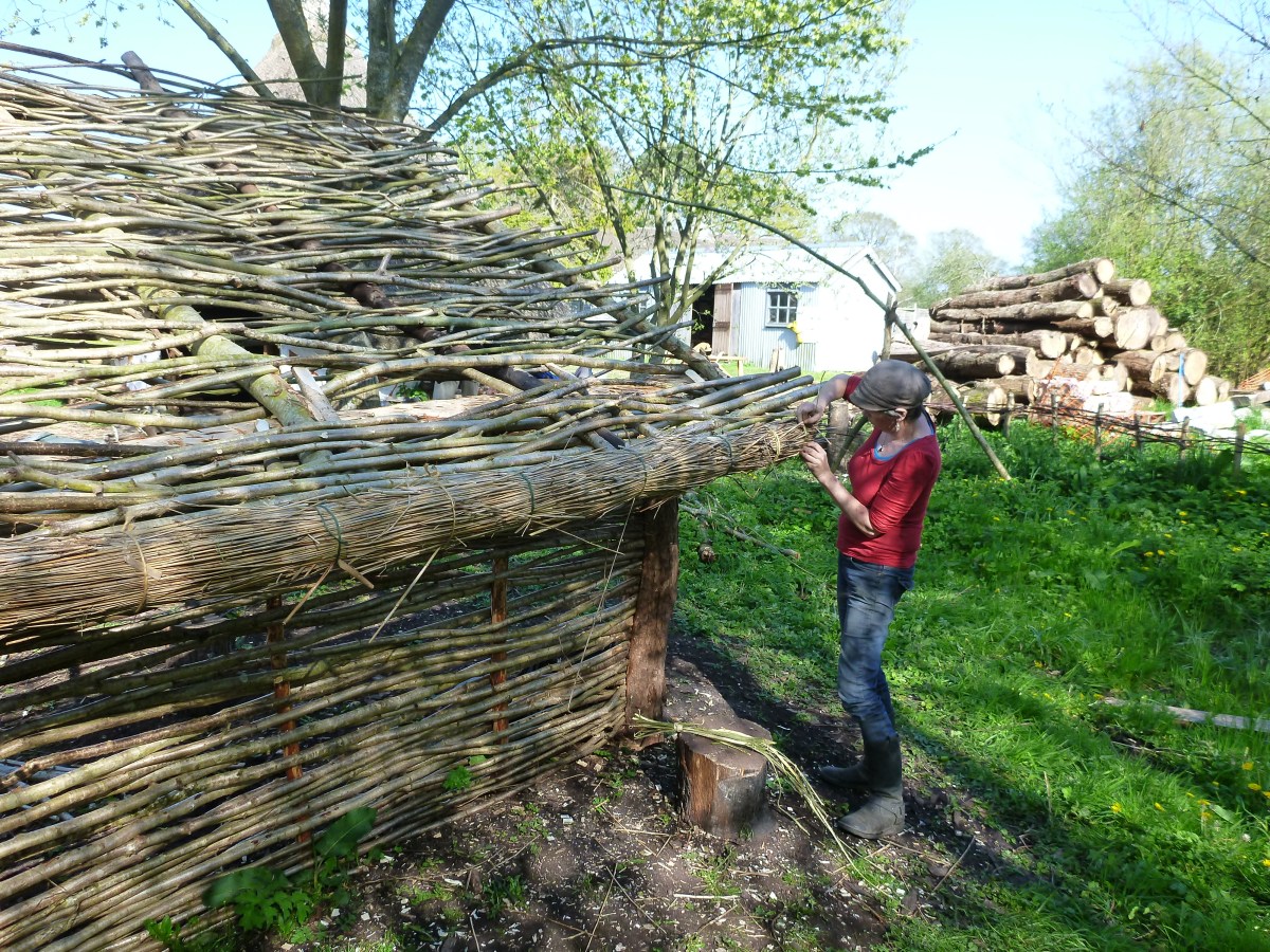 P1010388 Published April 22, 2014 at 4000 × 3000 in Sheds, Shacks and Shelters Pt.2 ← Previous Next → Tanya pushes the bundle onto sharpened stakes protruding from the eaves to hold it in place.