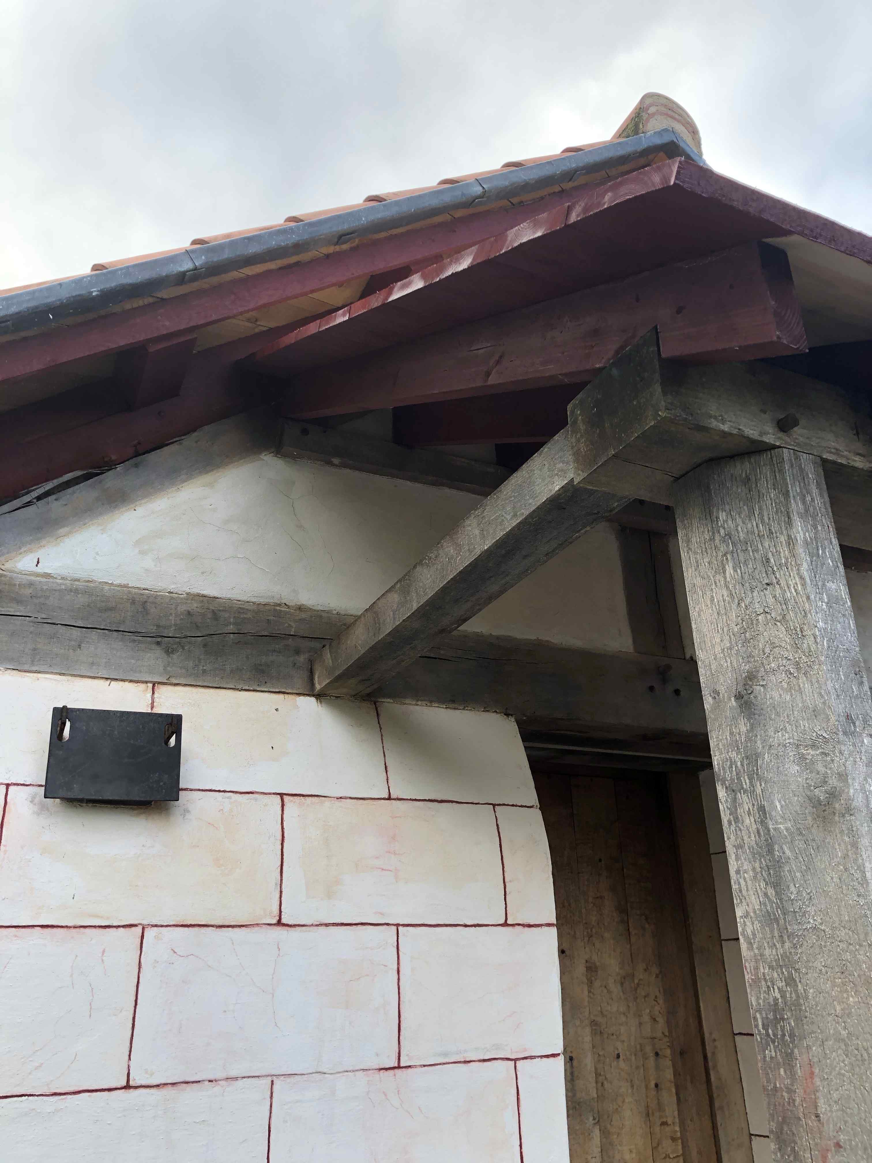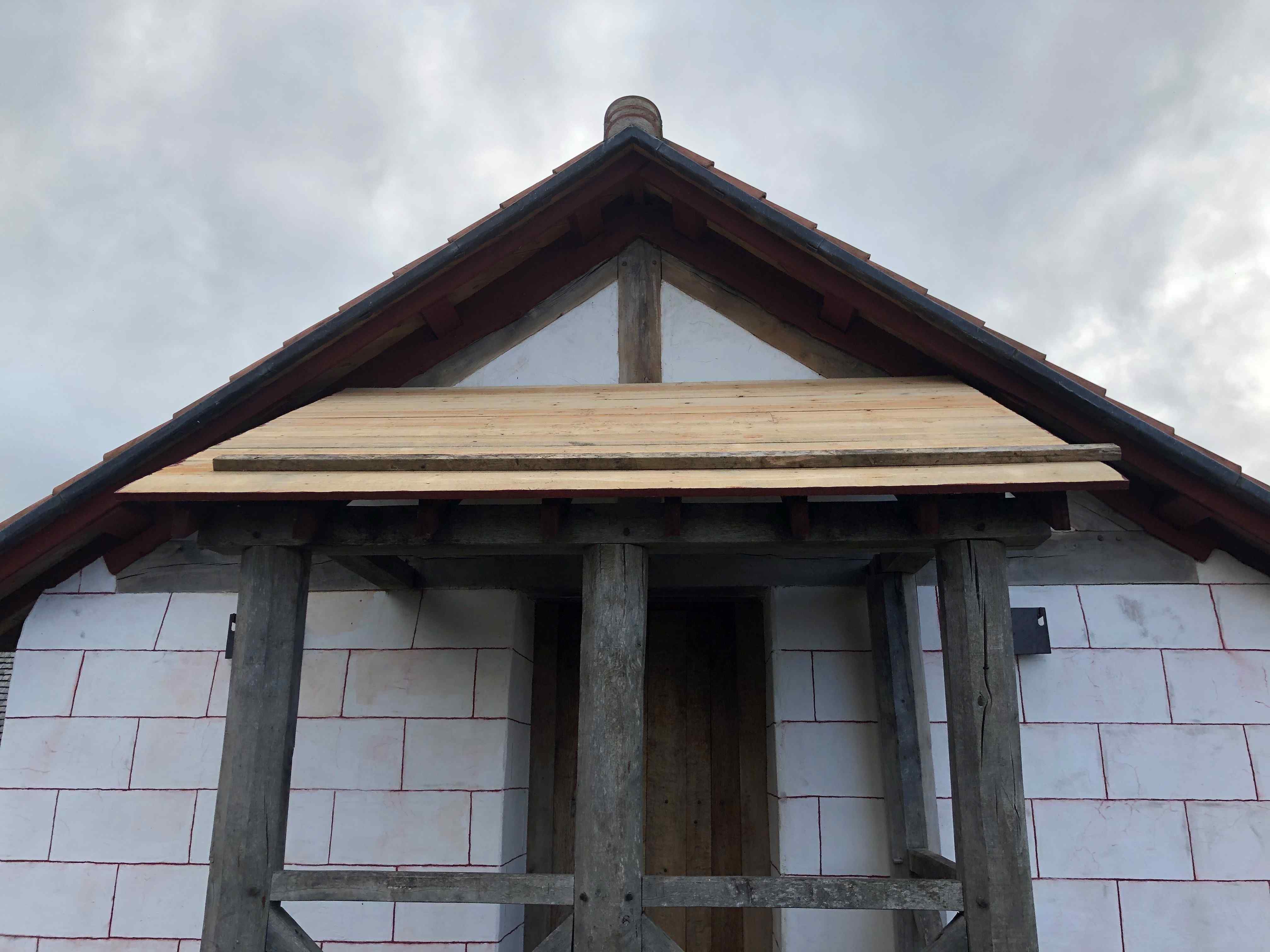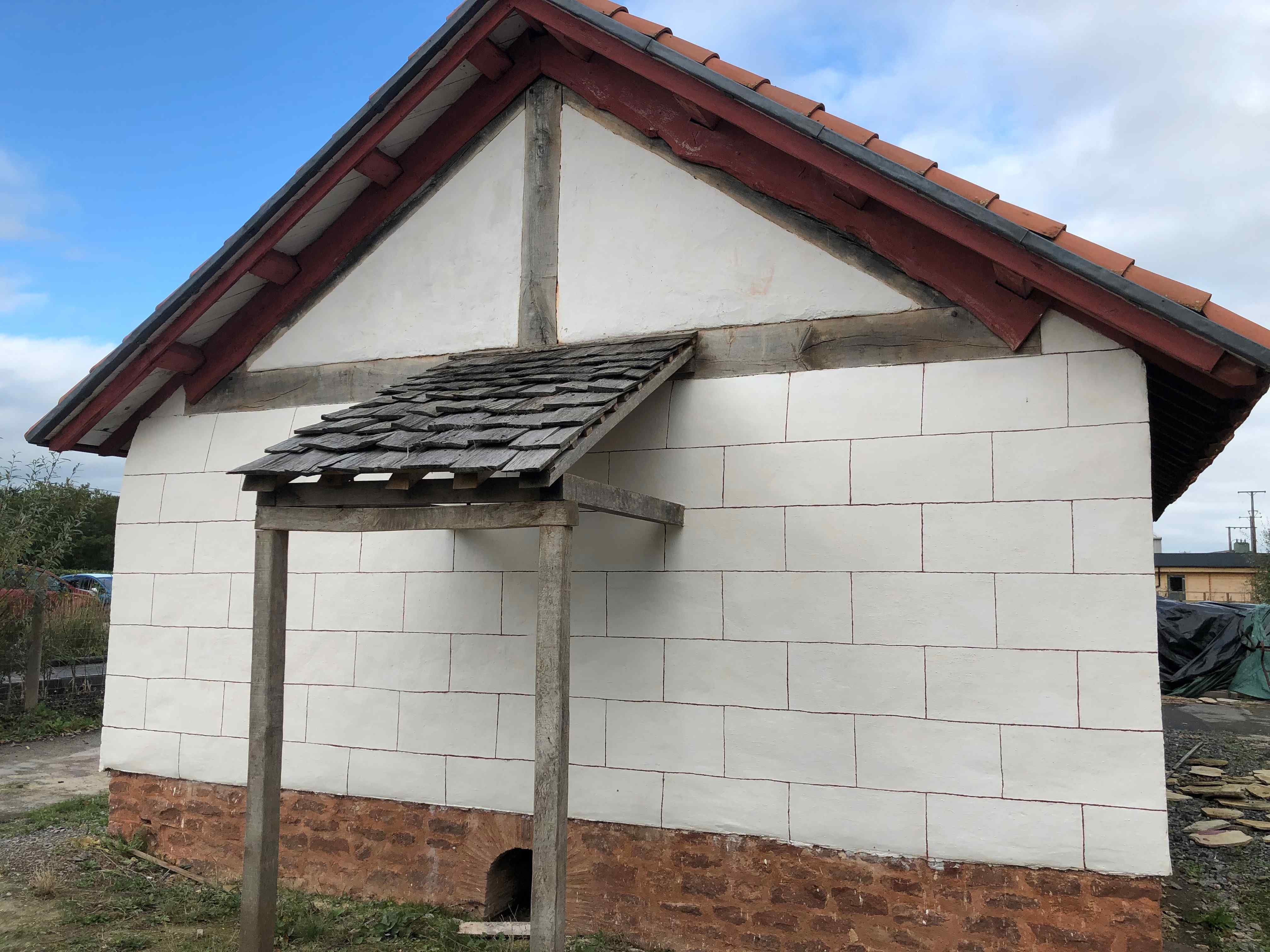 Both ends of the Roman building have had work done recently. The furnace end has been completely re-limewashed and the fake ashlar block stonework redone with a mixture of red ochre and linseed oil. That seems to avoid the problem of the red running which we had before. At the front end the planks of the porch are on, ready for the stone tiles which have been estimated to weigh 1.3 Minis (not a standard Roman measurement).
