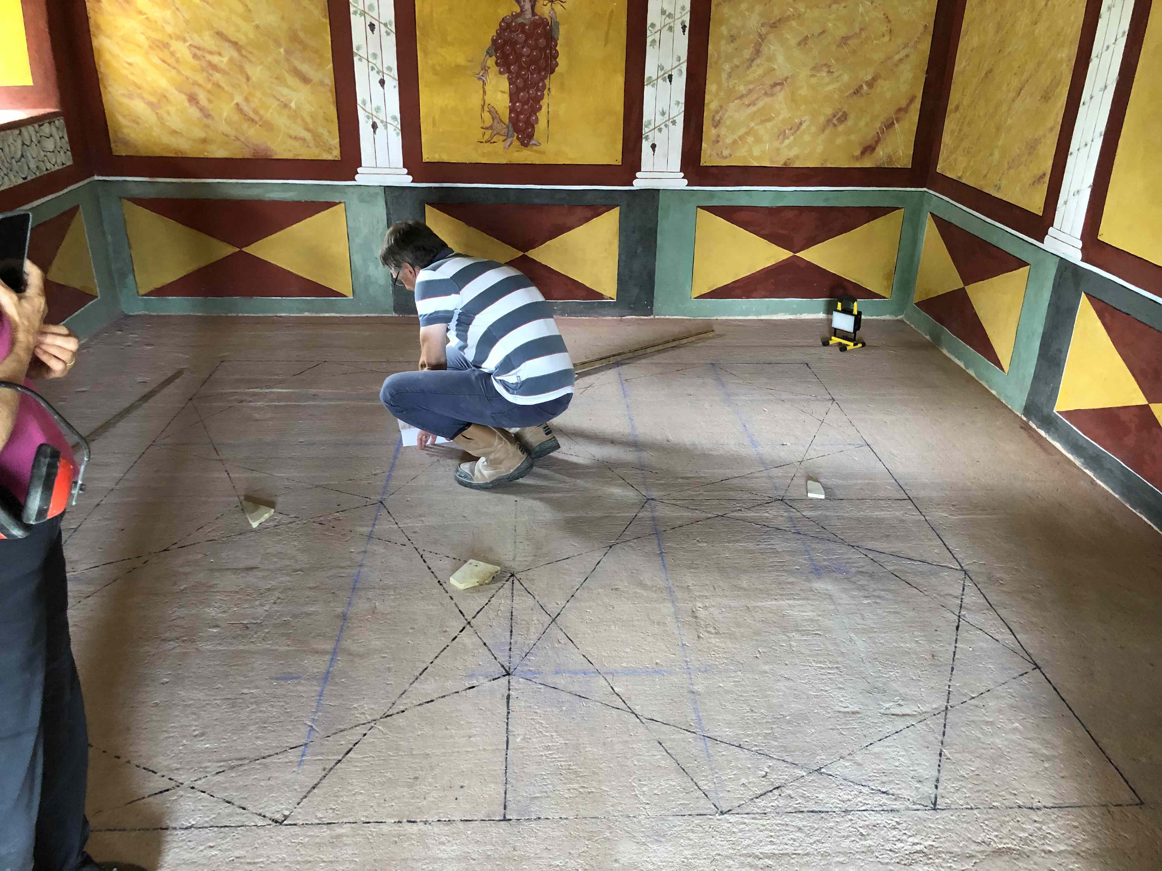 Strange designs have appeared on the floor of the Roman building. Vandalism by a devil worshiping clique? Thankfully not, its just the mosaic design being laid out, following a design from Hurcot villa with slight modification from a simialr design from Hadspen villa to help make it fit it in the room. Meanwhile the Tesserae Totaliser keeps creeping up towards its targets, with the experimental work also solving questions such as mortar colour and depth.