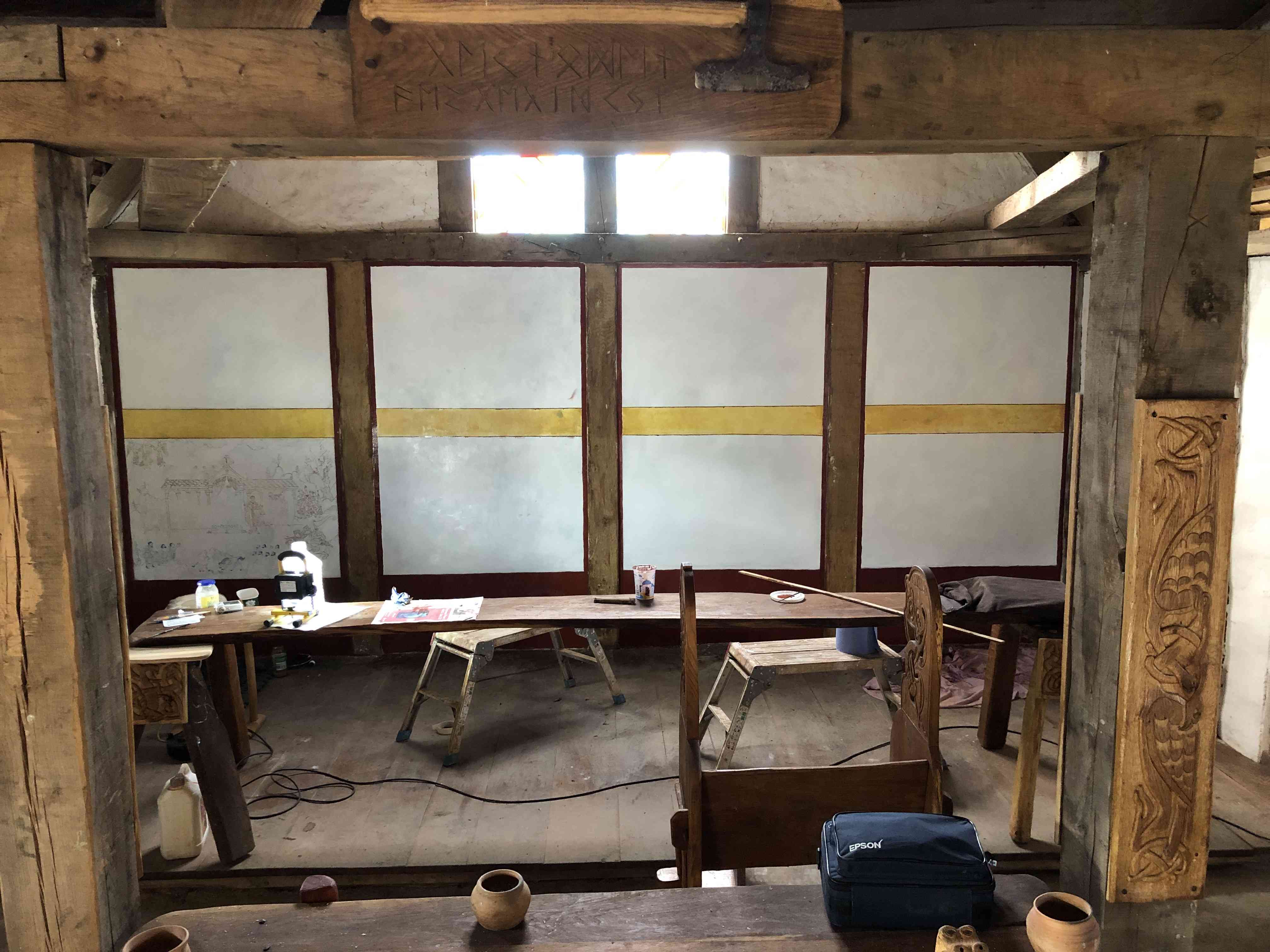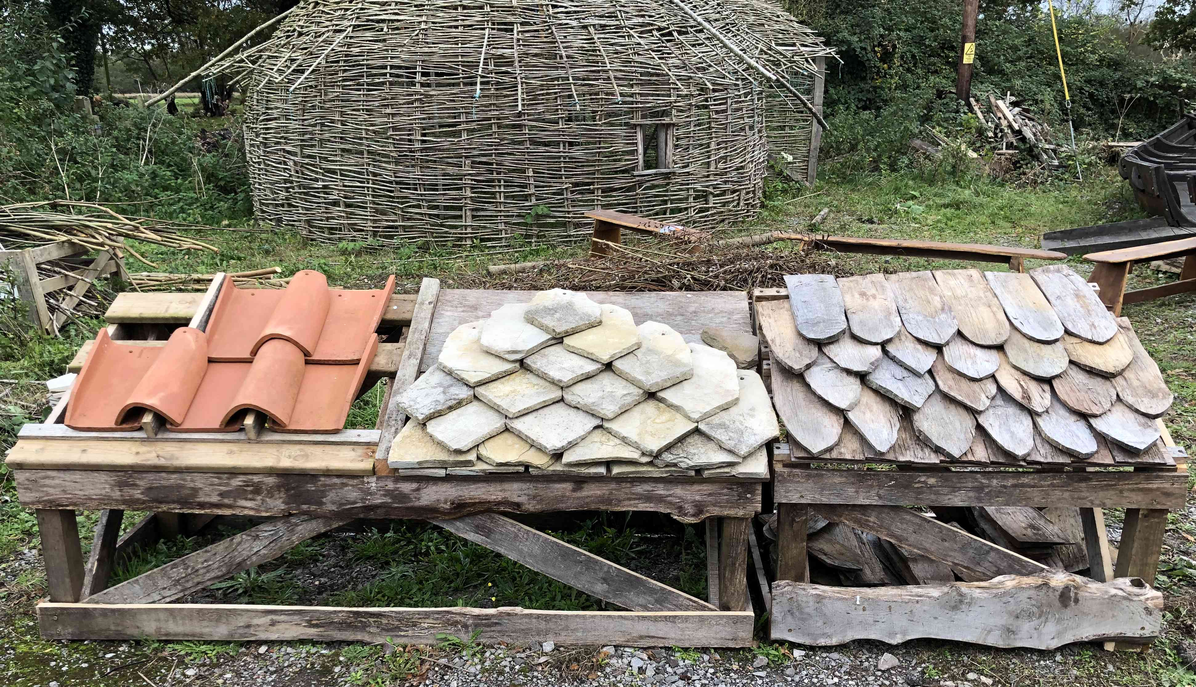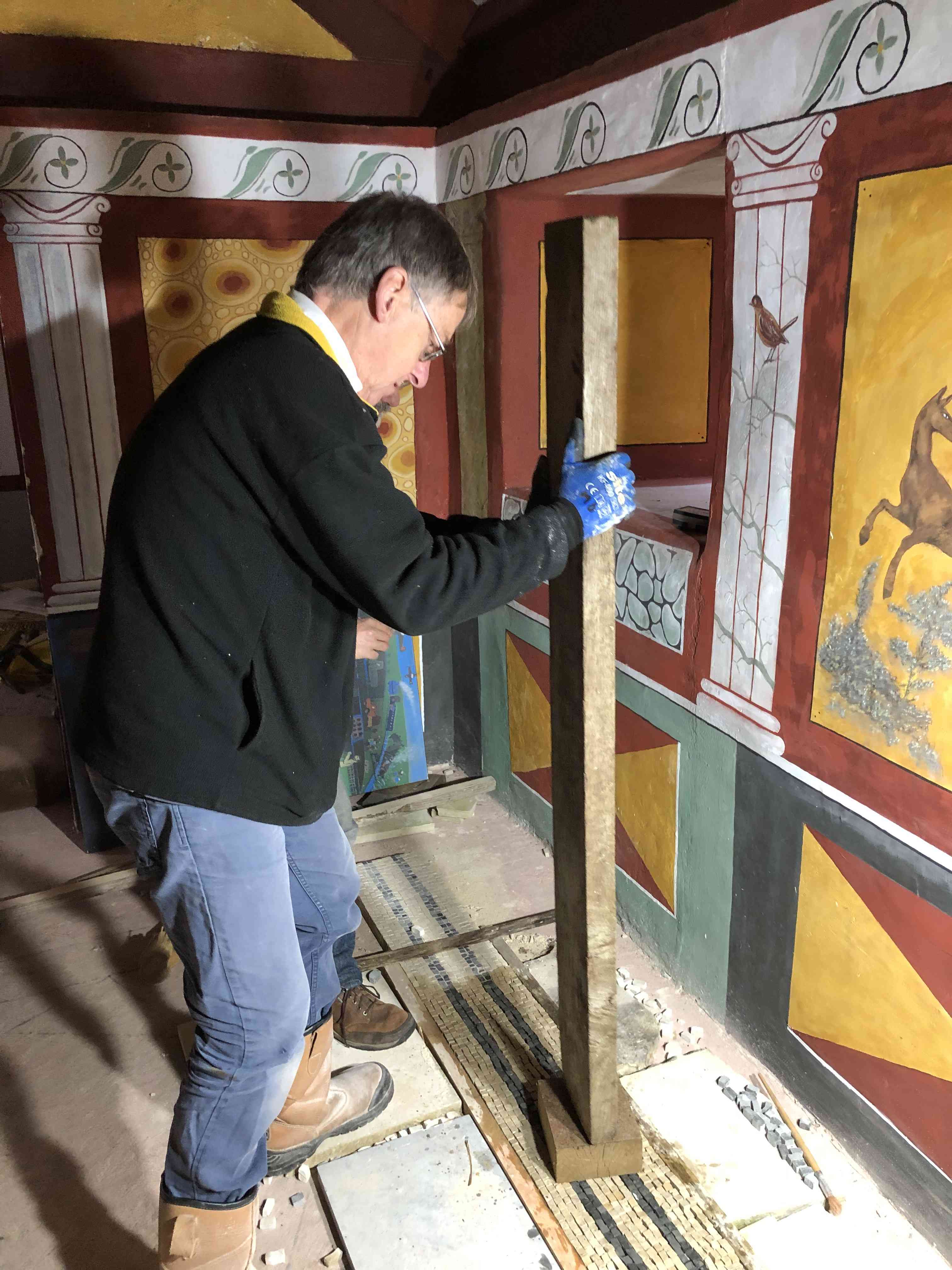 Progress on lots of fronts this week. Mosaic laying marches on in the Roman building, the Viking bed takes shape, the frames for the mural in the Saxon longhall are painted and the display of roofing materials is looking great. Meanwhile four bits of holly kindly provided by Steve have been carefully shaped where a side branch comes away from the main trunk. Their mysterious purpose will be revealed in a future post.
