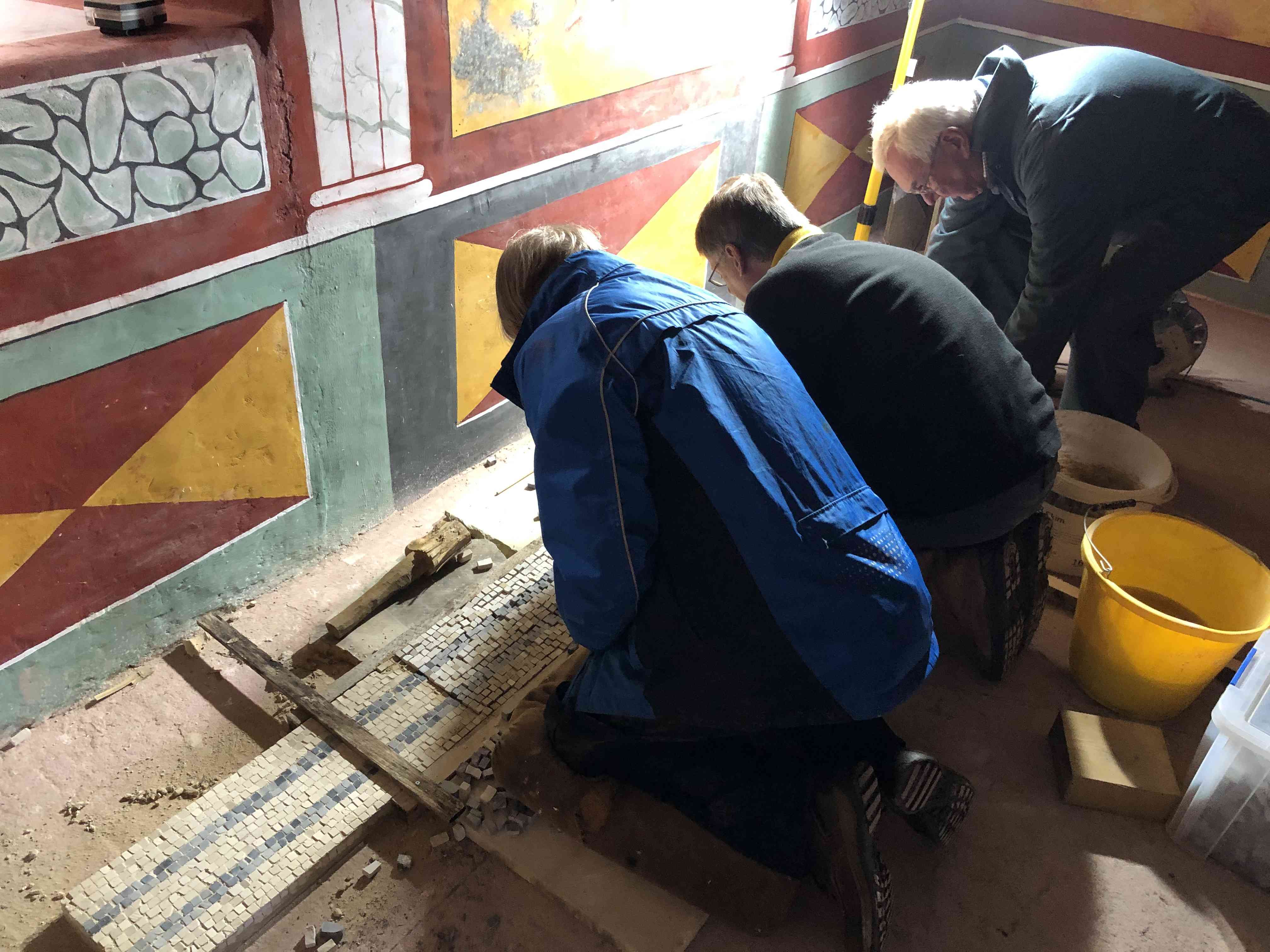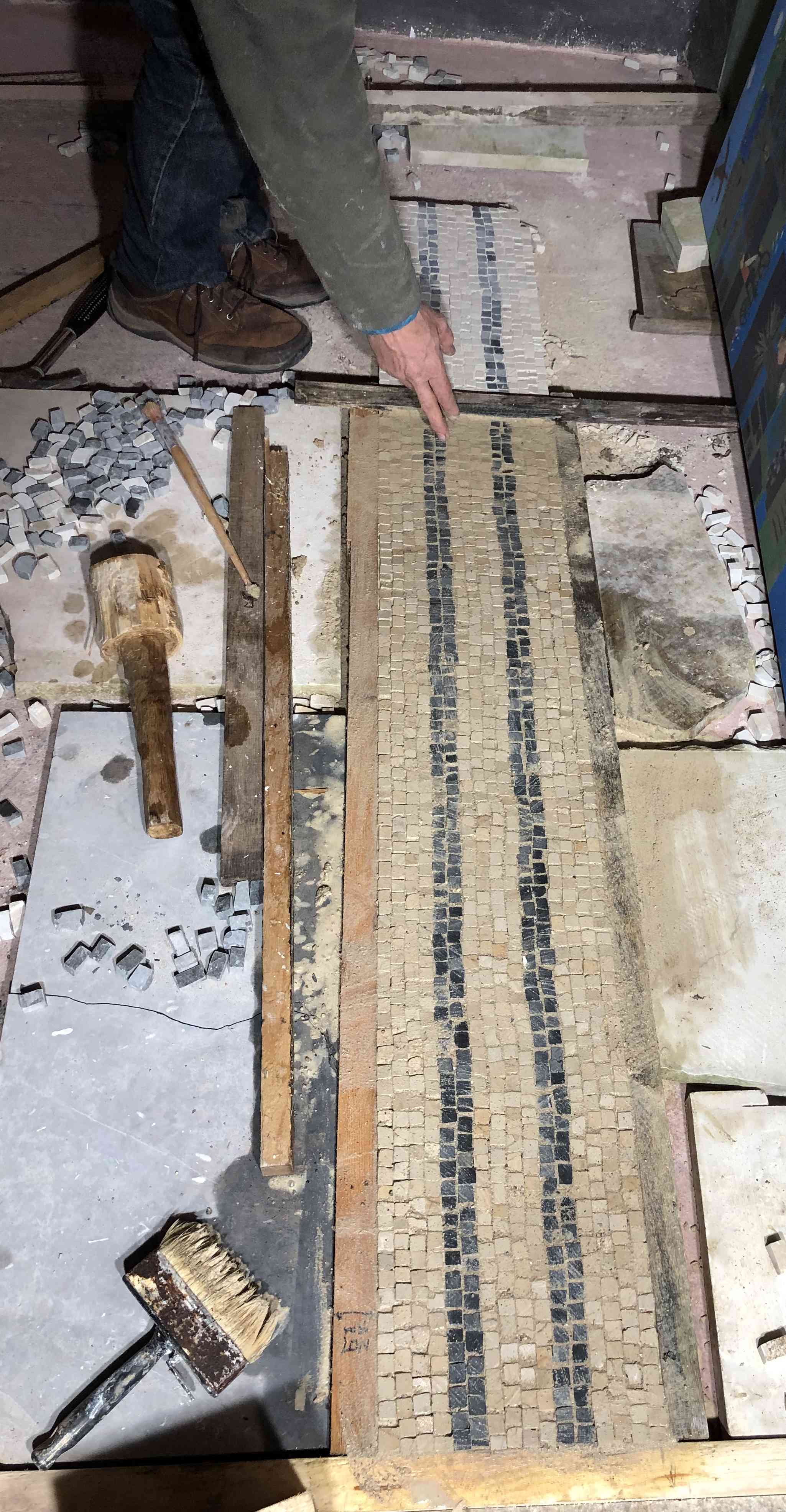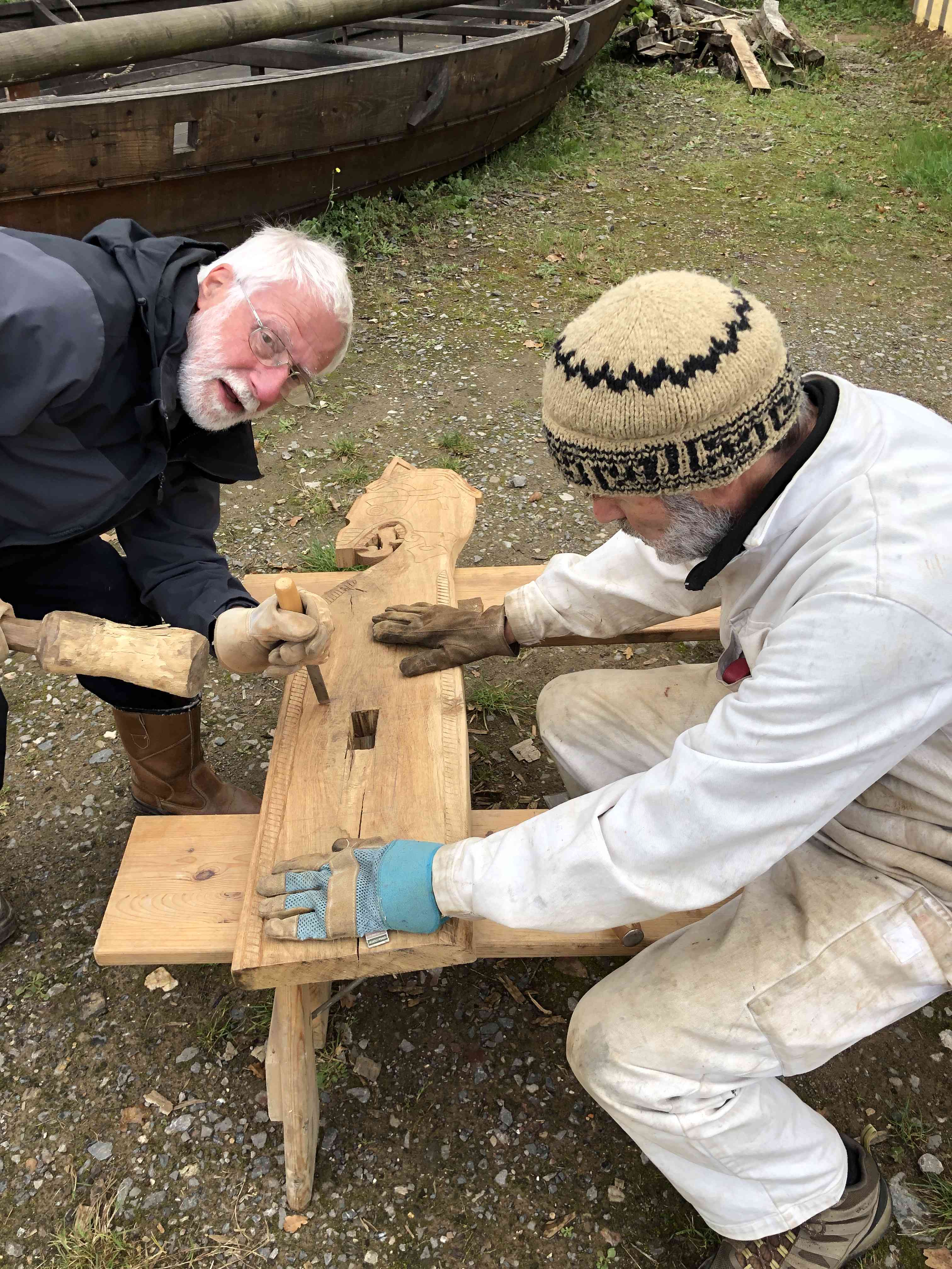 Progress on lots of fronts this week. Mosaic laying marches on in the Roman building, the Viking bed takes shape, the frames for the mural in the Saxon longhall are painted and the display of roofing materials is looking great. Meanwhile four bits of holly kindly provided by Steve have been carefully shaped where a side branch comes away from the main trunk. Their mysterious purpose will be revealed in a future post.