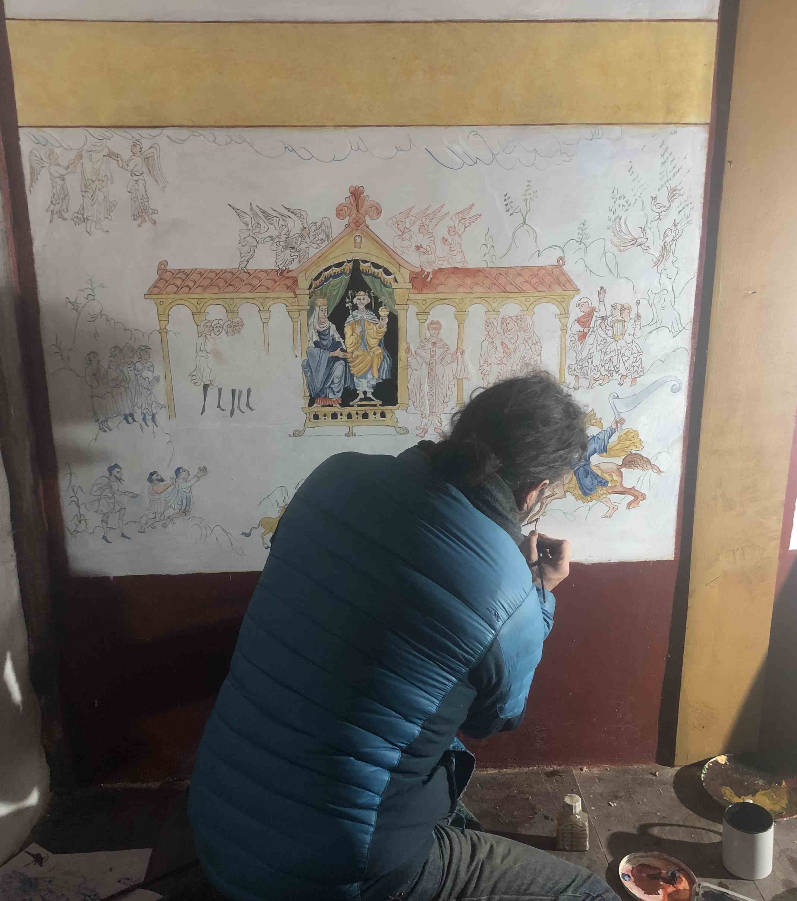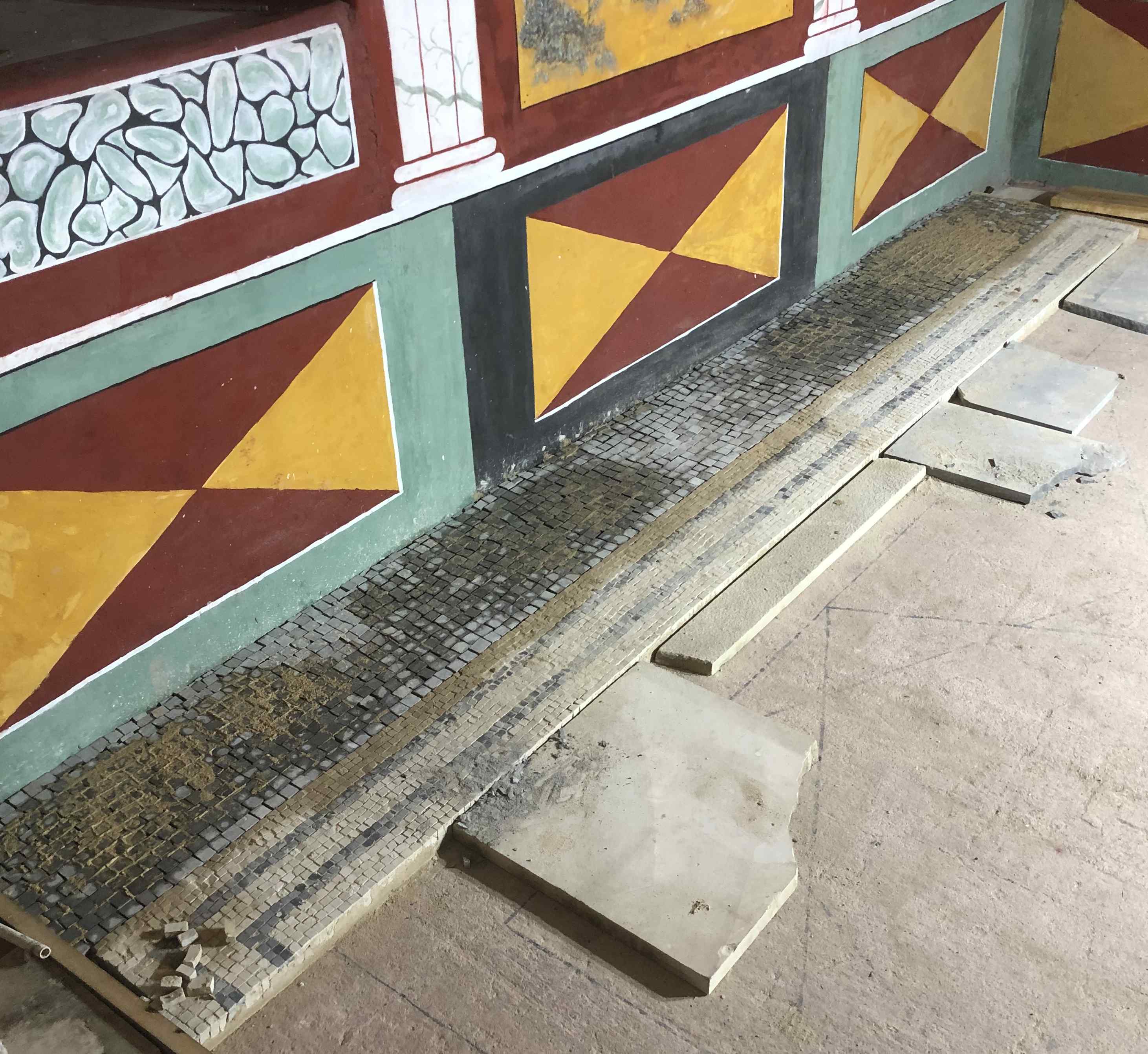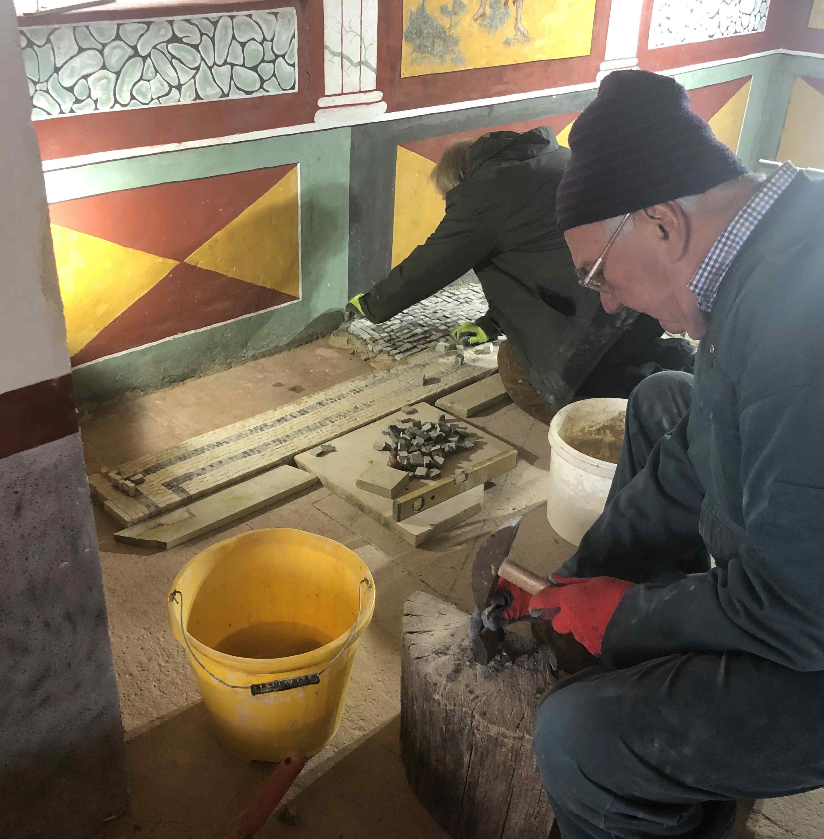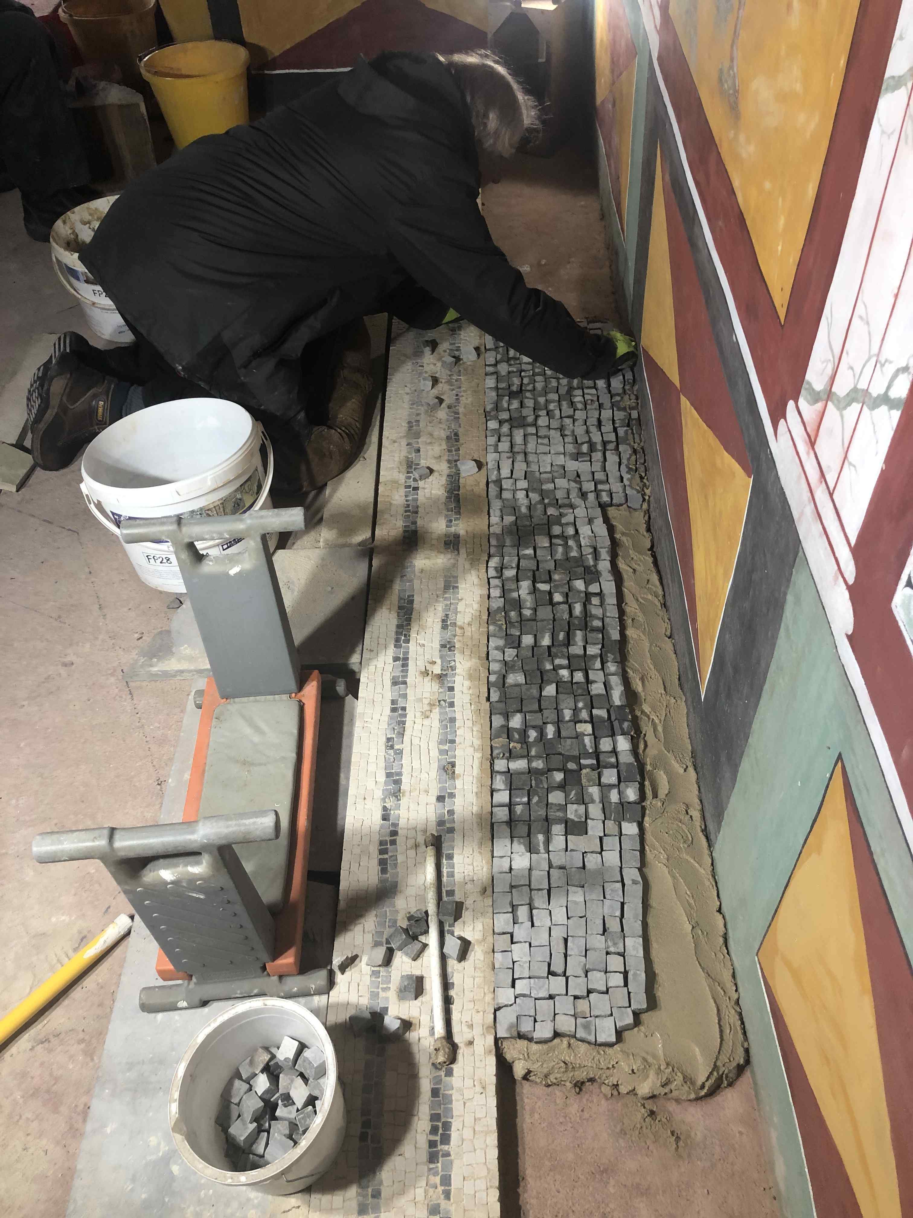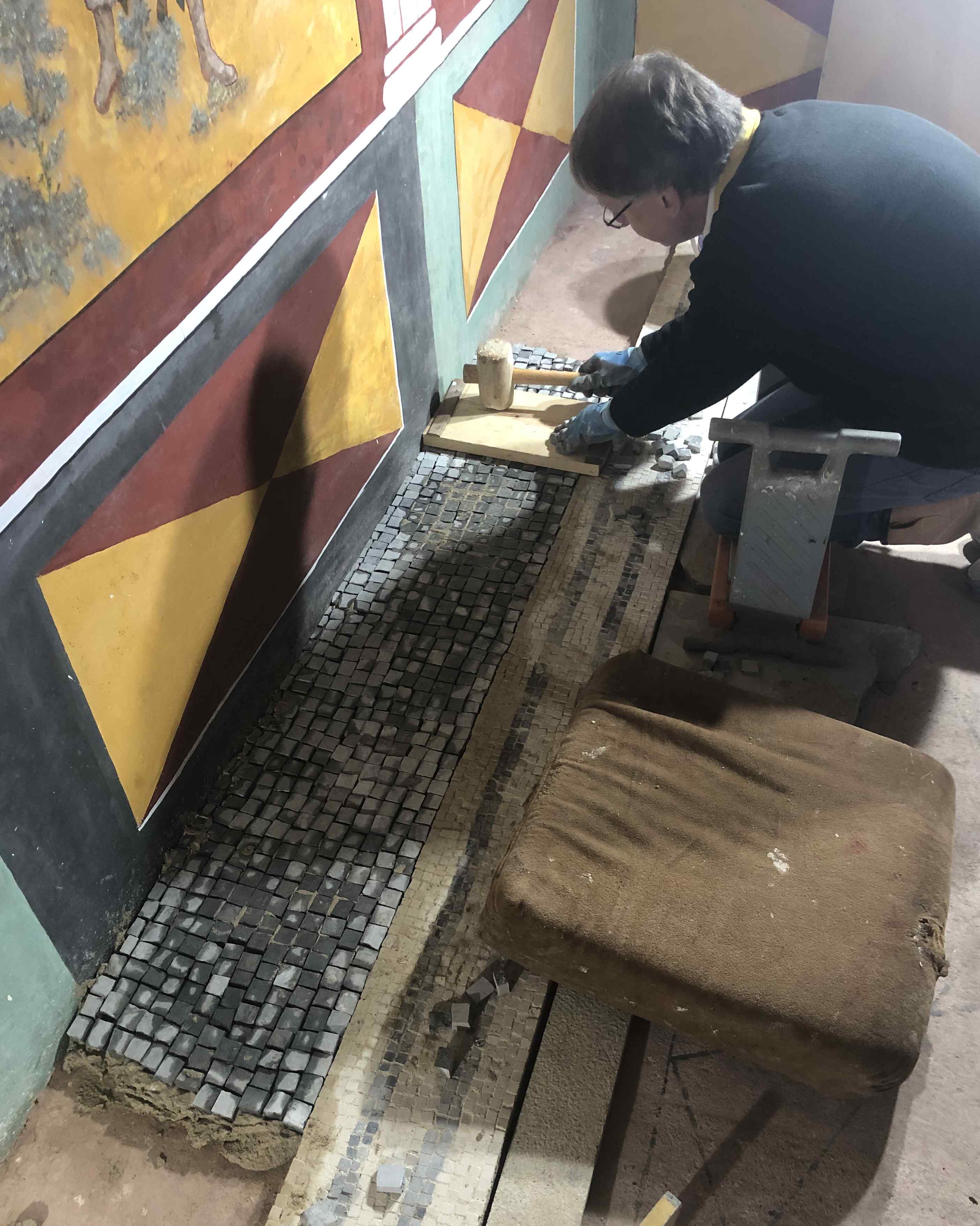 Borders have quite rightly been in the news this week, as 4m of blue border mosaic was laid in just one short day. That’s about a quarter of what is needed for the room and so quite rightly made the front page of Roman Mosaicist Weekly. Things will no doubt slow down again when we get to the twiddly bits (excuse the technical terminology). A little known fact about Anglo-Saxon illustrations is that landscapes often had toes in them. Play ‘where’s the big toe’ in the landscape mural below. Answers on a £20 note to the usual address.
