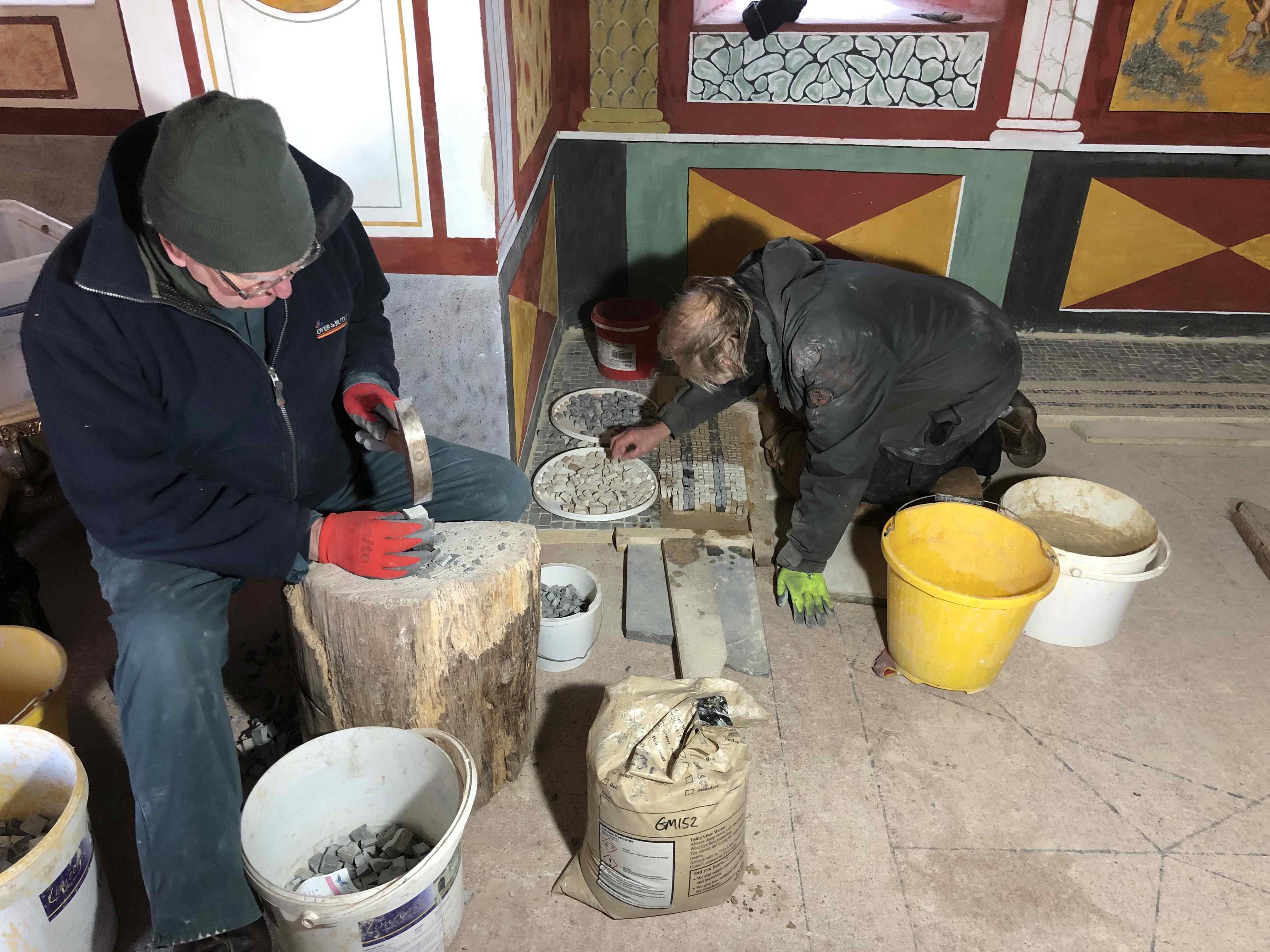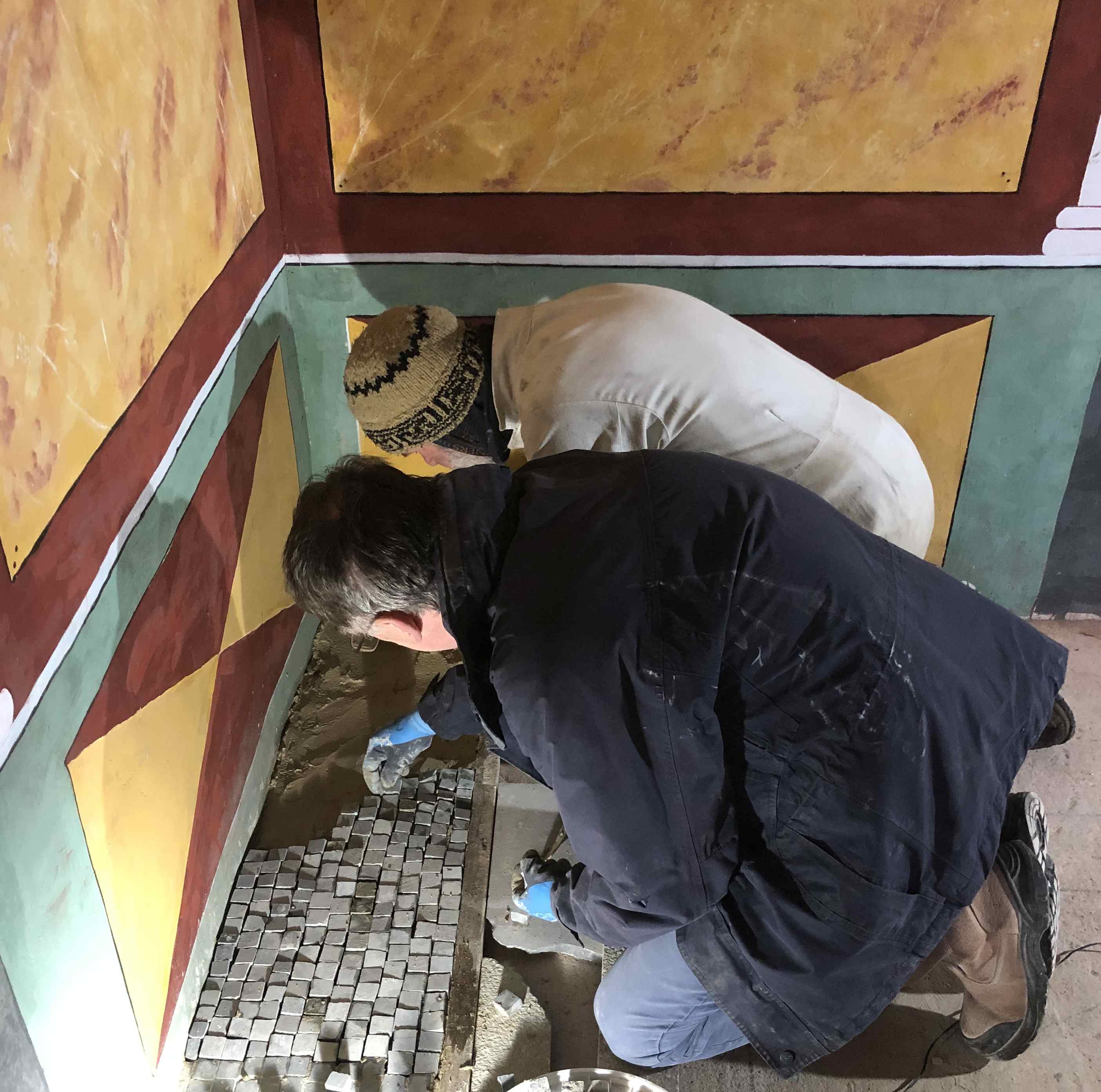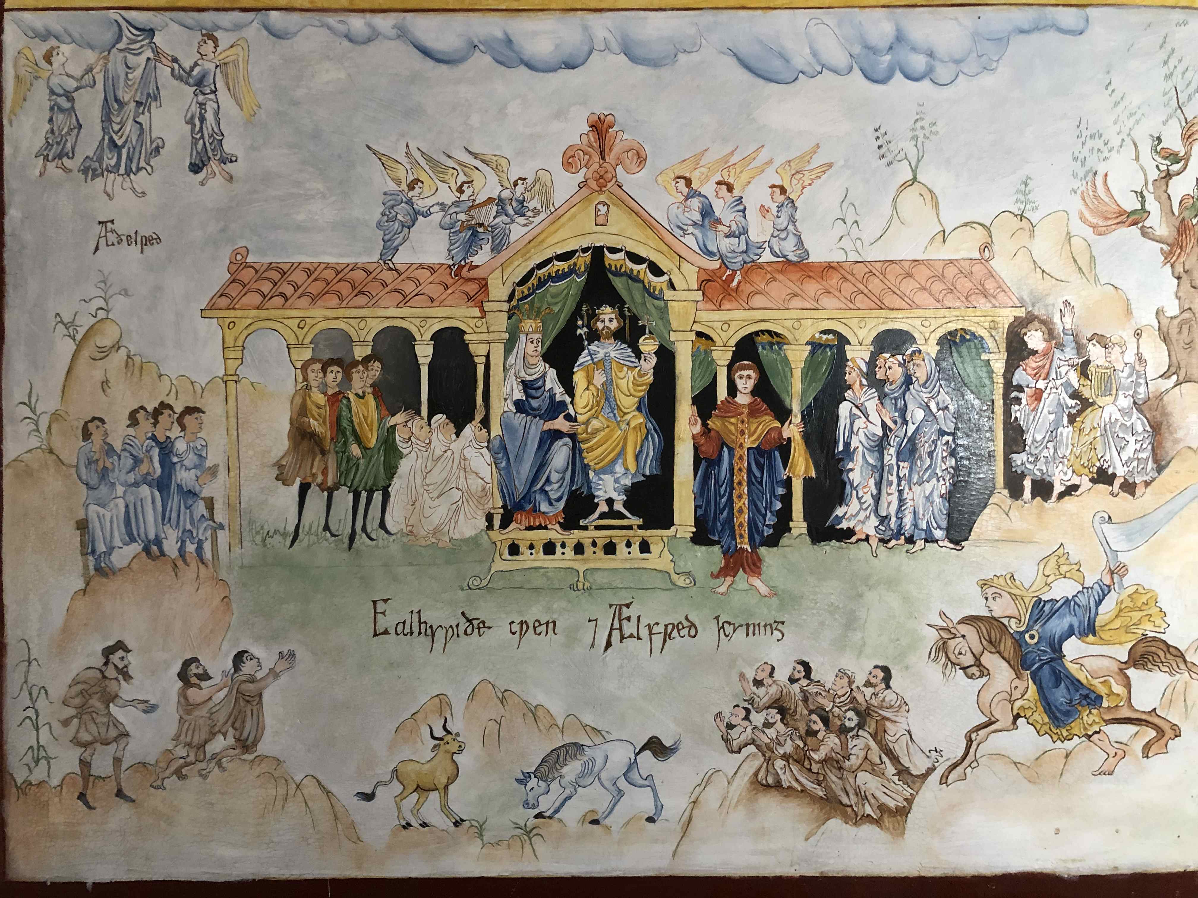 The longhall made a brief appearance on the new series of ‘Digging for Britain‘ as the location for some experimental beer brewing. As Stuart Prior said on the programme, it would probably taste better the more you drank. Meanwhile the first of the 8 panels in the ‘Alfred and the Vikings’ series nears completion (the coronation scene) inspired by the artwork from 16 manuscripts published in ‘Anglo-Saxon textural Illustrations‘ by Thomas Ohlgren, with a bit of Bayeaux Tapestry thrown in for good measure. The lettering mimics Alfred’s own handwriting from his preface to a translation of Gregory the Great’s pastoral Care. More mosaic has been laid, with the challenge of the guilloche border to come in next week’s thrilling episode.