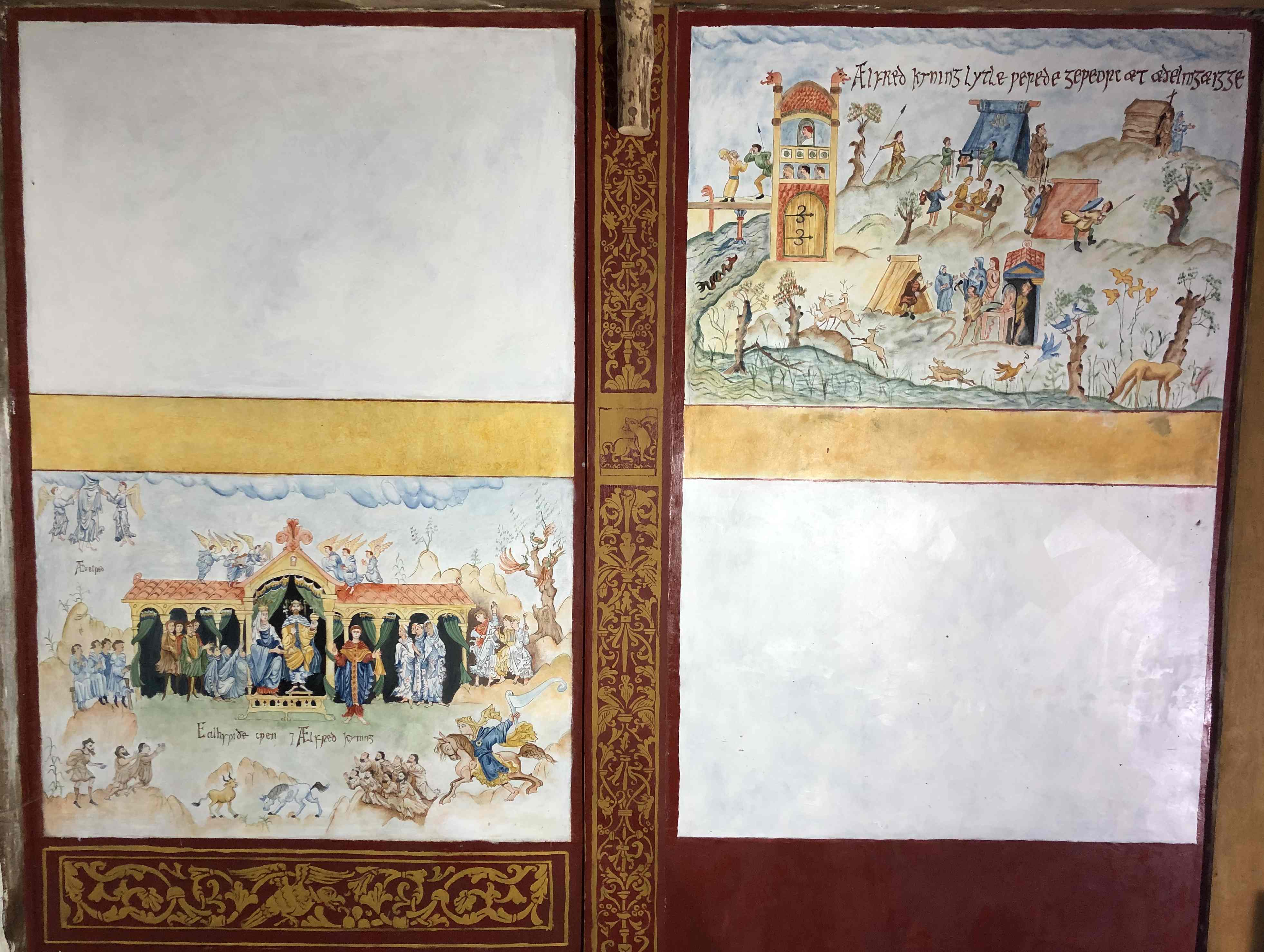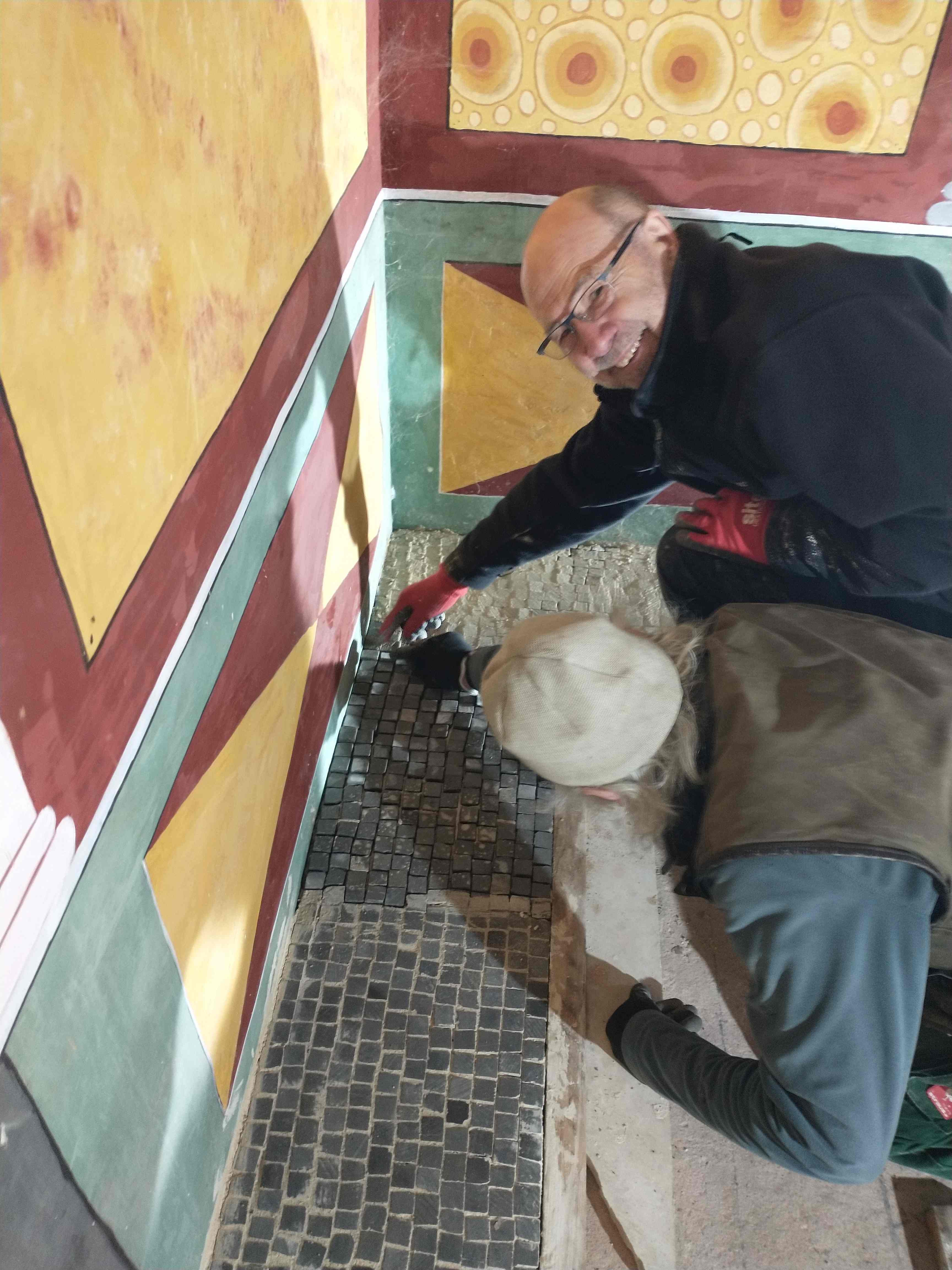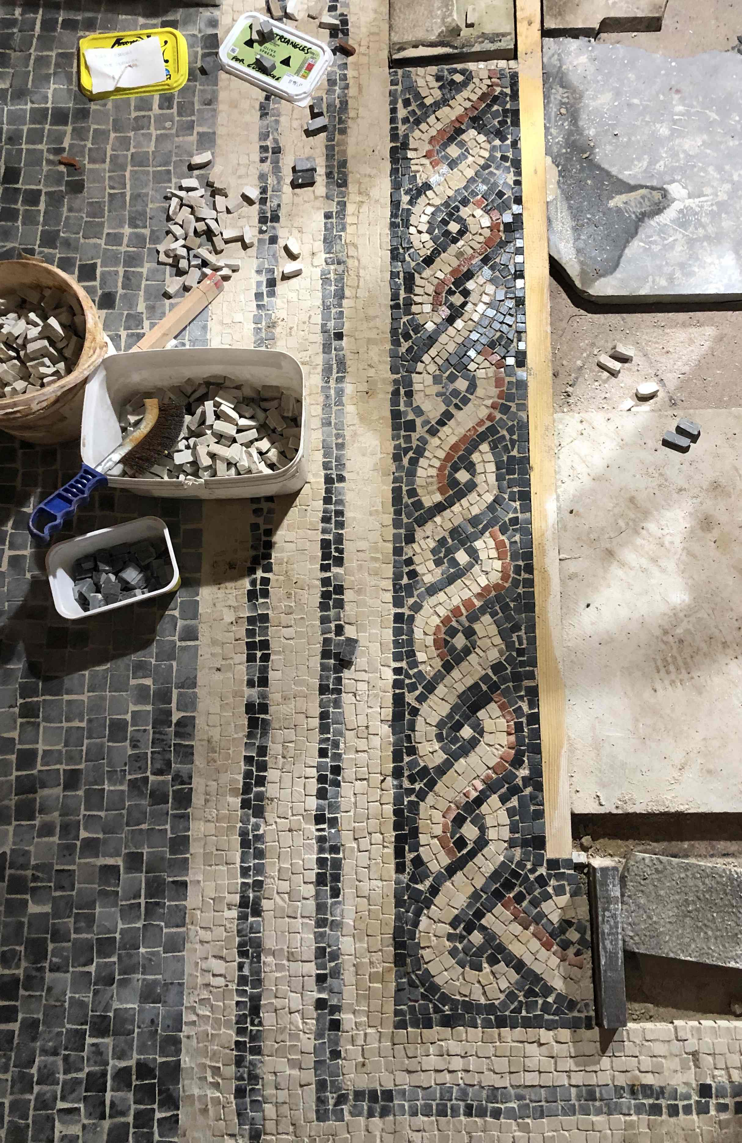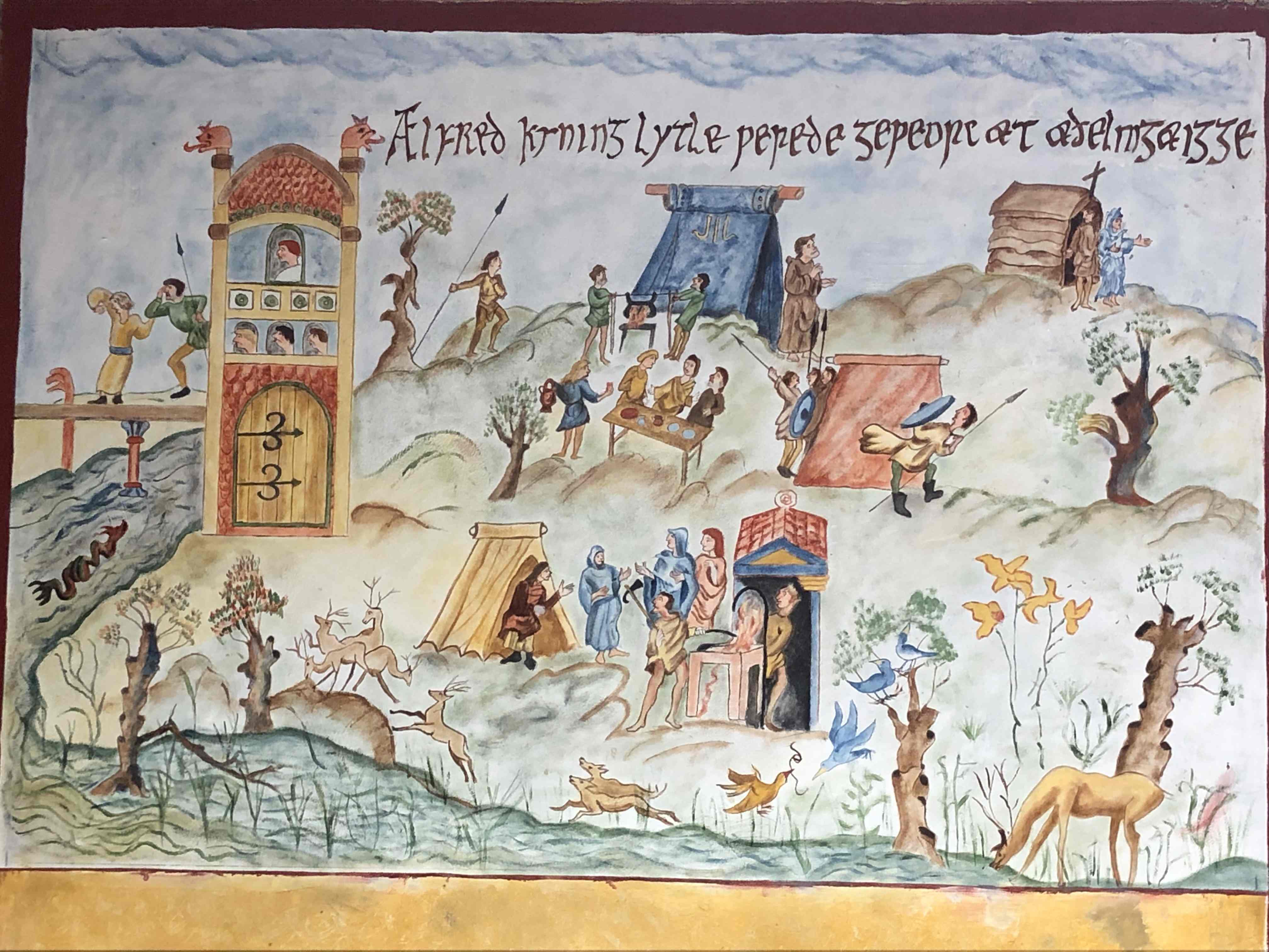 A great week, begun with a rainy morning collecting coppiced hazel at Ebbor for the roundhouse. Thanks to those who braved the elements and to Phil of Natural England for making it happen. Panel 3 of the Saxon mural was completed by Dave – ‘Alfred with a small troop built a fortification at Athelney‘, in case you were wondering. Another 1,000 tesserae went down, with the outer blue border complete and the b/w border and guilloche slowly expanding. Elsewhere the storage area was finally cleared, and carving progressed on the ends of the Viking bed.