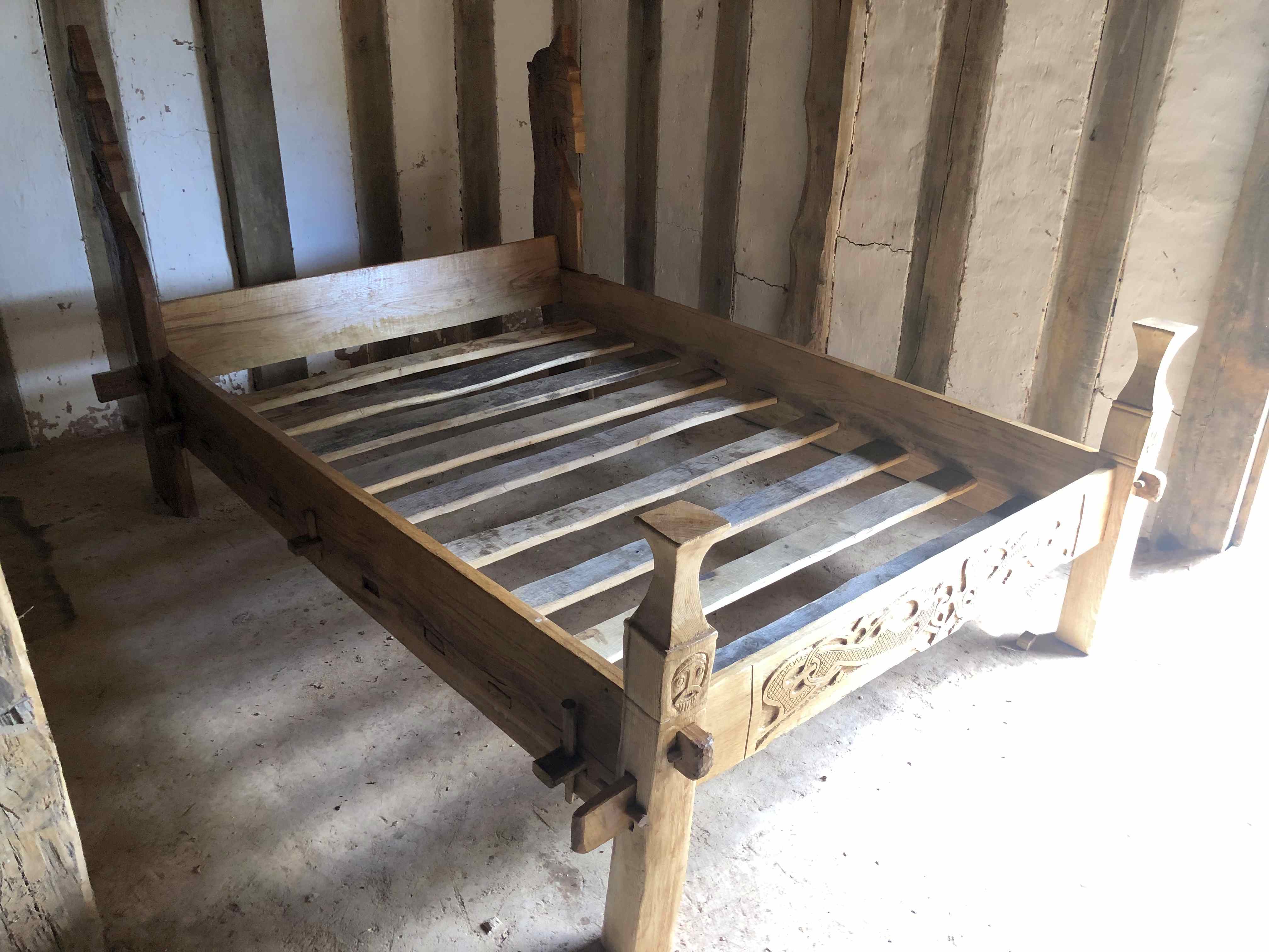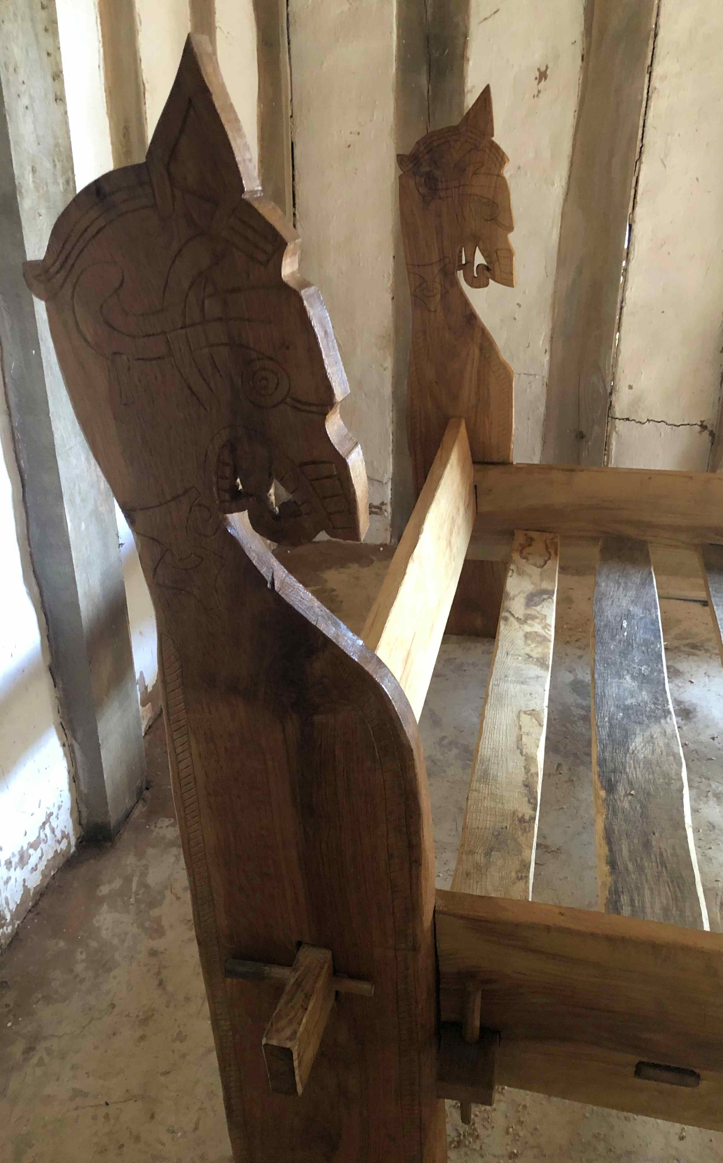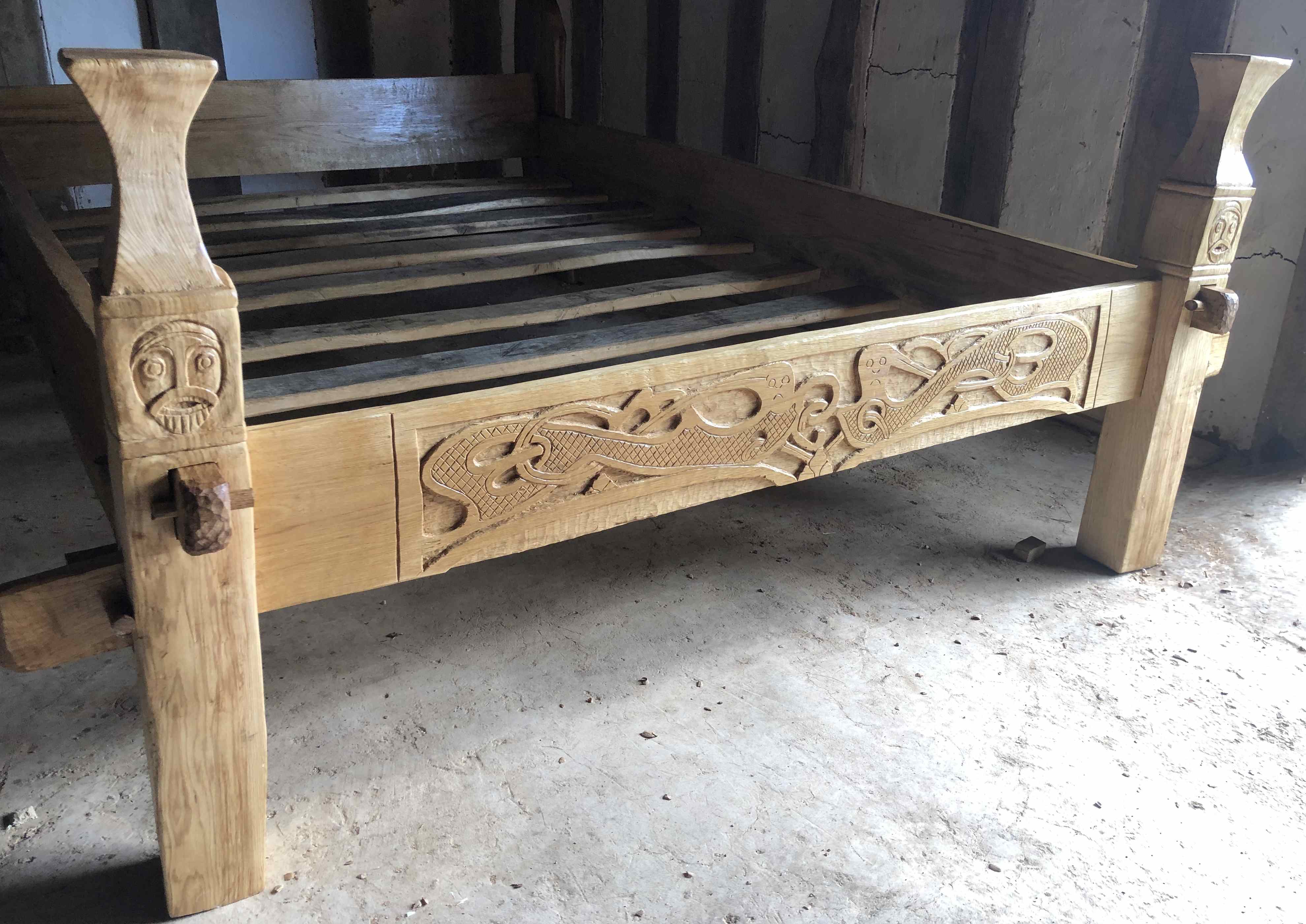 A replica has been made of a bed based on the evidence from the Oseberg and Gokstad ship burials in Norway for the back room in the Saxon longhall. Why go to Norway for a bed? We just have no evidence for beds from Anglo-Saxon England, so we have to go where the evidence survives. Our version of the bed is slightly different from the original as we have augmented the foot end with some extra carvings, with heads from the Oseberg cart and a pair of semi-human figures from a timber behind the helman’s head from the Oseberg ship. The fierce horse heads are based on the ones from the Gokstad bed. There is a petition at the moment to support the completion of the new museum in Oslo where all these wonderful things are preserved and displayed.