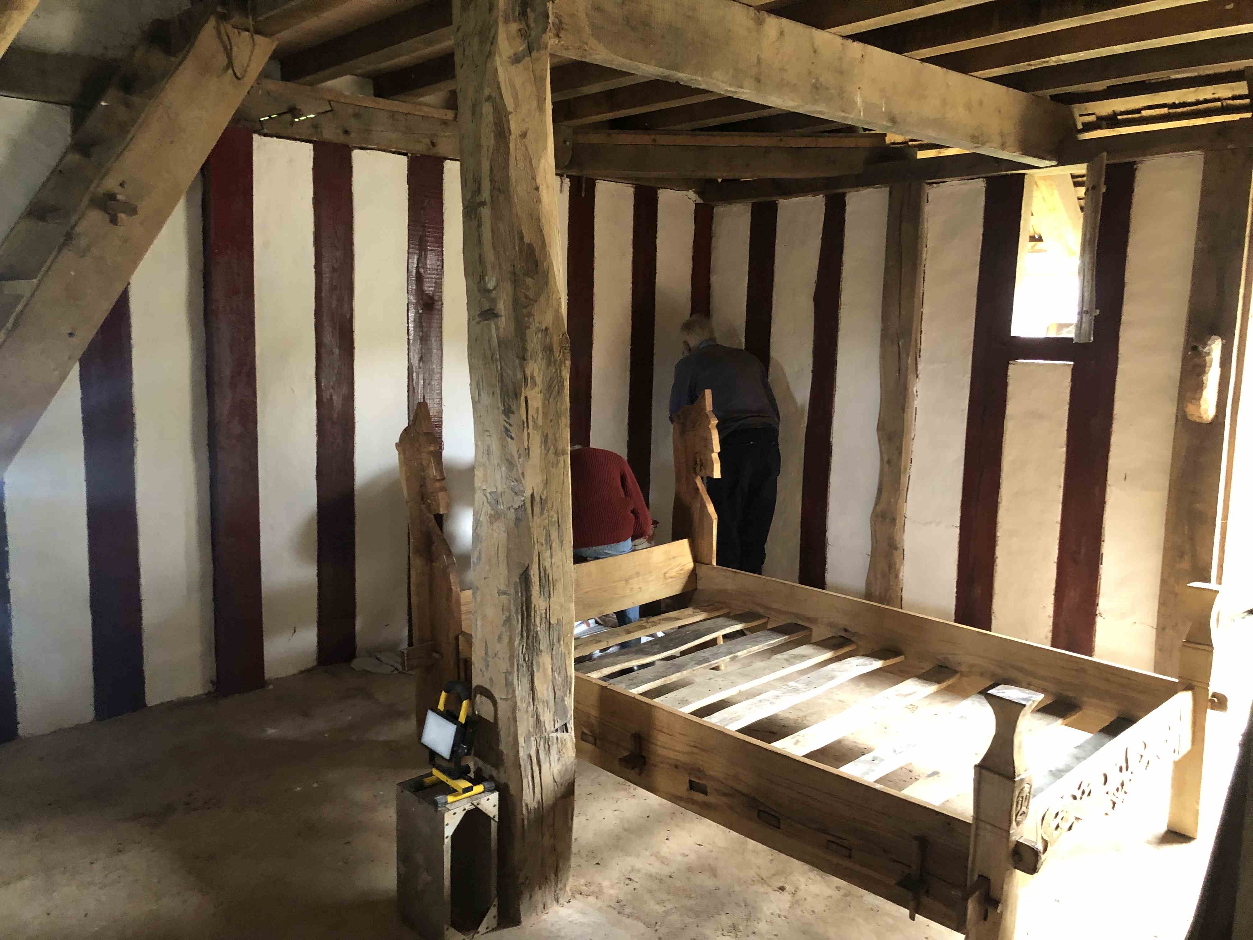 As the back room of the Saxon longhall has now been turned into a bedroom by the addition of the Oseberg inspired bed, it was decided to add a bit of colour with a fresh limewash on the daub and red ochre and linseed applied to the woodwork. Very stripey and a bit more cheerful than before. Other furniture and furnishings to follow in time.