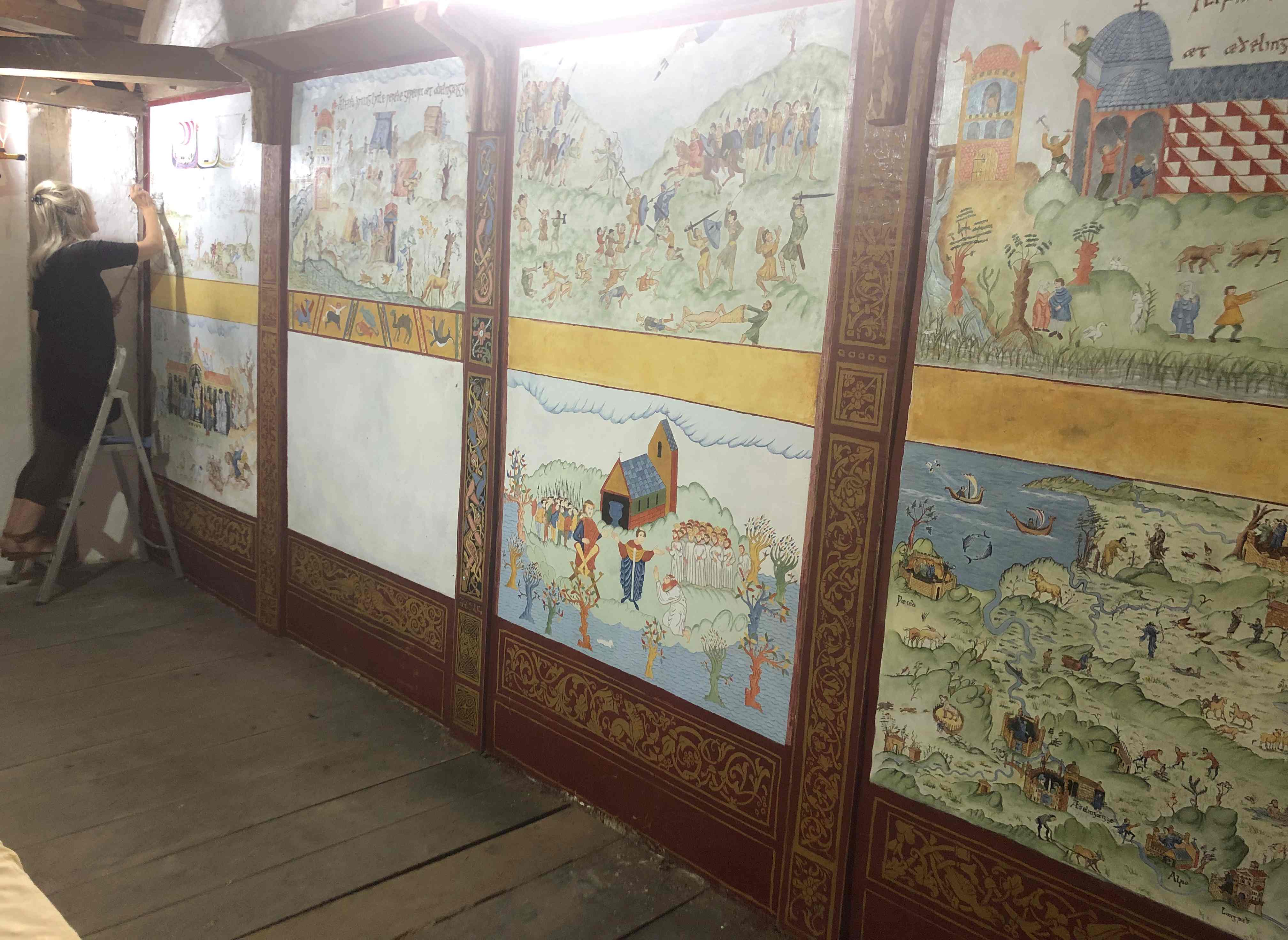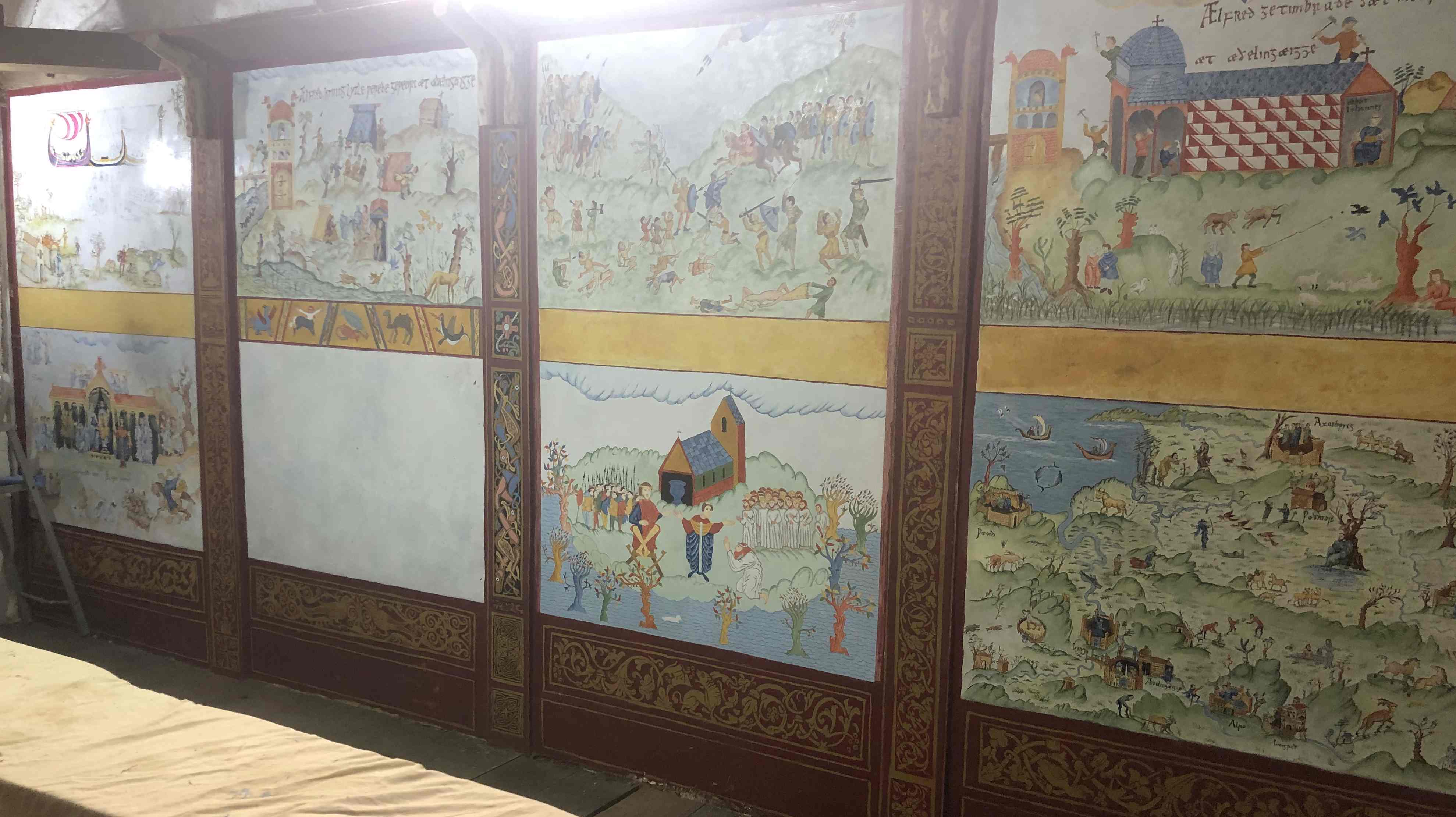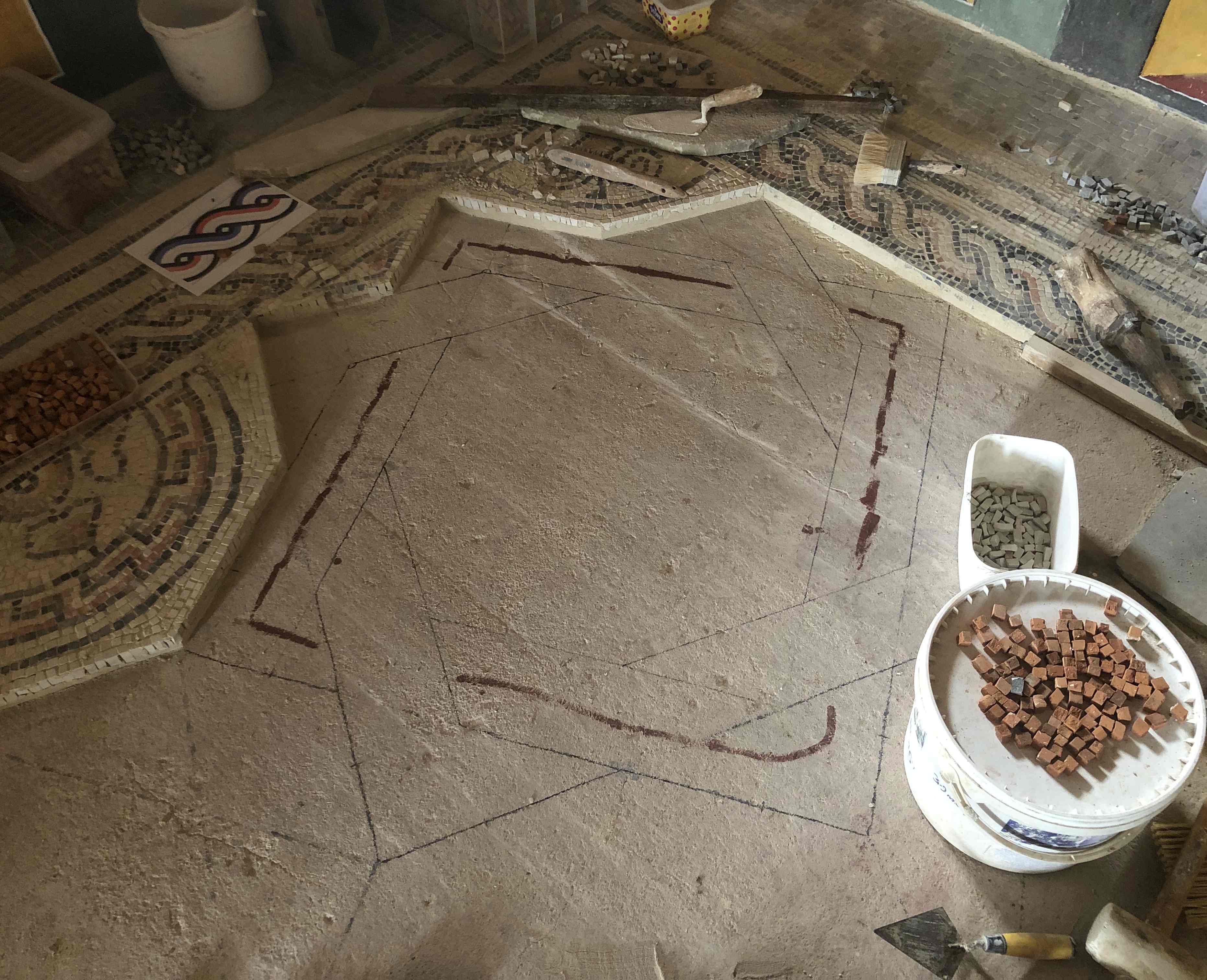 Work continues on our two long term projects, the Roman mosaic floor and the Saxon mural. The guilloche border has snaked itself around more than half the room and part of the pattern of interlocking squares has been drawn out – based on the Hurcot villa mosaic. Four of the eight panels in the mural are finished and three others are progressing well, all thanks to the six volunteers of the Saxon Art Club. Meanwhile the wider site has been cleared, ready for the landscaping work to begin. Great work by all the volunteers, as ever.