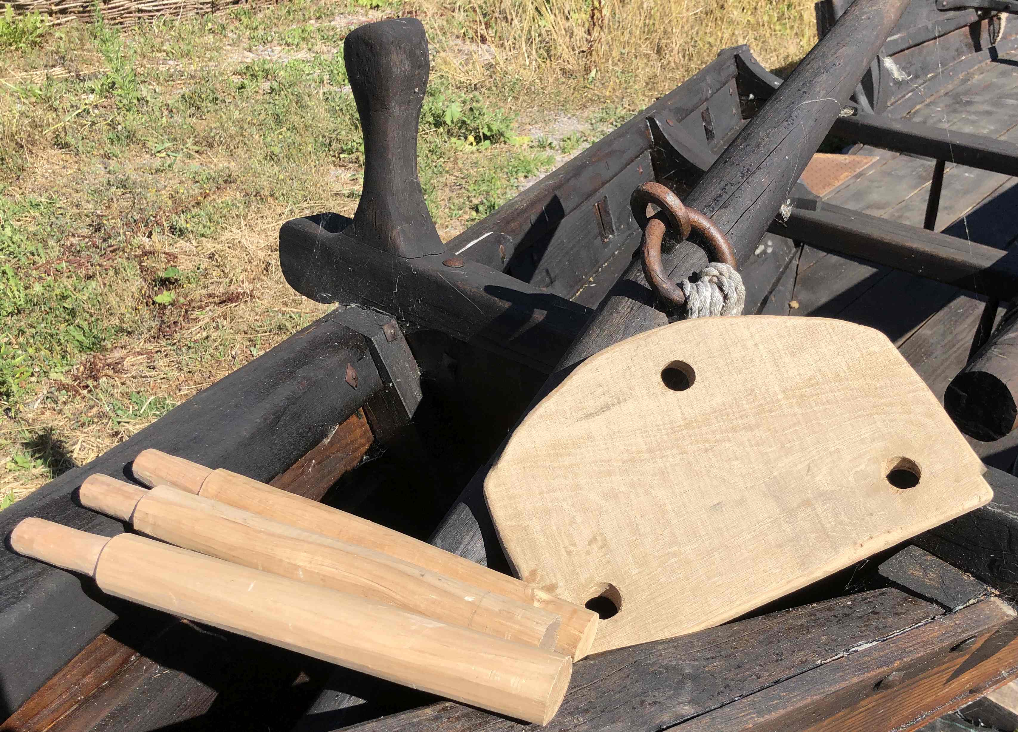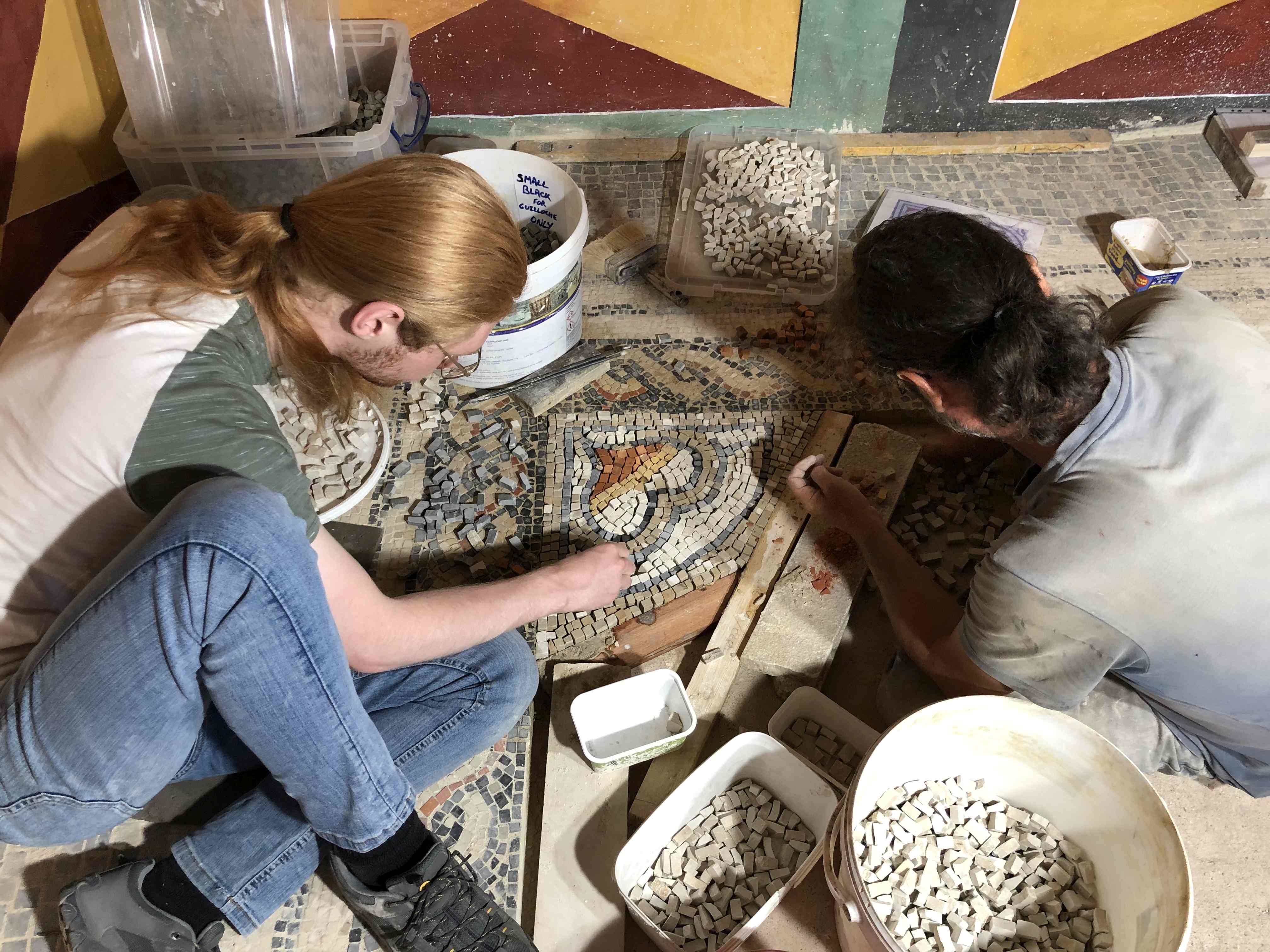 Fortunately this title refers to the ongoing work making furniture for the longhall and not to anything more unsavoury. To complement the Oseberg inspired bed and accompanying side table, a 3 legged stool is being made, based on an 11th century find from Lund in Sweden. Similar stools are known from waterlogged deposits in Viking age York. Meanwhile in the Roman building the mosaic has turned another corner.