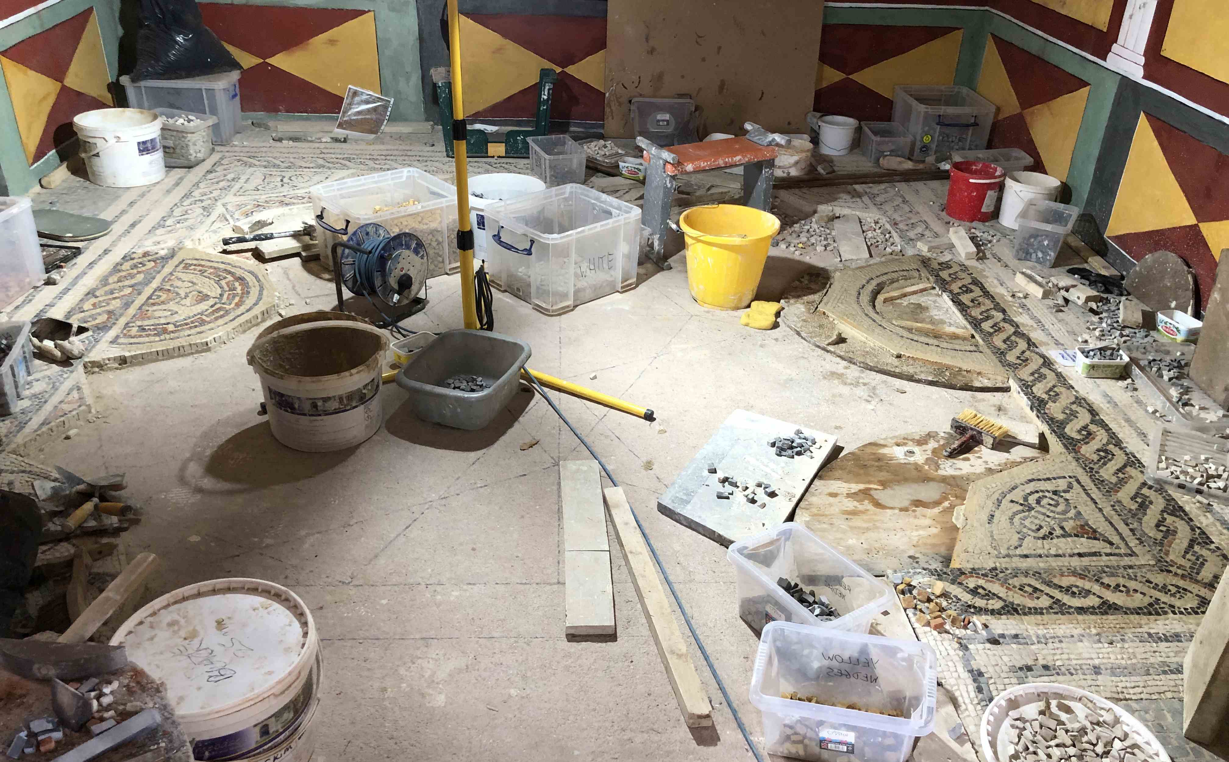 Work on the mosaic continues, gradually working from the outside inwards, contrary to percieved wisdom. It seems to be going fine so far and has the advantage that you are working outwards from a firm edge on at least one side. Work has also started on the Roman furniture for the room, but that too will be a long job. More on that in a future post.