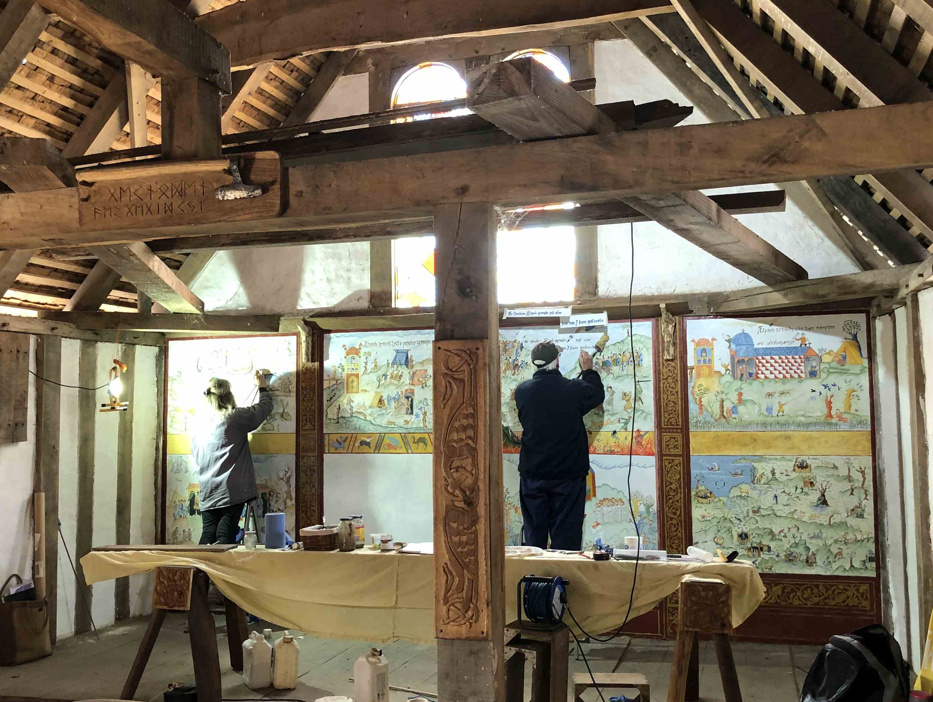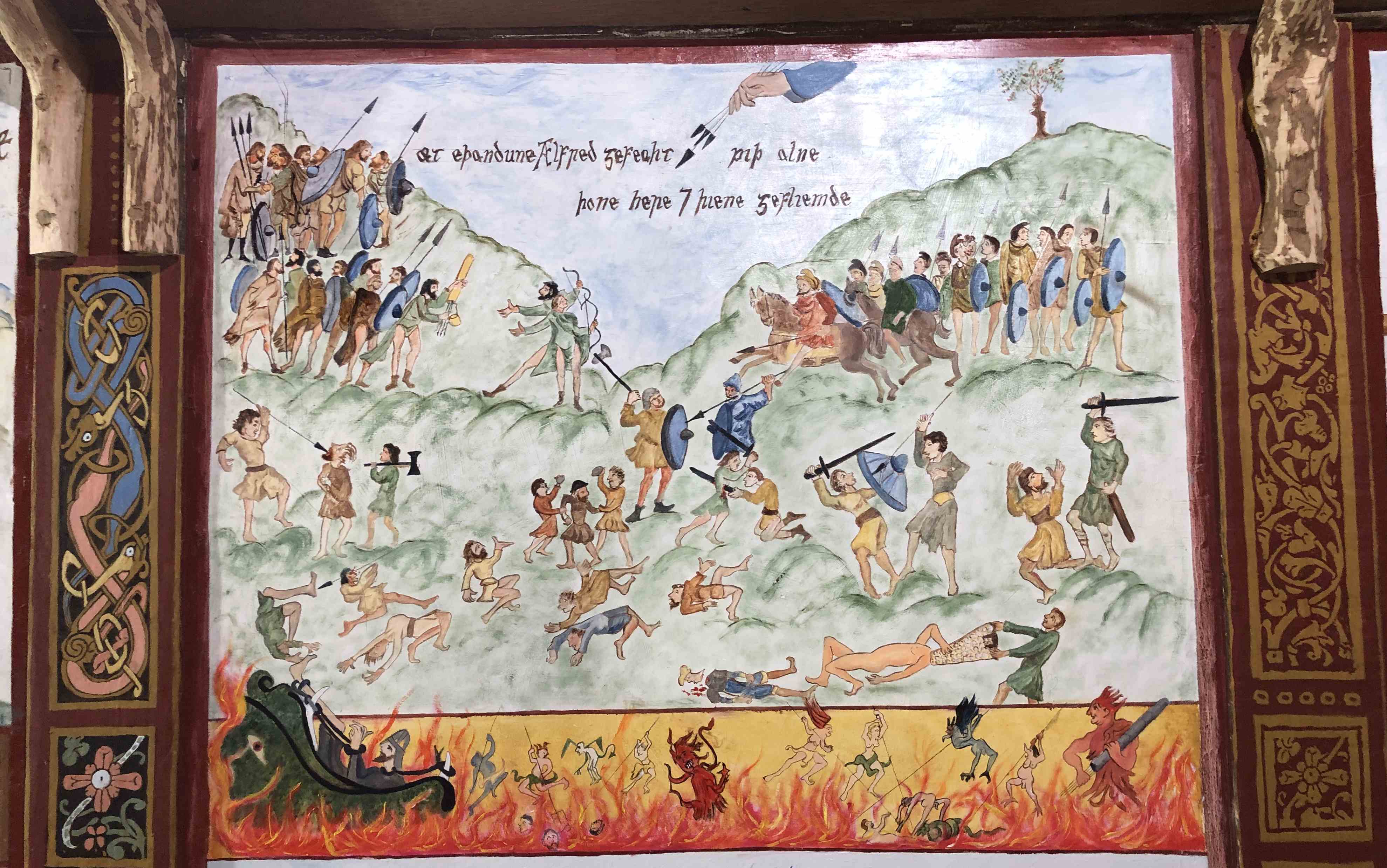 WARNING: The images below contain scenes of nudity, arson, violence, demons at work and sheep. The Vikings have begun to appear from the mists of time in the mural in the Saxon longhall. Spoiler alert – it doesn’t end well for them. They are soon to come a cropper against King Alfred at the battle of Edington (Wiltshire not Somerset sadly). The deceased Vikings would no doubt picture themselves going for a knees up with Odin in Valhalla, but as the mural is Saxon propoganda, it depicts them falling in to the mouth of hell, where a diverse collection of demons await them.