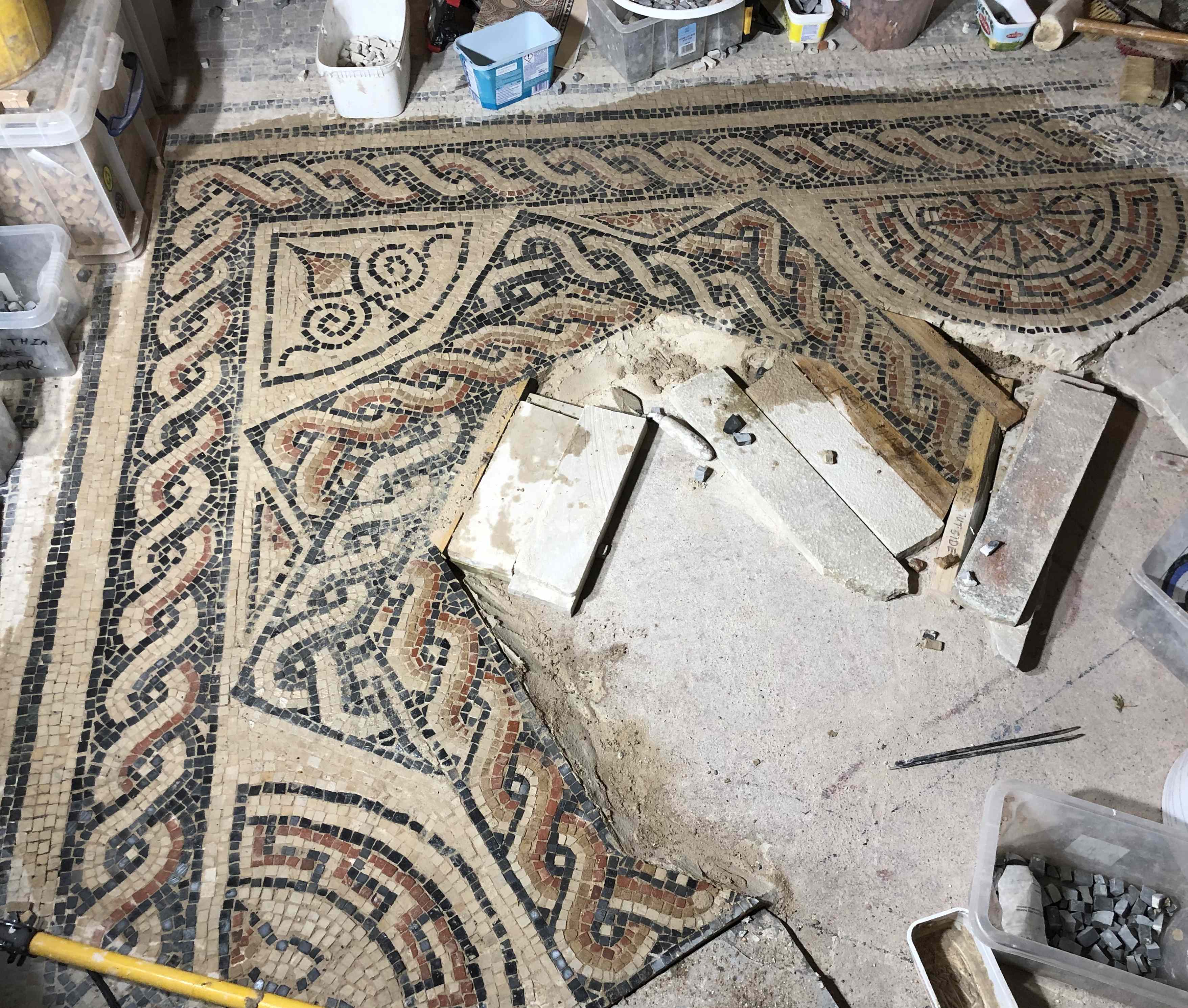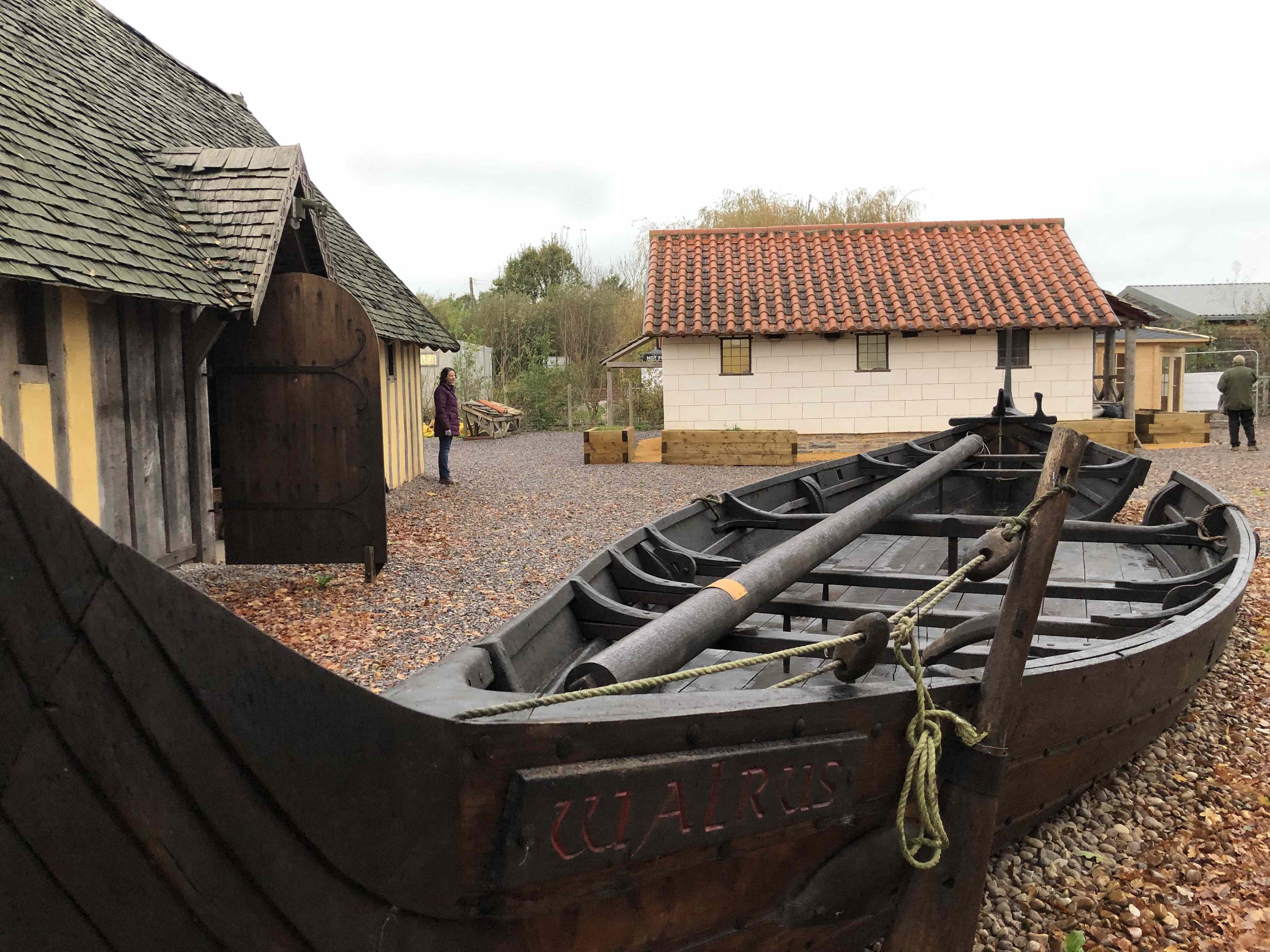 The annual battle with autumn kicked off last week with the clearance of leaves from the Walrus (our replica of the Skuldelev 3 Viking cargo ship). Elsewhere the roof of the Welcome Hut was finished, work began on the other two legs of the Roman table, more mural was painted and the mosaic floor crept relentlessly onwards.