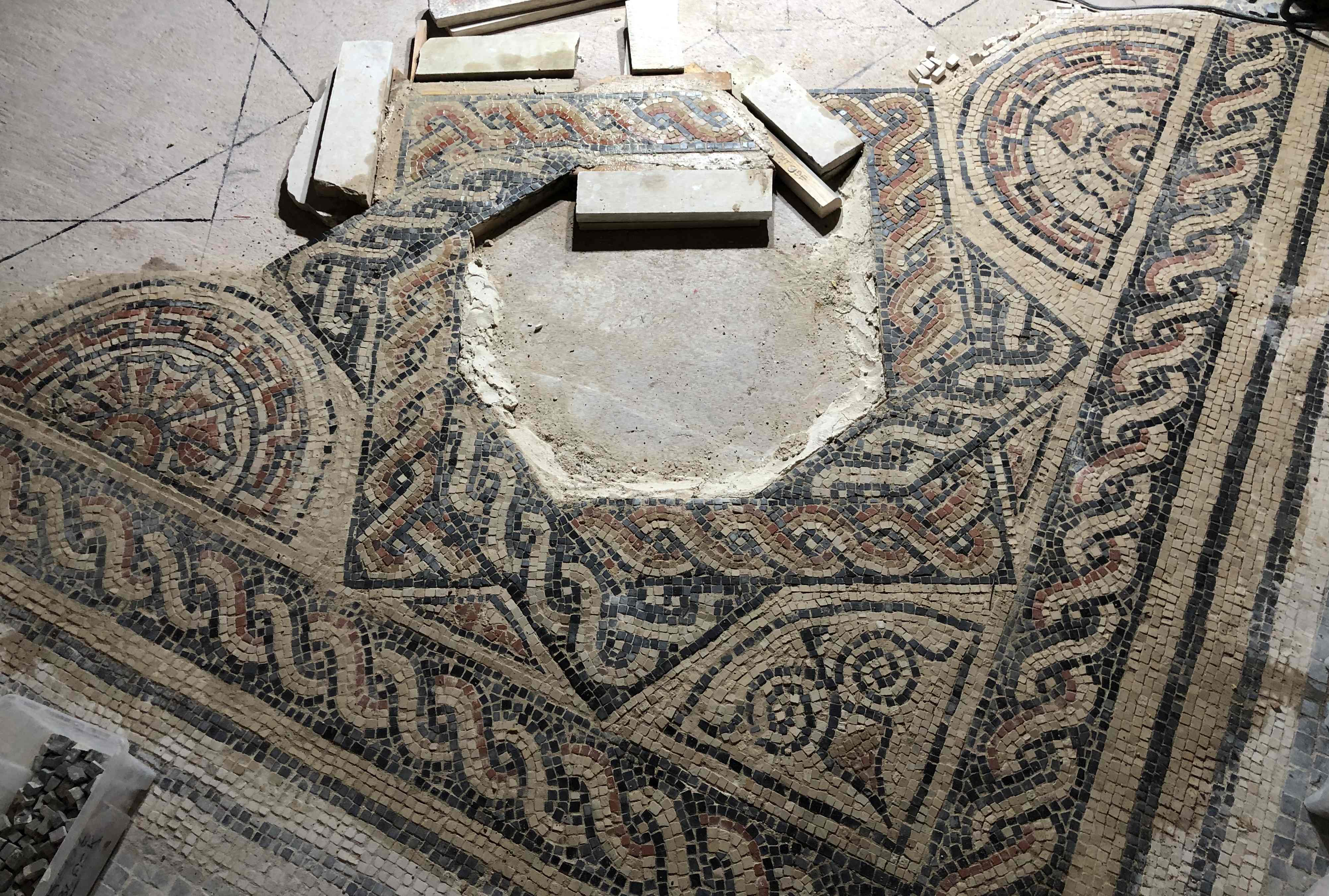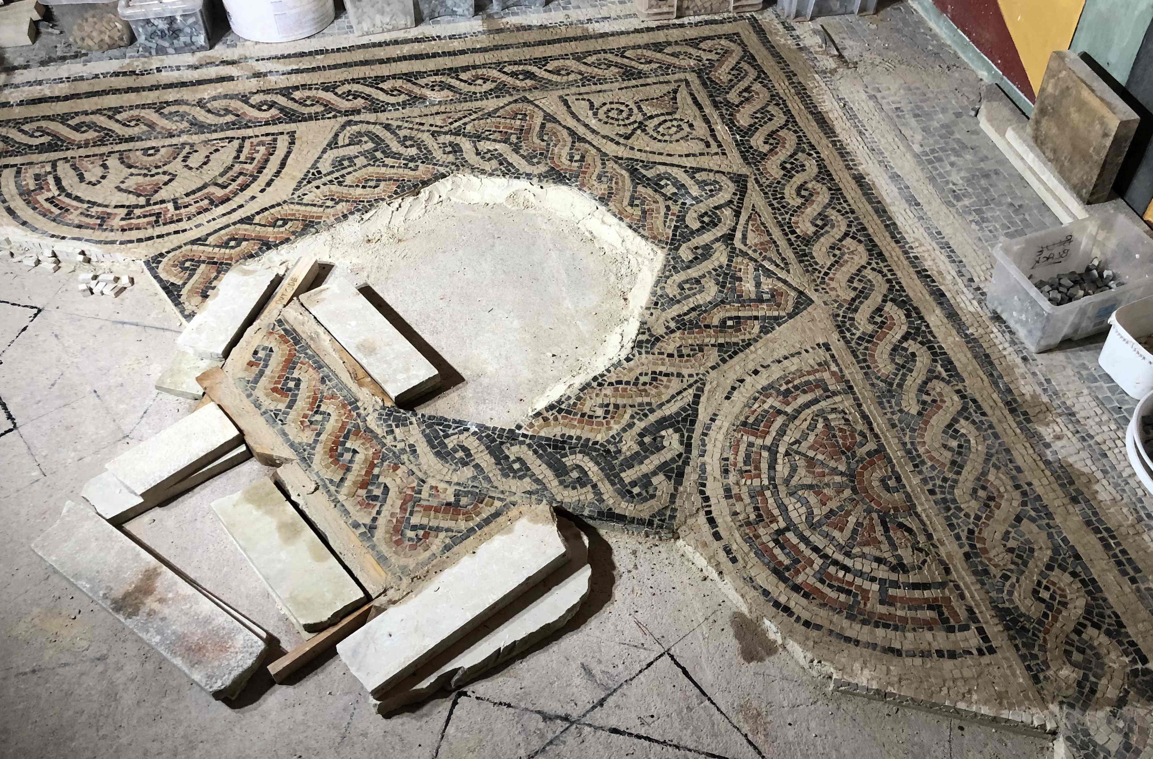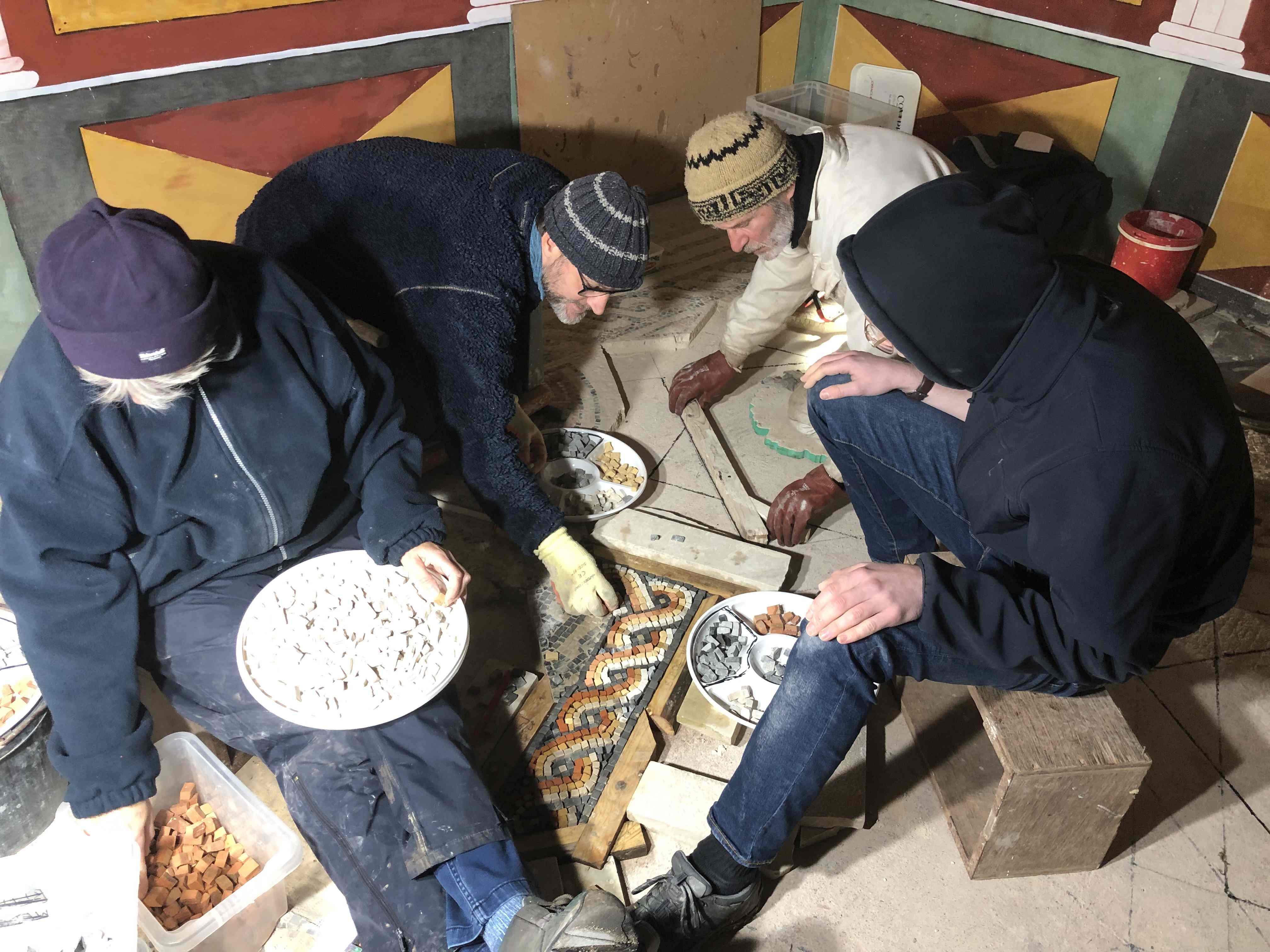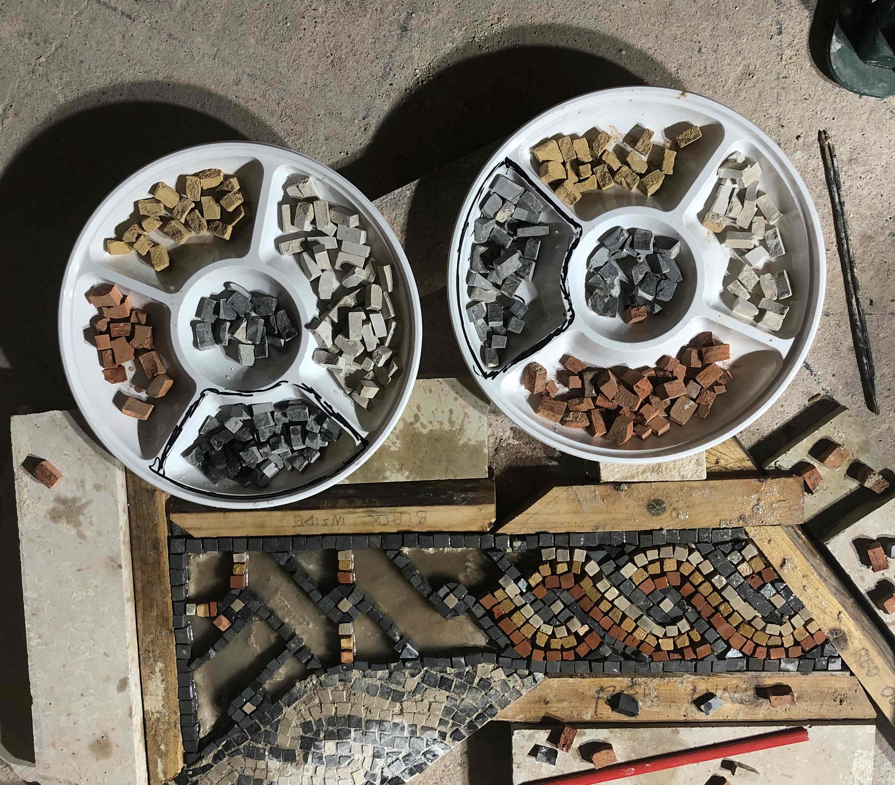Can you have too many mosaic development pics? I am beginning to think so, buit i am giving you some more anyway. Also one of the finished Roman table legs after oiling (linseed). The Lazy Susan’s from Proper Job are Martin’s brilliant idea for storing the different colous during the laying process