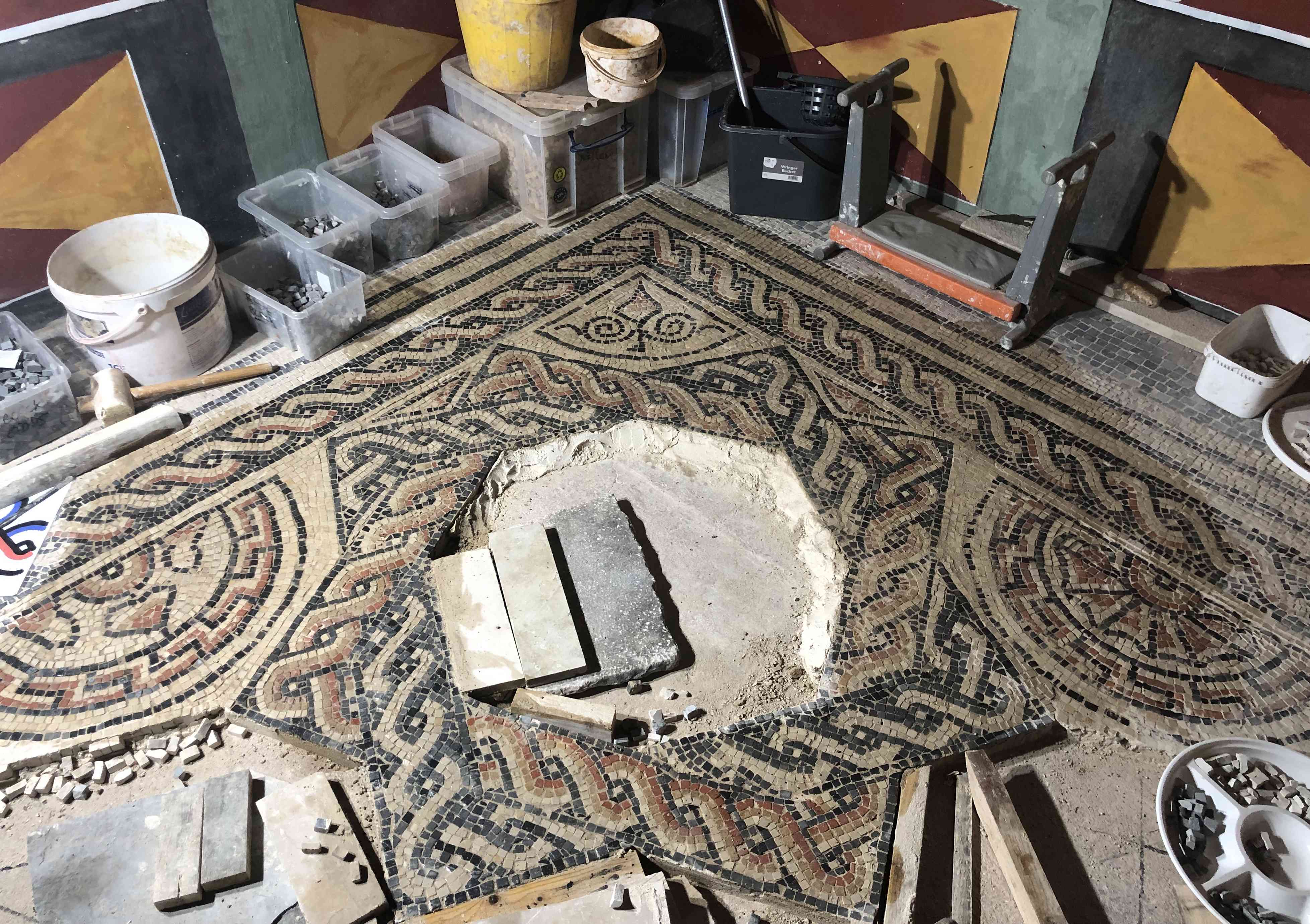 2023 began with a flurry of activity on site with the removal of the older hazel wattlework from the roundhouse porch and the lifting of the dias flooring in the longhall to allow a new supporting beam and ventilation to be inserted underneath. On the constructuve side of things work on the Roman tabletop and legs progressed well and the first pattern of interlocking squares in the mosaic were completed. Hazel posts were also split for later use as part of a cunning plan for the main gate.