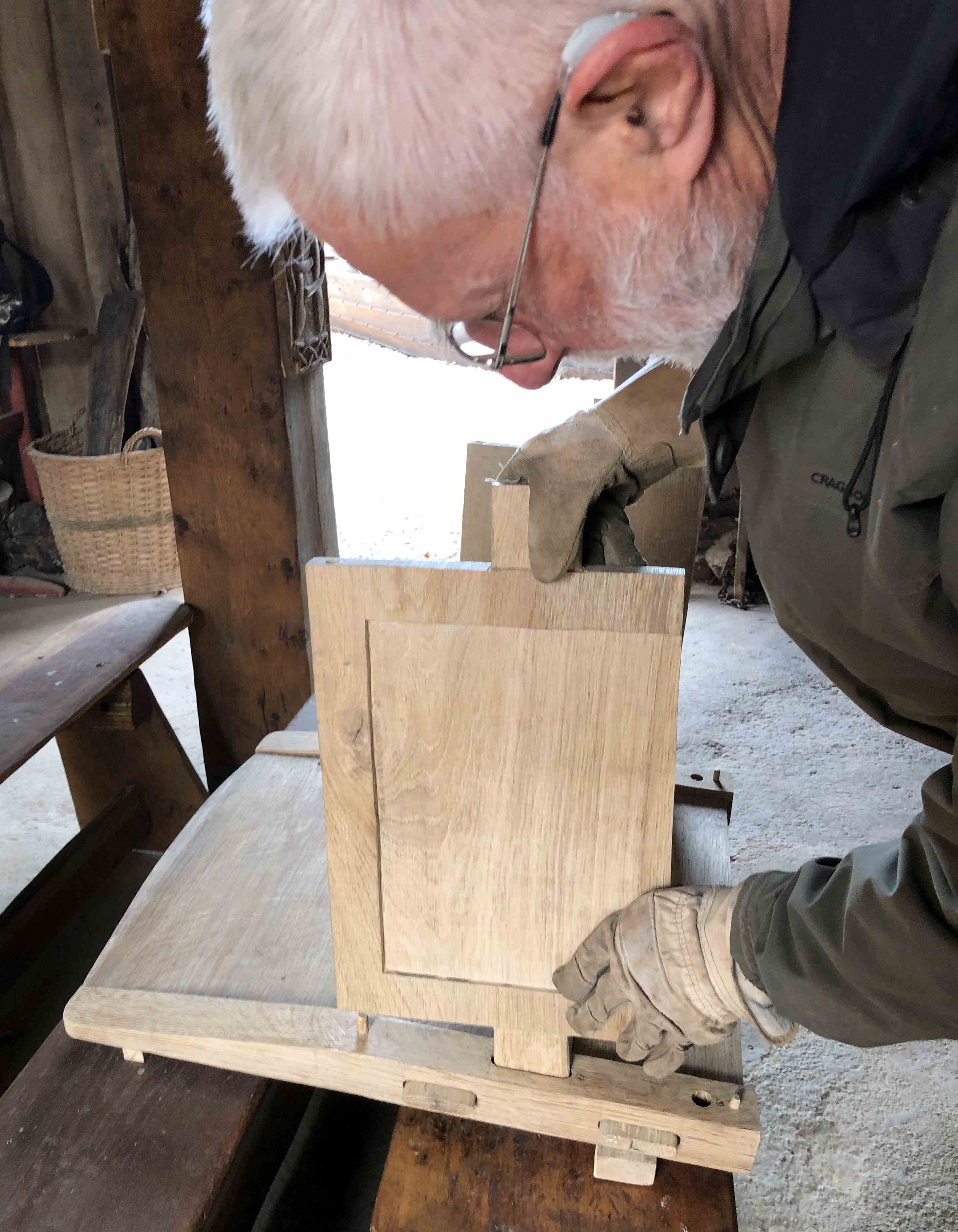 A busy week with the volunteers, with the dias floorboards relaid in the longhall, its gable end given a much needed new coat of limewash (with yellow ochre) and the palisade design on the front gate taking shape. Work continued on the Roman table legs and Mike brought in his new replica of the small chair from the Oseberg boat burial to add to the ‘Scandinavian’ themed furniture set in the bedroom. It will eventually have a woven rope top like the original and painted decoration (traces of the designs survived on the original). Some box (buxus sp.) topiary cones were added to the Roman herb beds and insde the building a gordian knot design finished off the first mosaic quarter of the main room to be completed.
