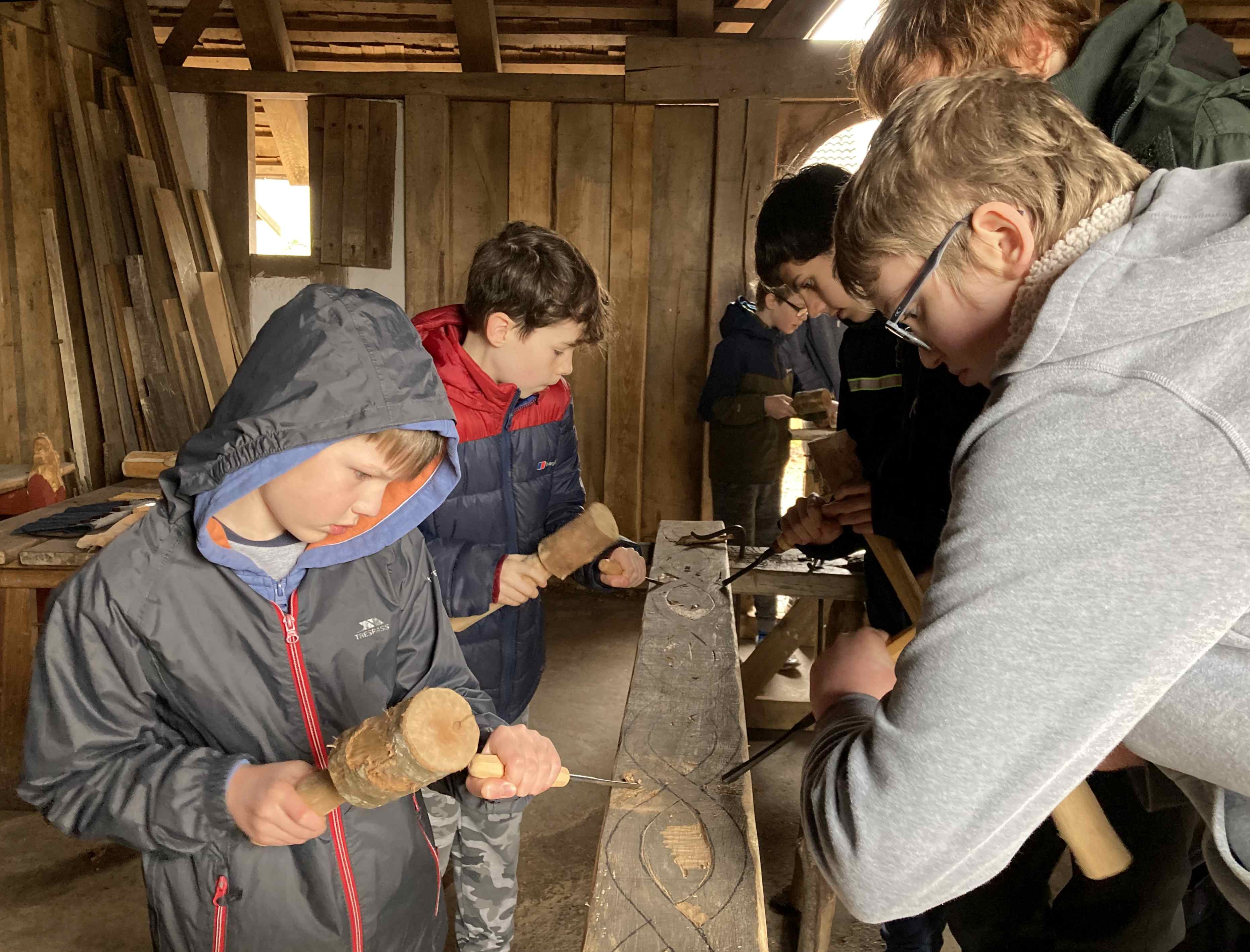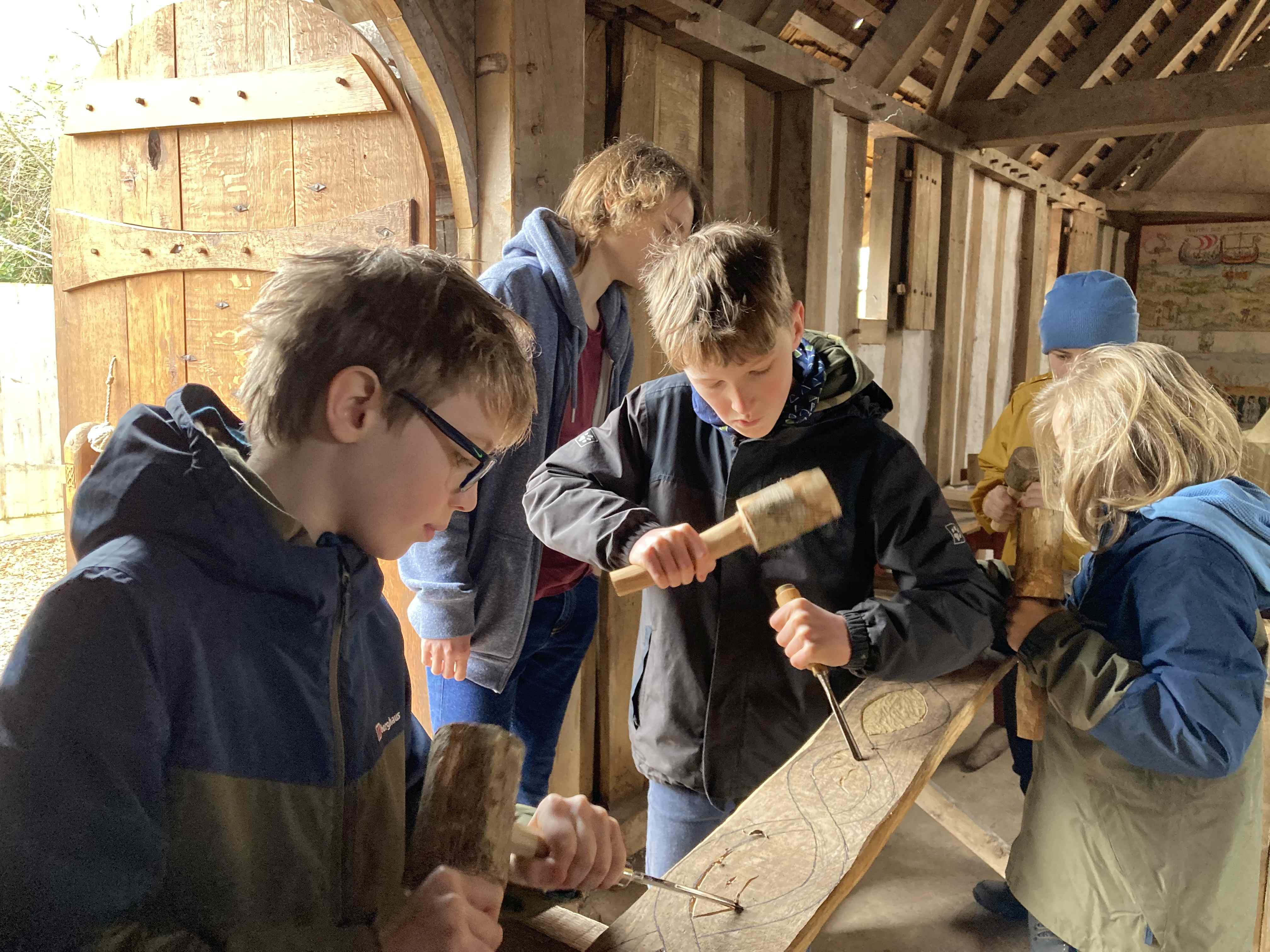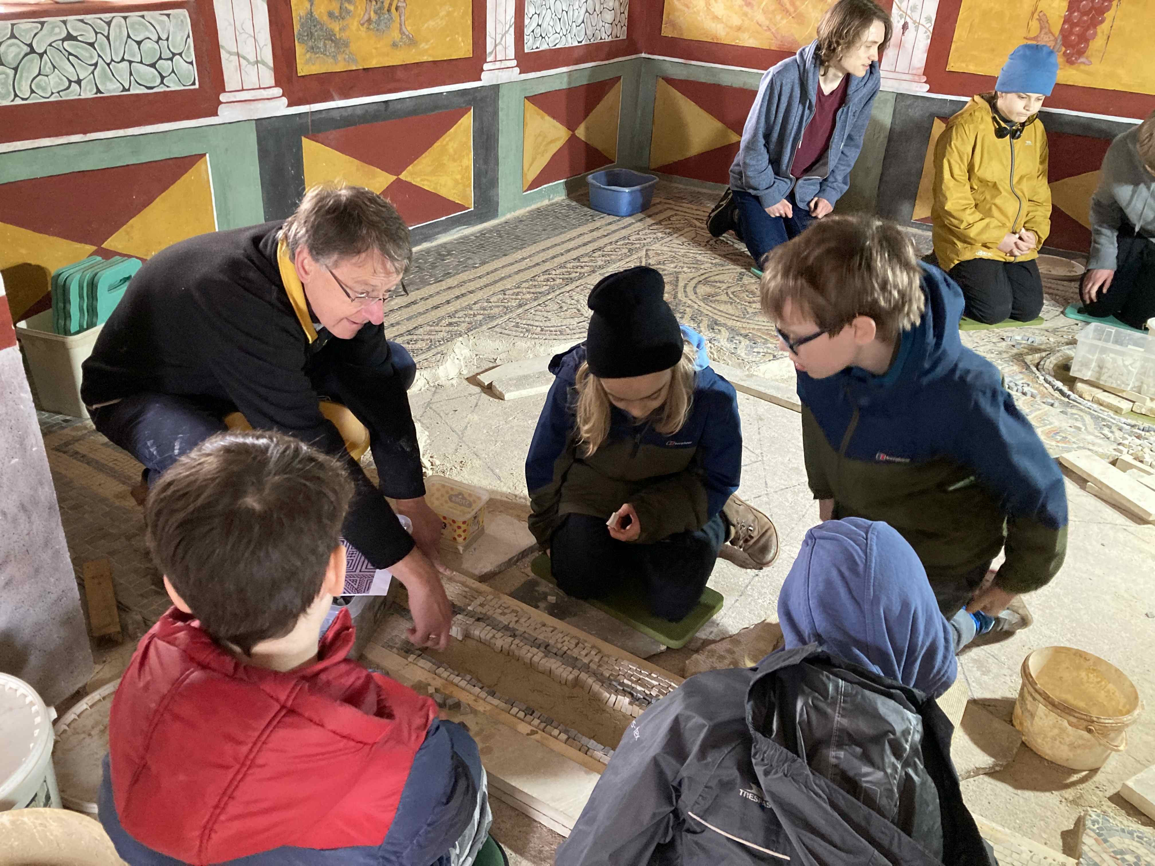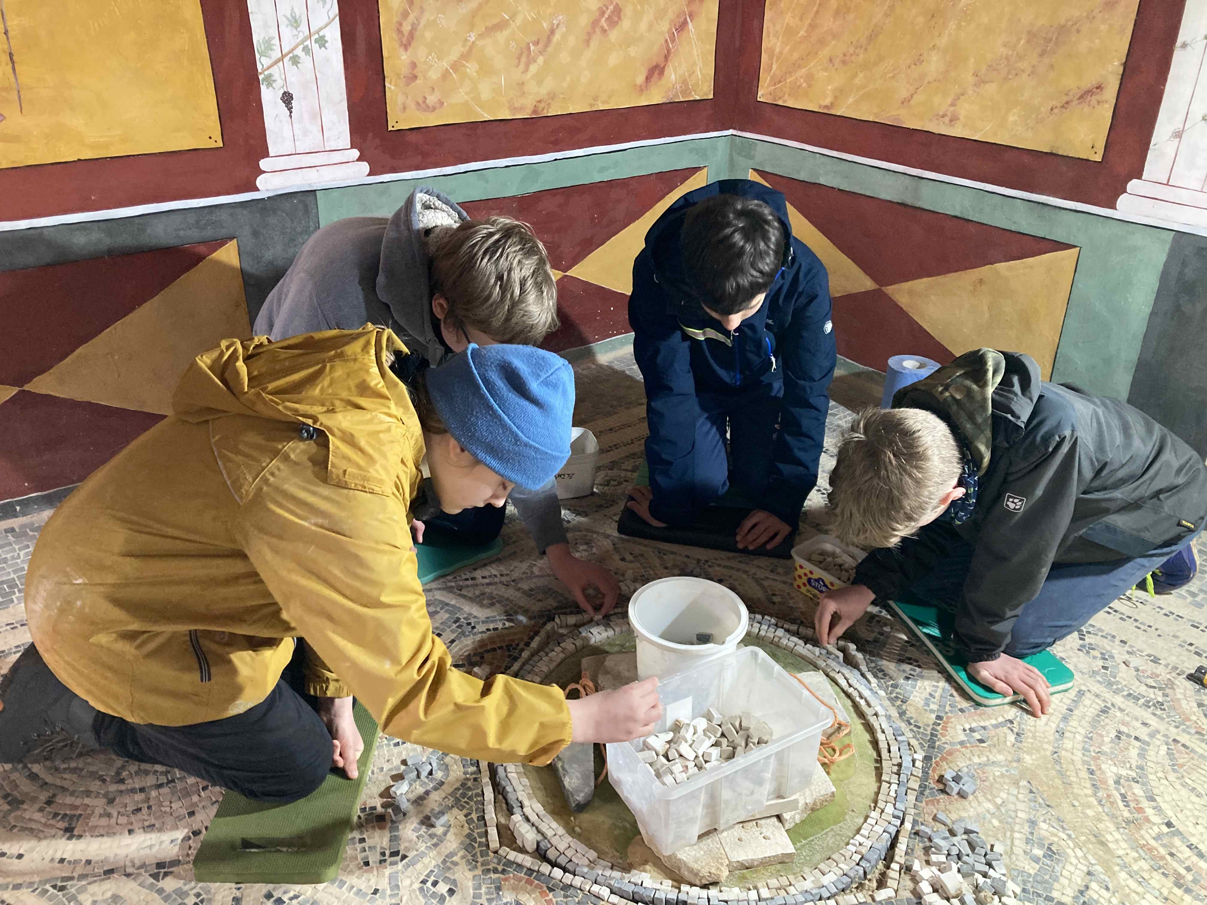 The wonderful and talented MAYAN young archaeologists have been on the site again, learning woodcarving and mosaic laying skills. Having earlier proved that children can make mosaic tesserae using a hammer and hardie as good as adults can, the MAYANS have now shown that they could have helped to lay the mosaic too. In the pictures below they did the bit inside the squares and linked up the black and white border (and no, its not meant to line up perfectly, thats how its designed). Another first for the Avalon Archaeology site, using experimental archaeology to prove the feasibility of child labour for this significant Roman industry. What should we get them to do next? Answers on a £20 note to the usual address.
