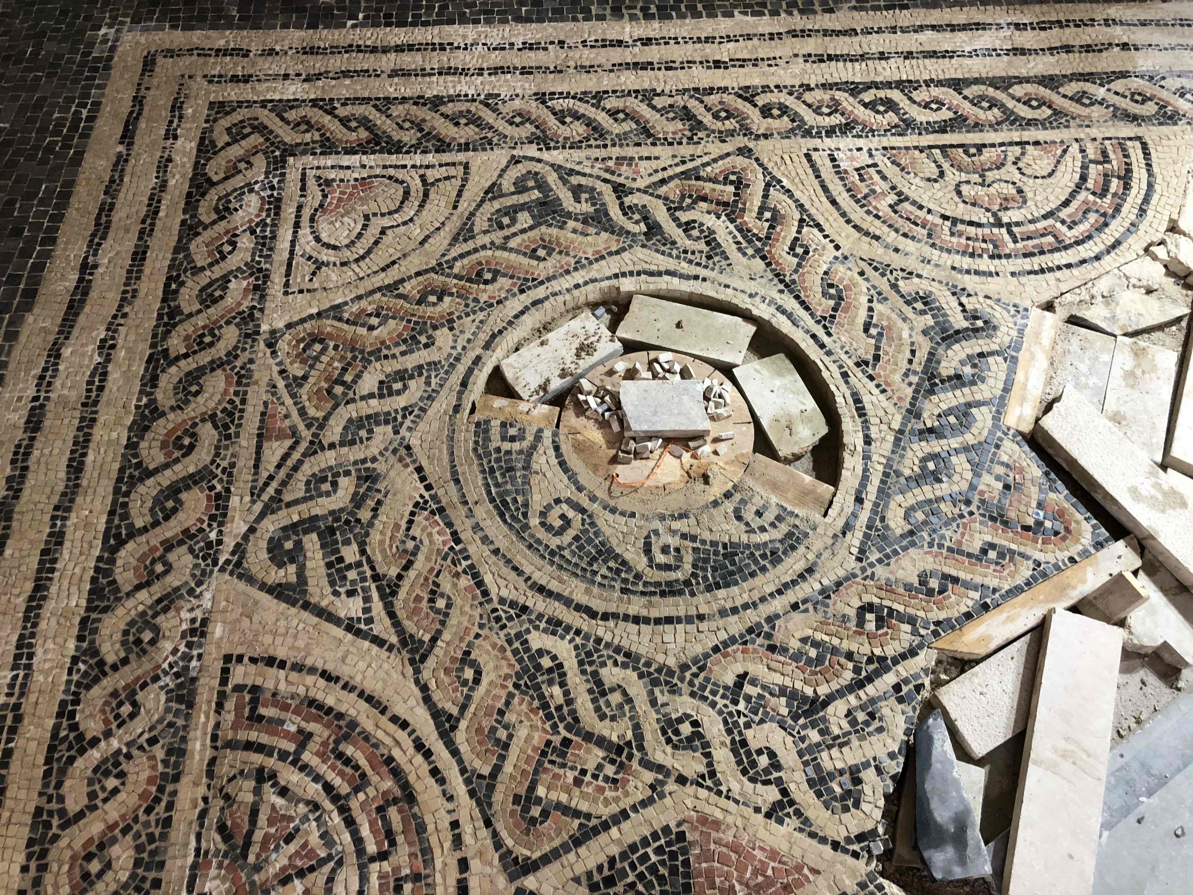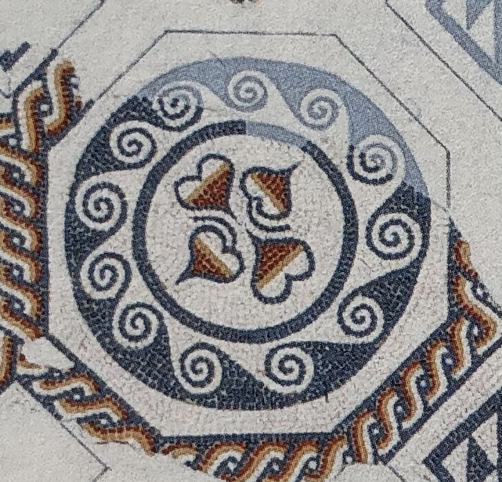 Work on the mosaic is going well with the guilloche border completed and miraculously the coloured strands matching up perfectly. Meanwhile, in the overlapping squares, a wave design is being created, based on a mosaic from Keynsham. The original is encouragingly random with lots of variation in the wave sizes if you look at it closely, suggesting that they didn’t bother to work out spacings beforehand. A ‘Friday afternoon’ mosaic perhaps?