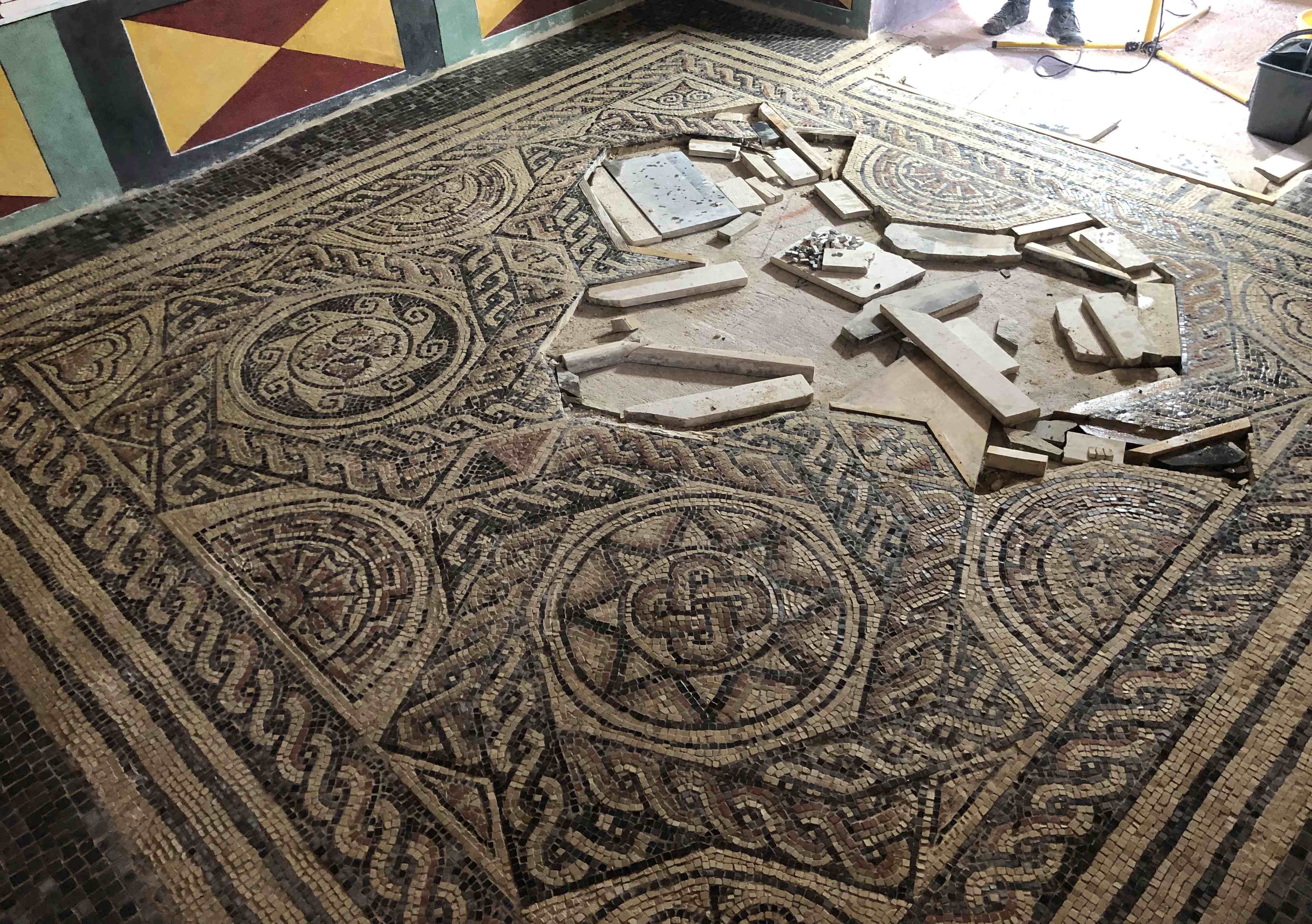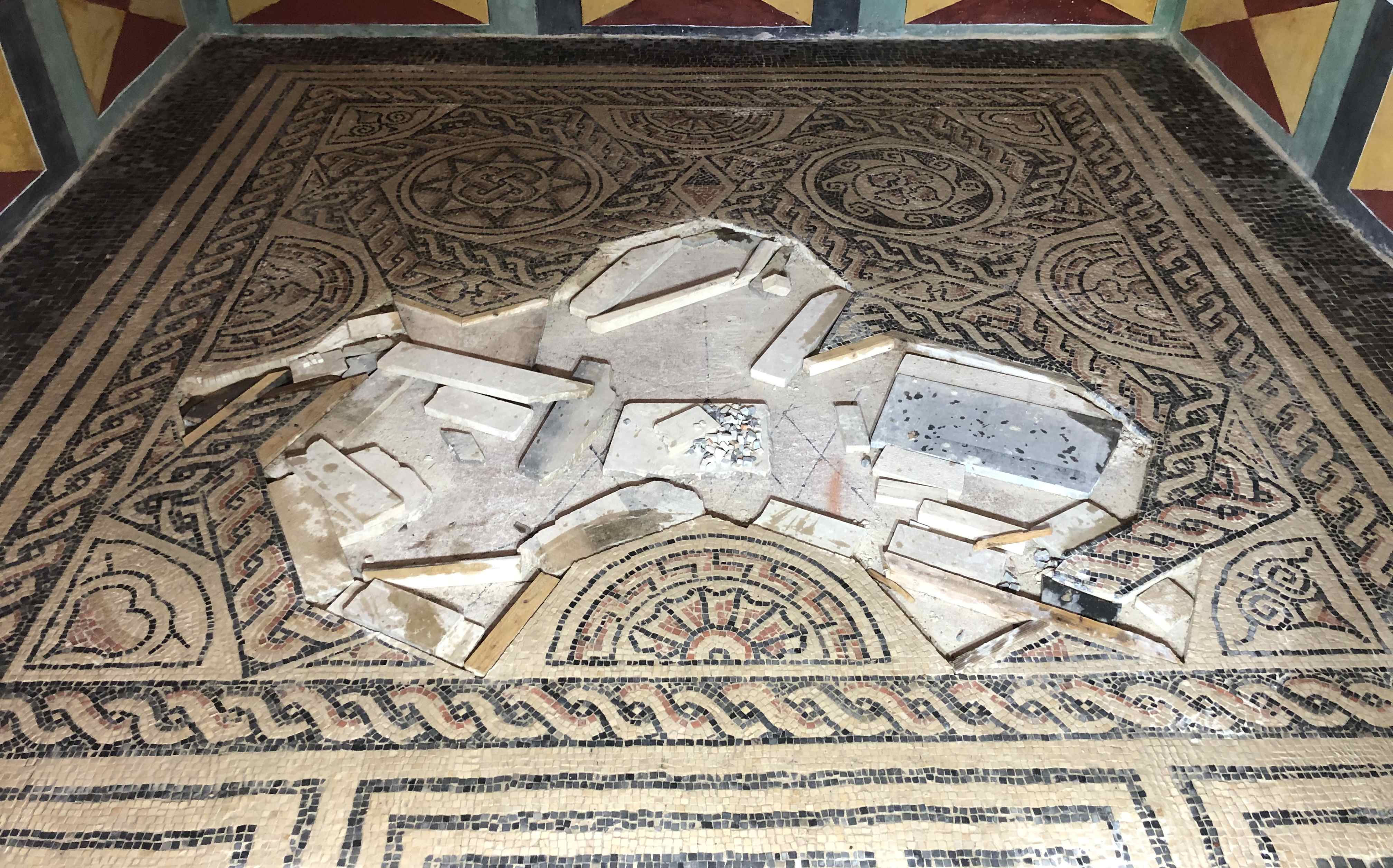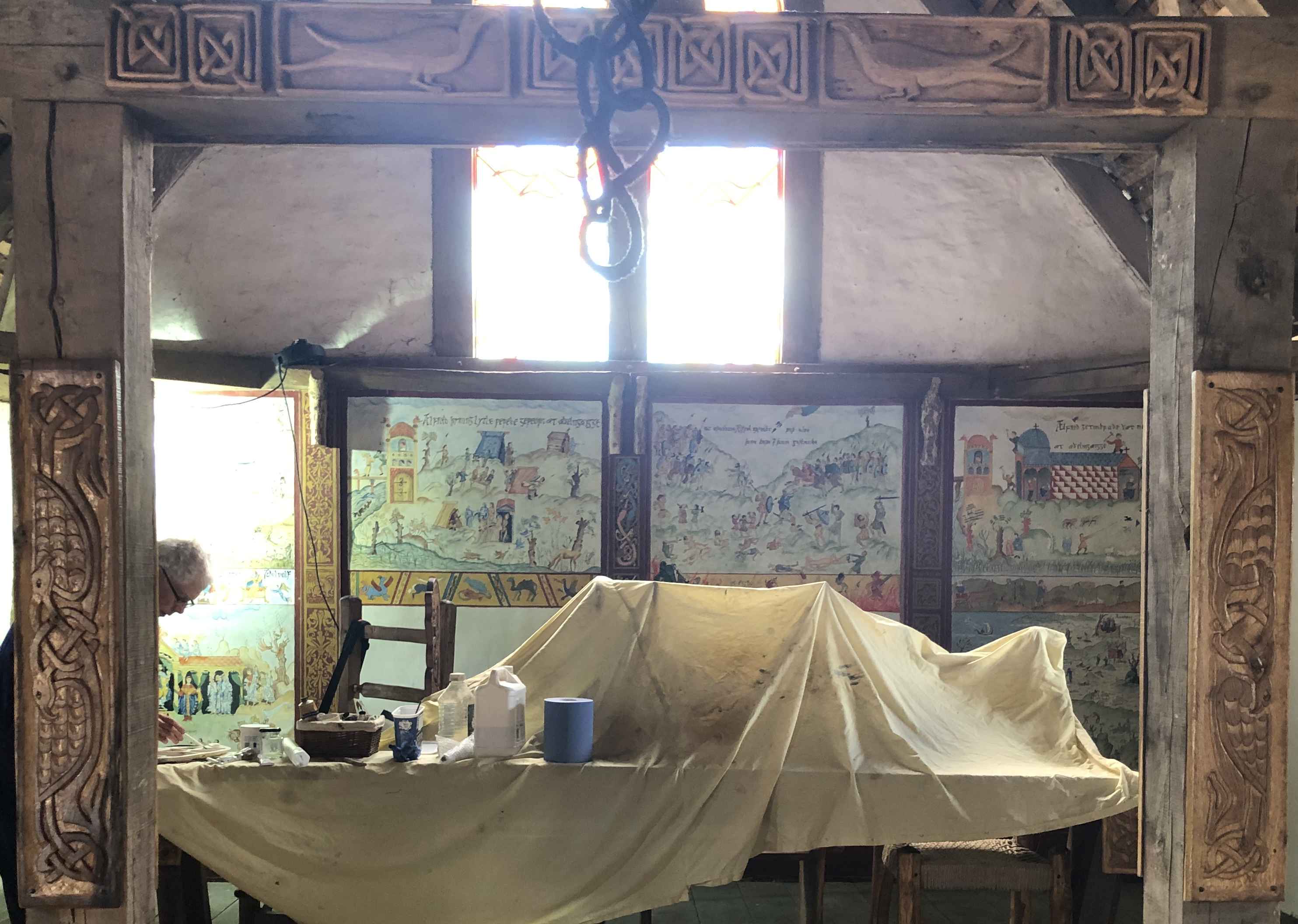 Other additions this week have been Kath’s double bird carving, which complements one on an opposing pillar and helps to complete a bird theme for the whole ‘arch’. Meanwhile in the Roman building the continued march of tesserae is (Roman) inching ever closer to final victory. Omnis laus tessellarii, as the Romans may have said (‘all praise the floor mosaicists’).