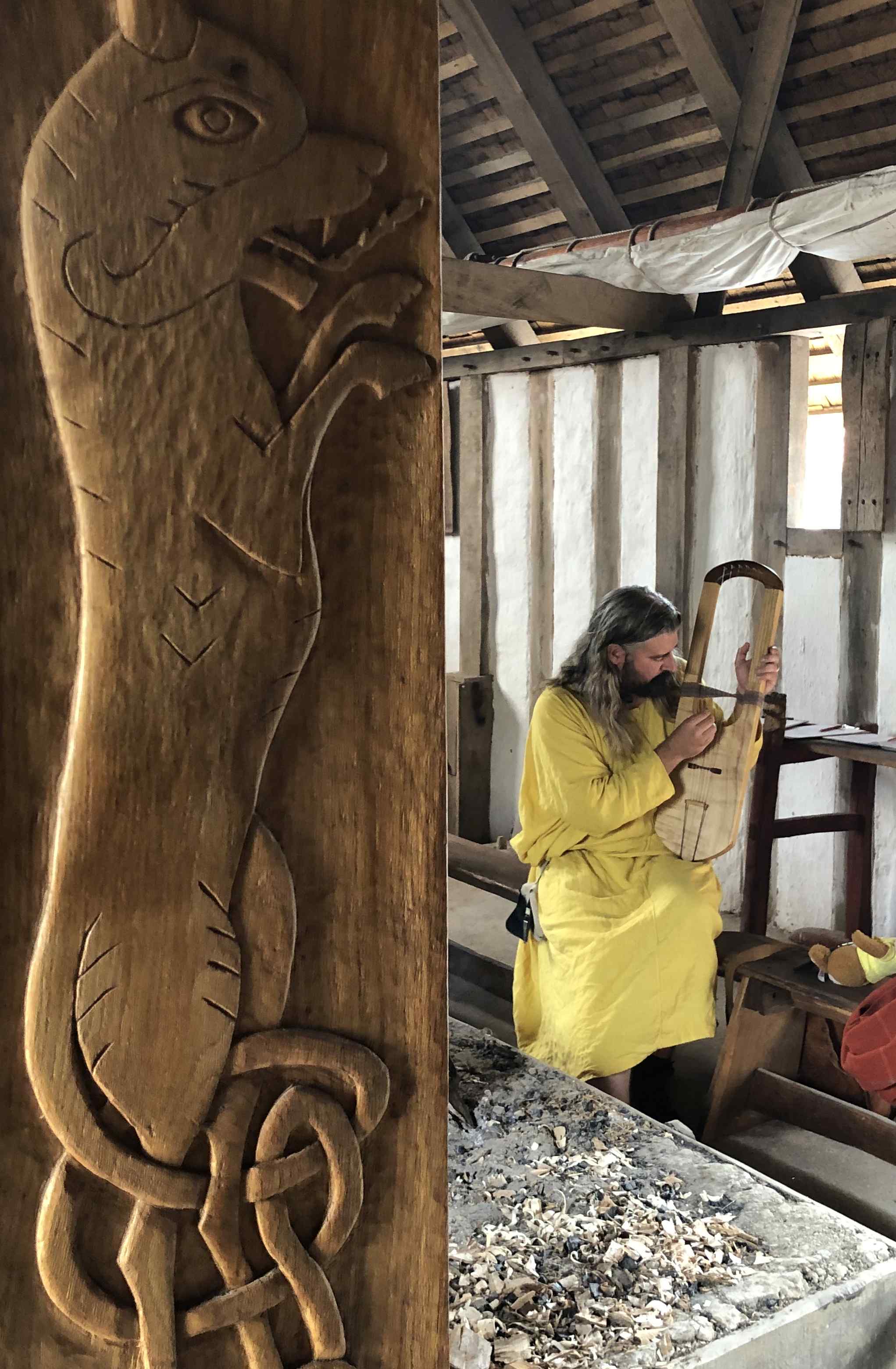On the last Sunday in August the Avalon Archaeology site had its first ‘Blast from the Past‘ ancient music day. Tim Hill very kindly brought his musical expertise to demonstrate the replica Iron Age carnyx and the Roman cornu. The carnyx was a war horn used in Britain, Ireland and Gaul, between c.300BC and AD200, but it may also taken part in other ritual activities, as shown on the Gundestrup cauldron. Our replica was based on an 1818 find from a bog at Deskford in Scotland. The cornu was used in the Roman army for passing on signals to the troops but is also pictured alongside the water organ (hydraulis) entertaining the crowd in the ampitheatre. It is depicted on some stone monuments such as Trajan’s Column and recently the mouthpiece of a cornu has been found at Vindolanda fort on Hadrian’s Wall. Another unexpected treat was provided by a well dressed lyre player who entertained the crowds in the longhall.