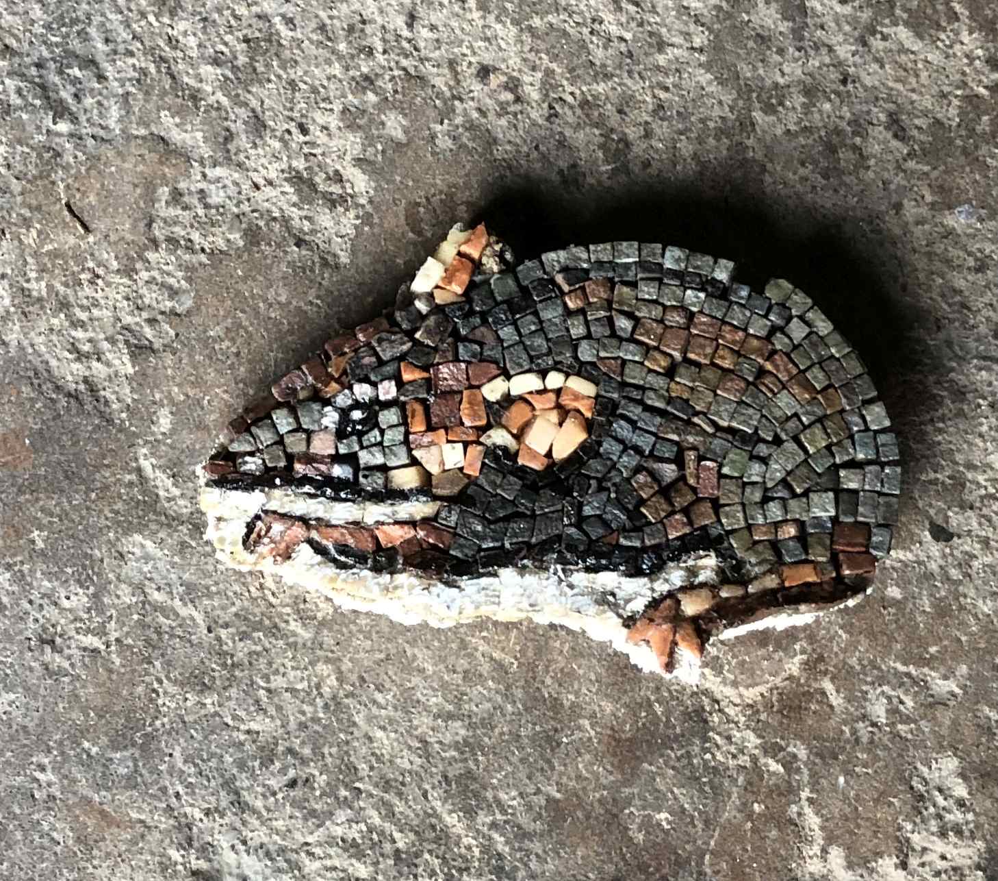 All the hard work on the mosaic is bearing fruit as the main room is virtually complete. All that is left is the centre circle, where an ambitious attempt to recreate an ‘unswept floor’ mosaic is being attempted. This involves using very small tesserae, only 2mm or 3mm square, to create realistic images of food scraps. The work has begun with Richard creating a mouse (tail yet to be added). The remainder of the mosaic will gradually expand into the gap between the two rooms, where the highlight will be a recreation of a Dolphin mosaic from Lopen villa (Somerset).