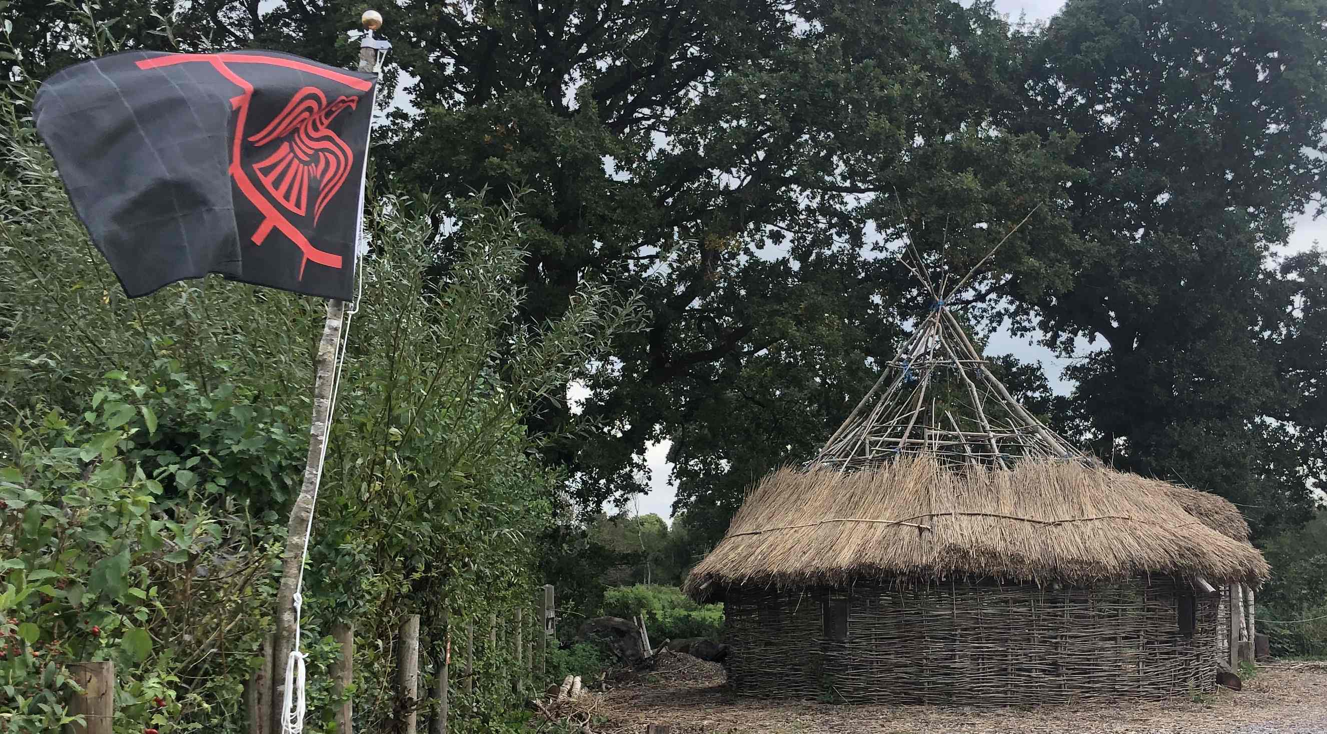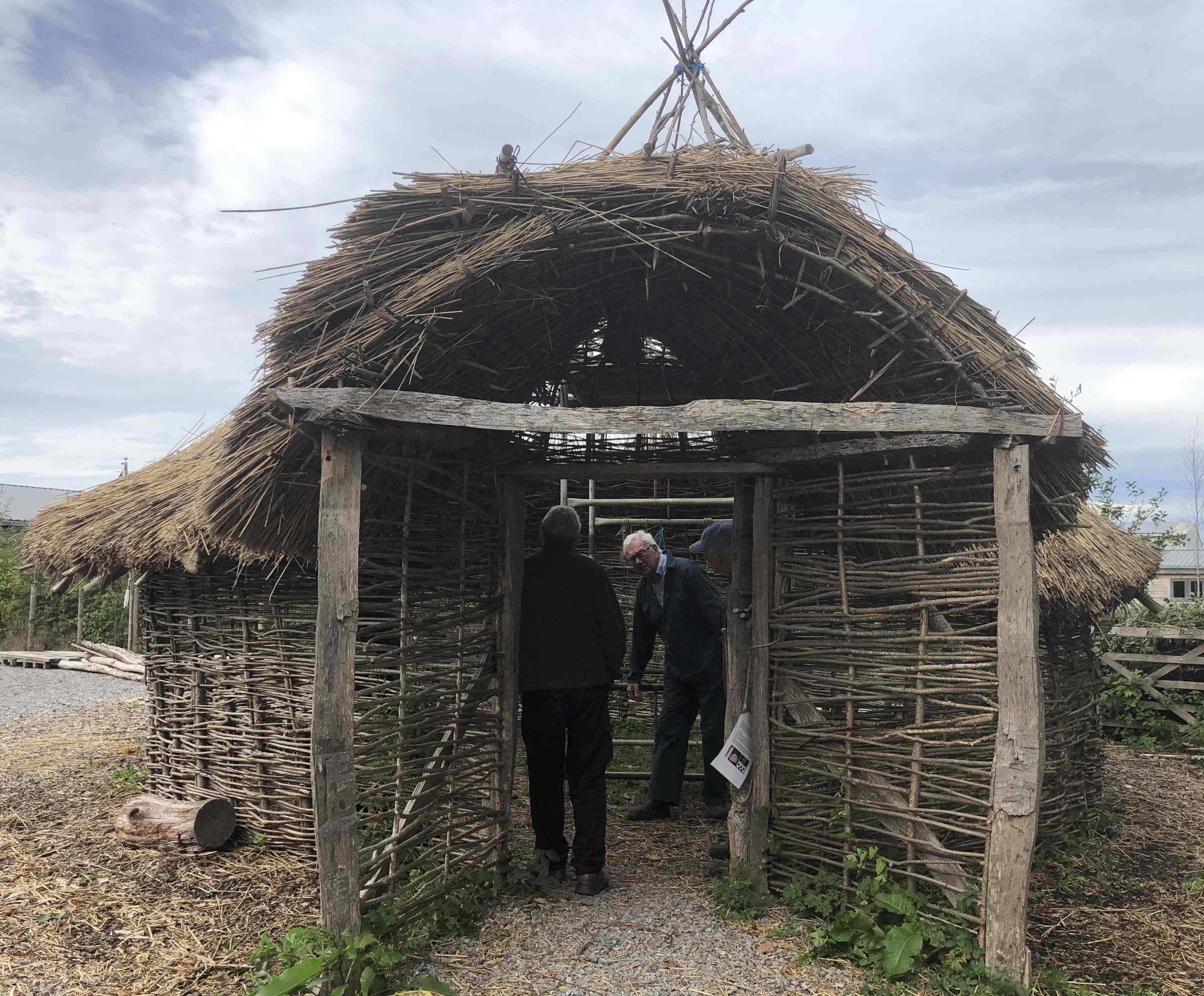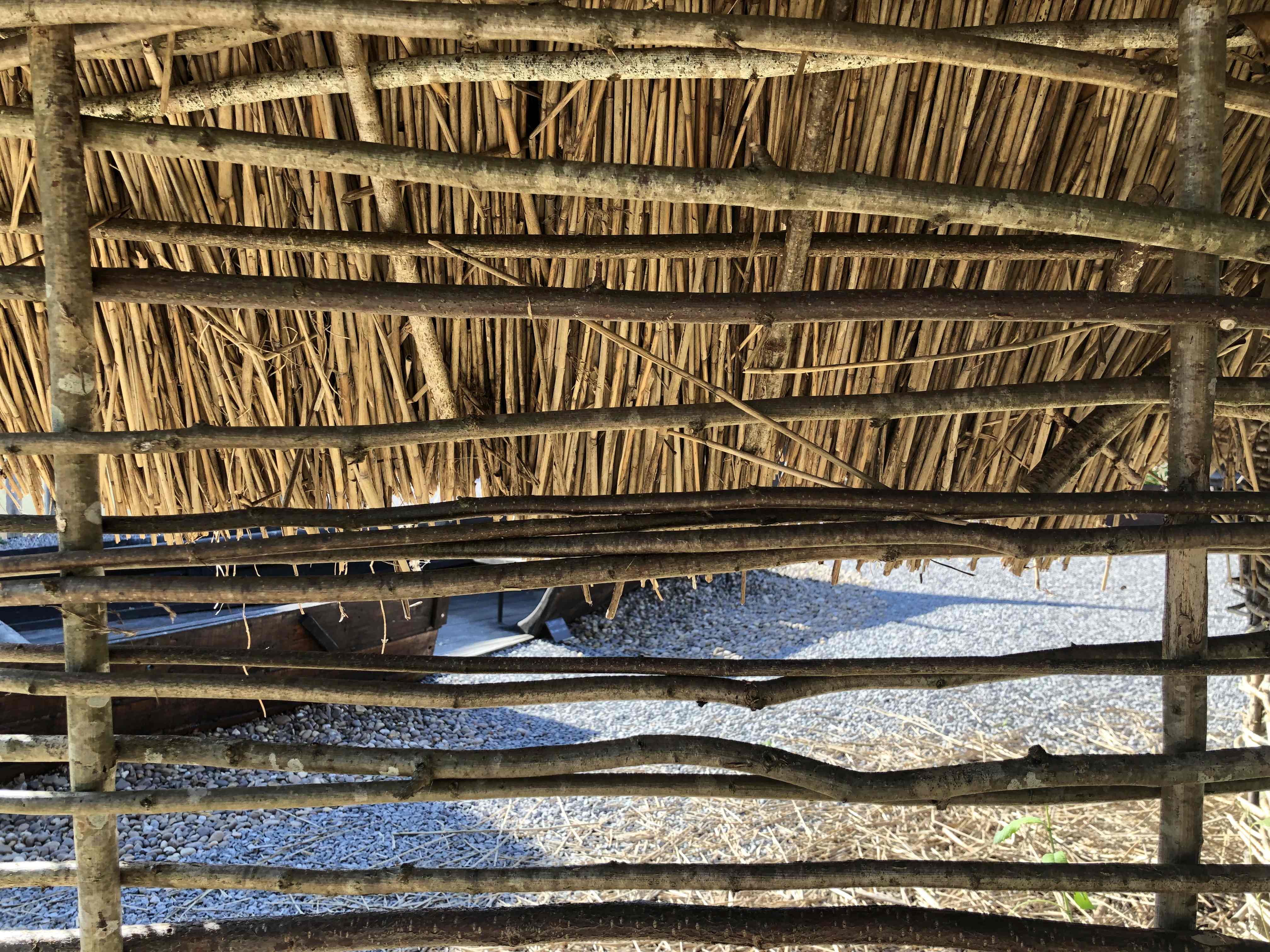 The last of the old stock of water reed has now been used up on the lowest eave level of the Iron Age roundhouse. Soon we will be able to cut more hazel to finish the roof framework and make more twisted, quarter split, hazel staples or ‘spars’ to help secure the lateral bars that hold down the reed. The interim measure of using willow bark has so far proved to be a successful experiment, but it is uncertain if it will last over the longer term. The reed is patted into line using a wooden bat called a legget. The curved porch was an interesting challenge for us thatching novices. We used a deeper thatch on the side of the prevailing (SW) wind. The doorway faces SE.