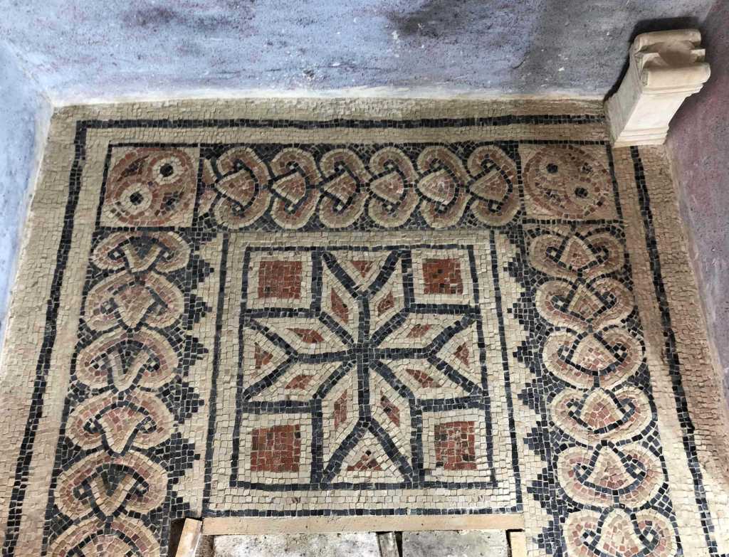 The Romans liked to put eye deceiving images in both frescoes and mosaics. Our first example in the mosaic floor is this image based on one from the Newton St Loe villa, Somerset. Do you see a flower or four converging cubes, or, if you really look for them, four converging Toblerone shapes? Other chocolate and nut based confectionary are available. Answers on a £20 note to the usual address.