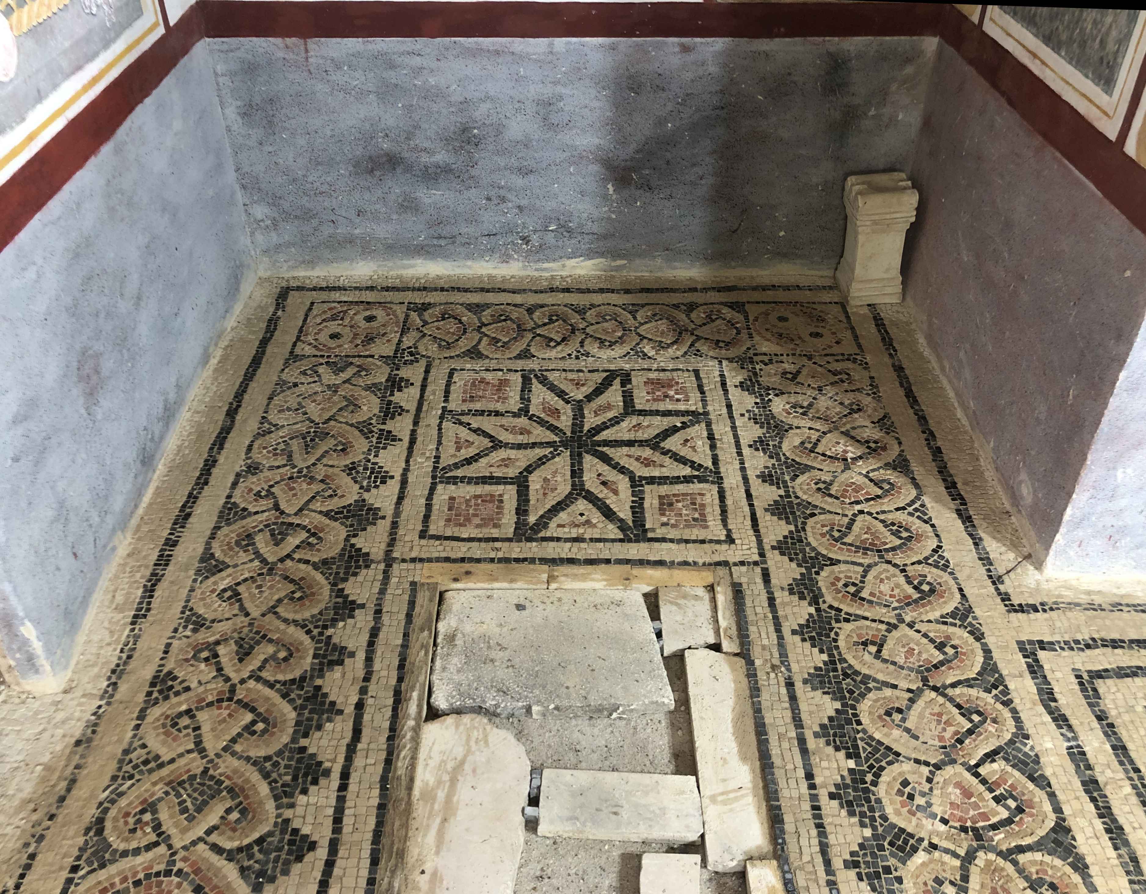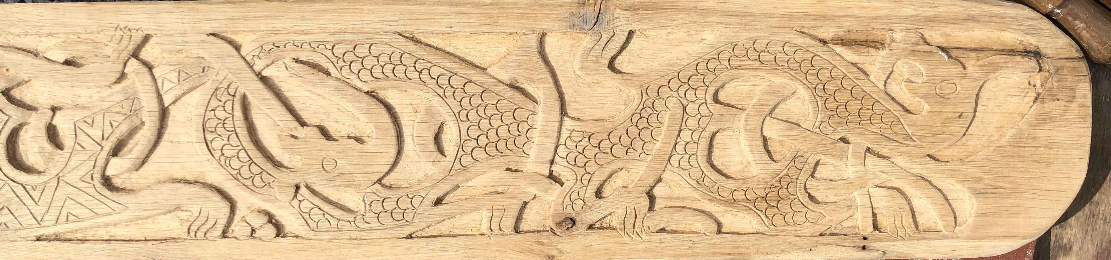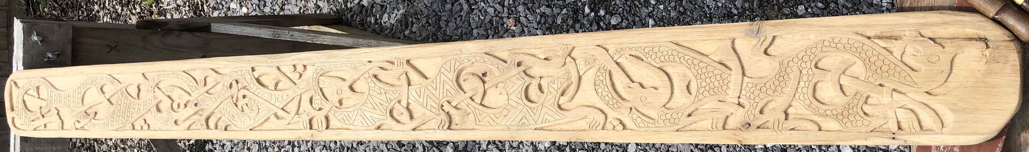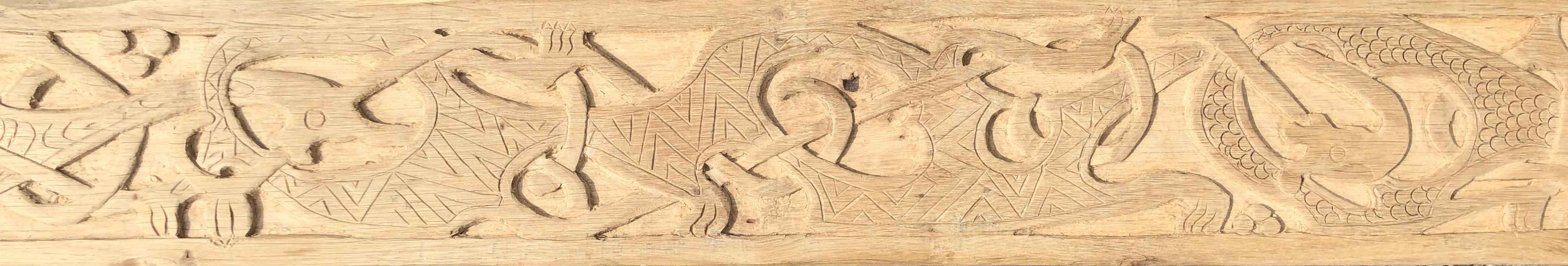 Kath is nearing completion of her carving based on designs from the prow of the Oseberg boat burial. It will eventually go on a beam above our replica of the bed from the same site, after colour has been added. Meanwhile in the Roman building the borders have been prepared for the next design, cryptically referred to amongst the tessellarii as the ‘Jester’s hat’.