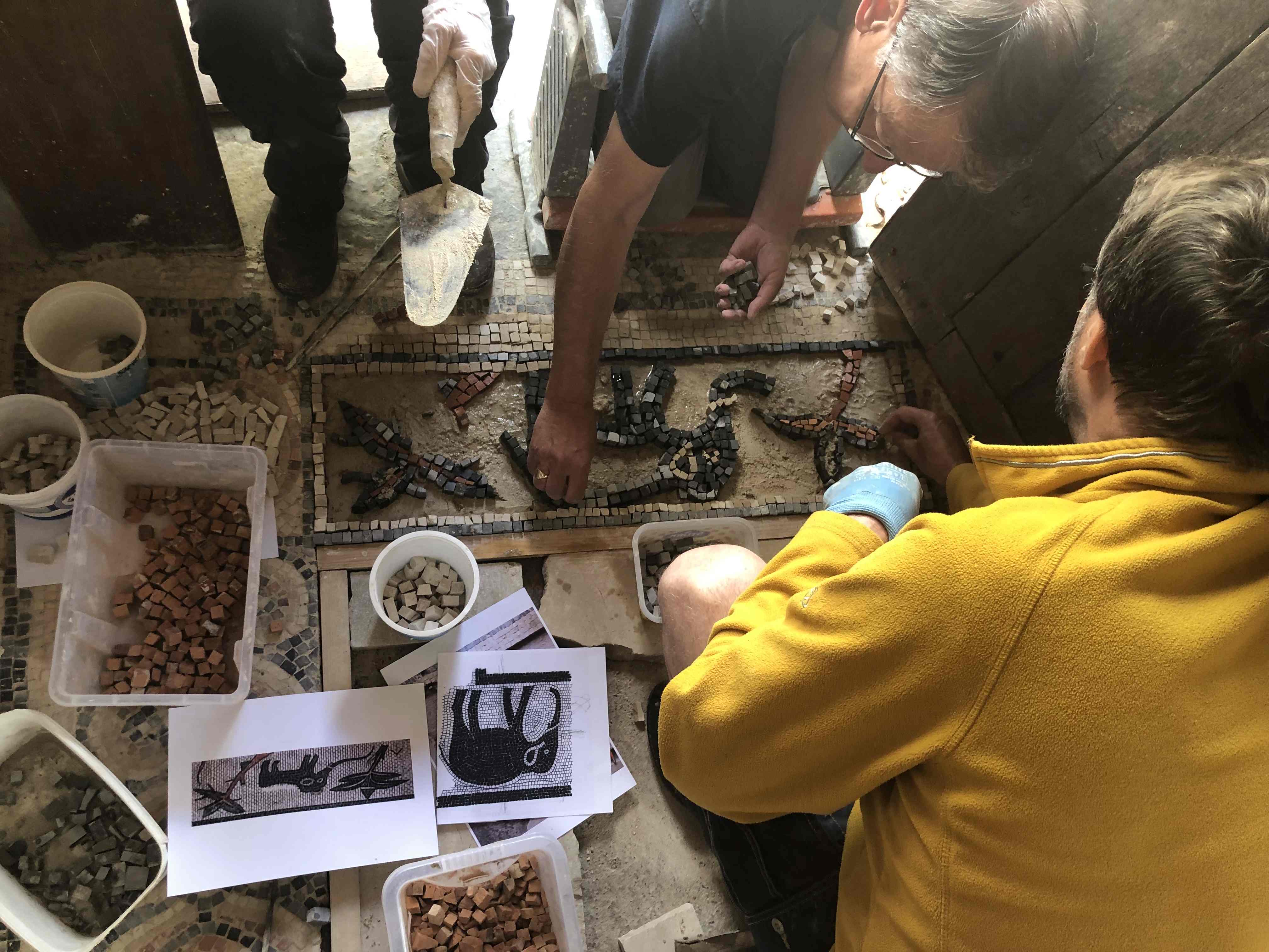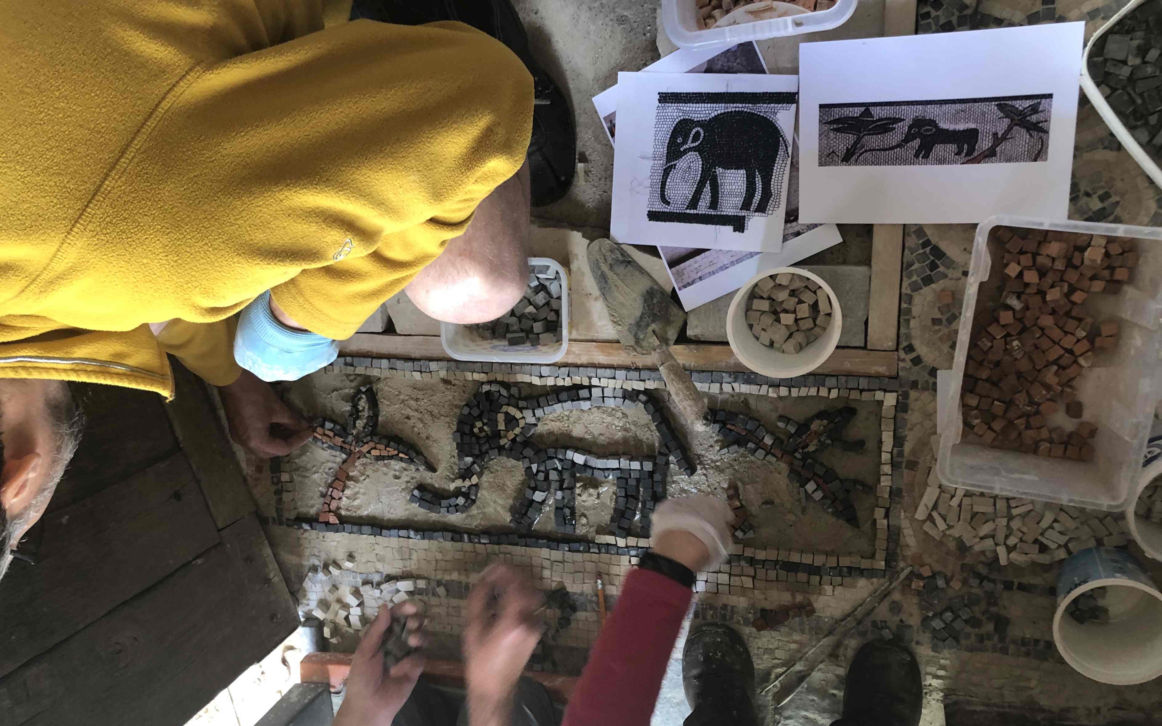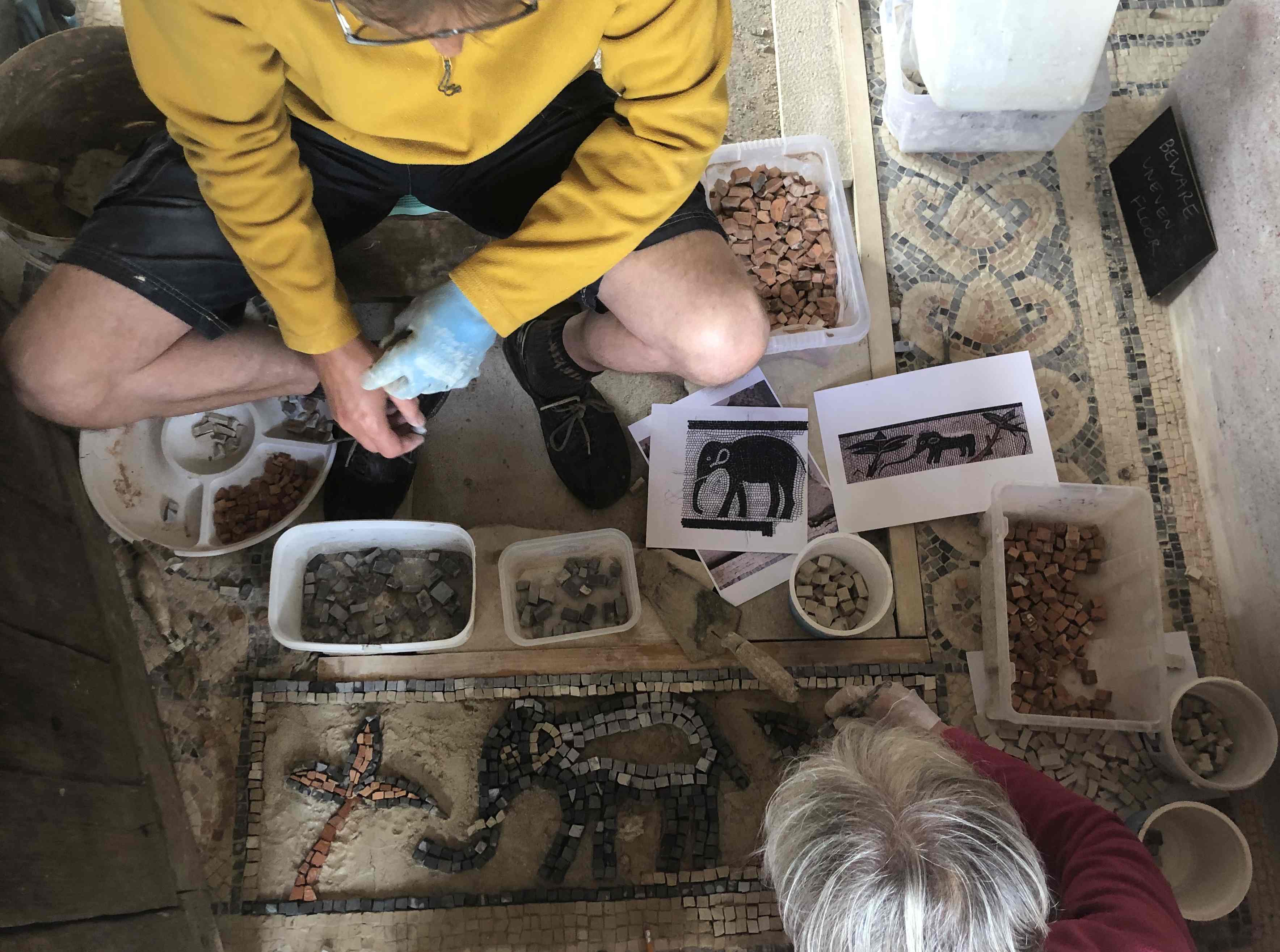 As it was World Elephant Day on the 12th of August, we belatedly marked the event by recreating the elephant mosaic from Whatley Roman villa, albeit at a smaller scale than the original. The villa, near Nunney in Somerset was discovered in in 1837 and excavated then, in 1848 and in 1958. The evidence for the elephant scene comes from a slightly dodgy lithograph and from a later, oblique and not terribly clear photograph that was recently rediscovered in the archives by Pat Witts. Steve Cosh kindly drew a reinterpretation based on the photo and that was used alongside the lithograph as our guides. You can see them both in the photos. The mouth could do with a tweak perhaps but otherwise we are happy with our ‘cave elephanti’ doormat. Roman mosaic elephants on the continent usually appear more realistic and have the right sized ears whereas British mosaicists seem to have been more conservative in their ear depictions, perhaps because they had never seen an elephant and so couldn’t comprehend an animal having such huge ears in relation to its head.