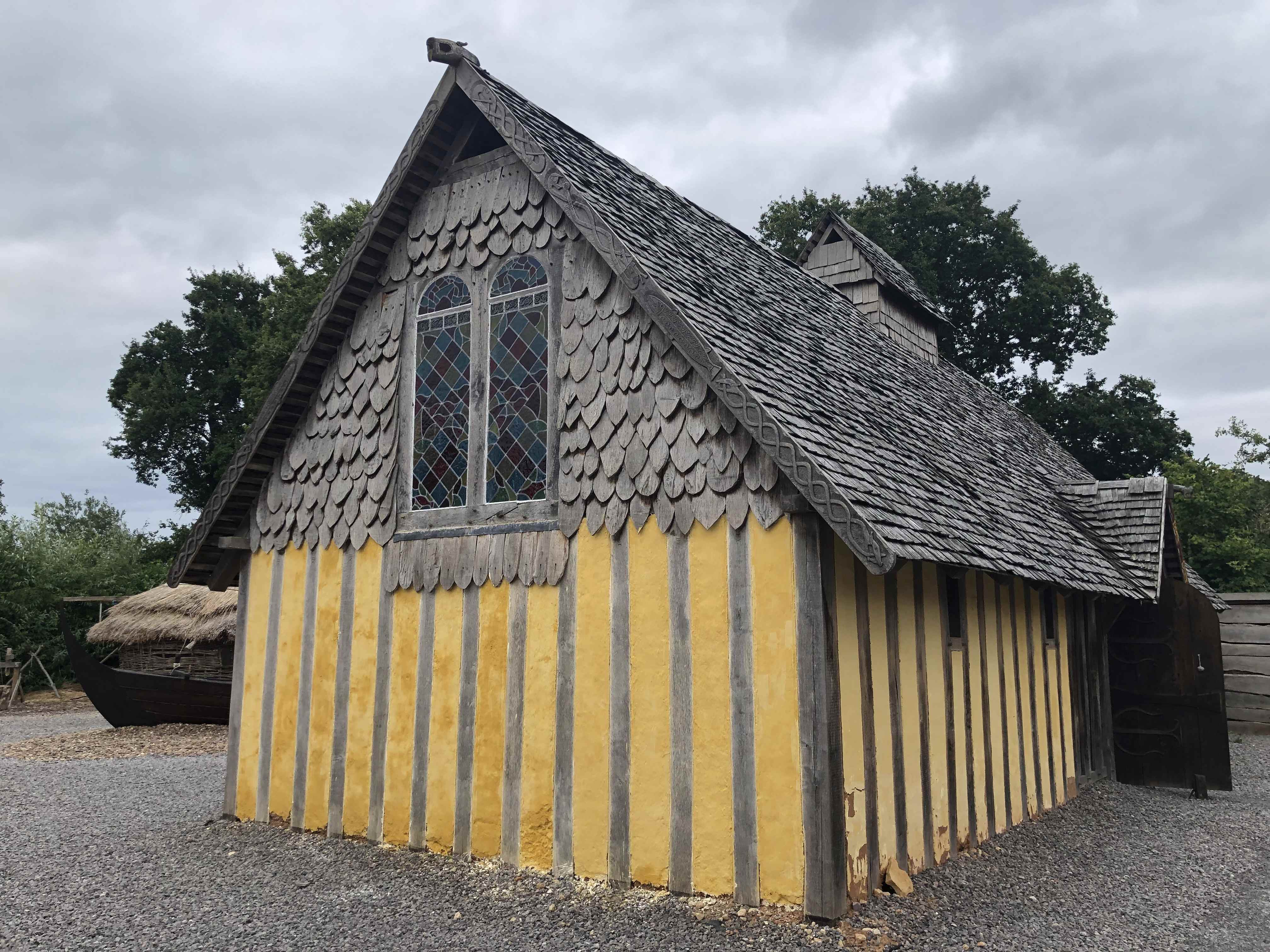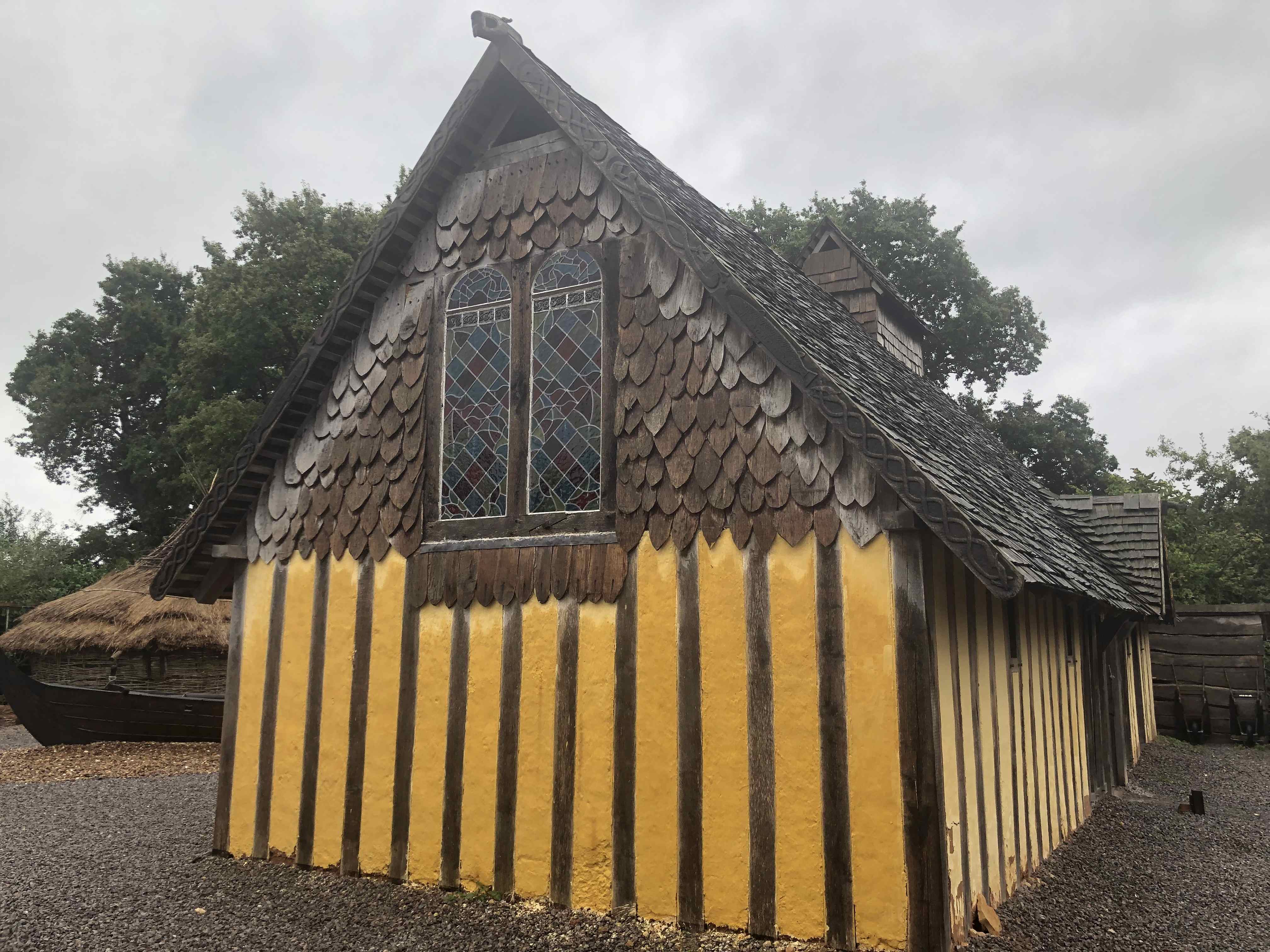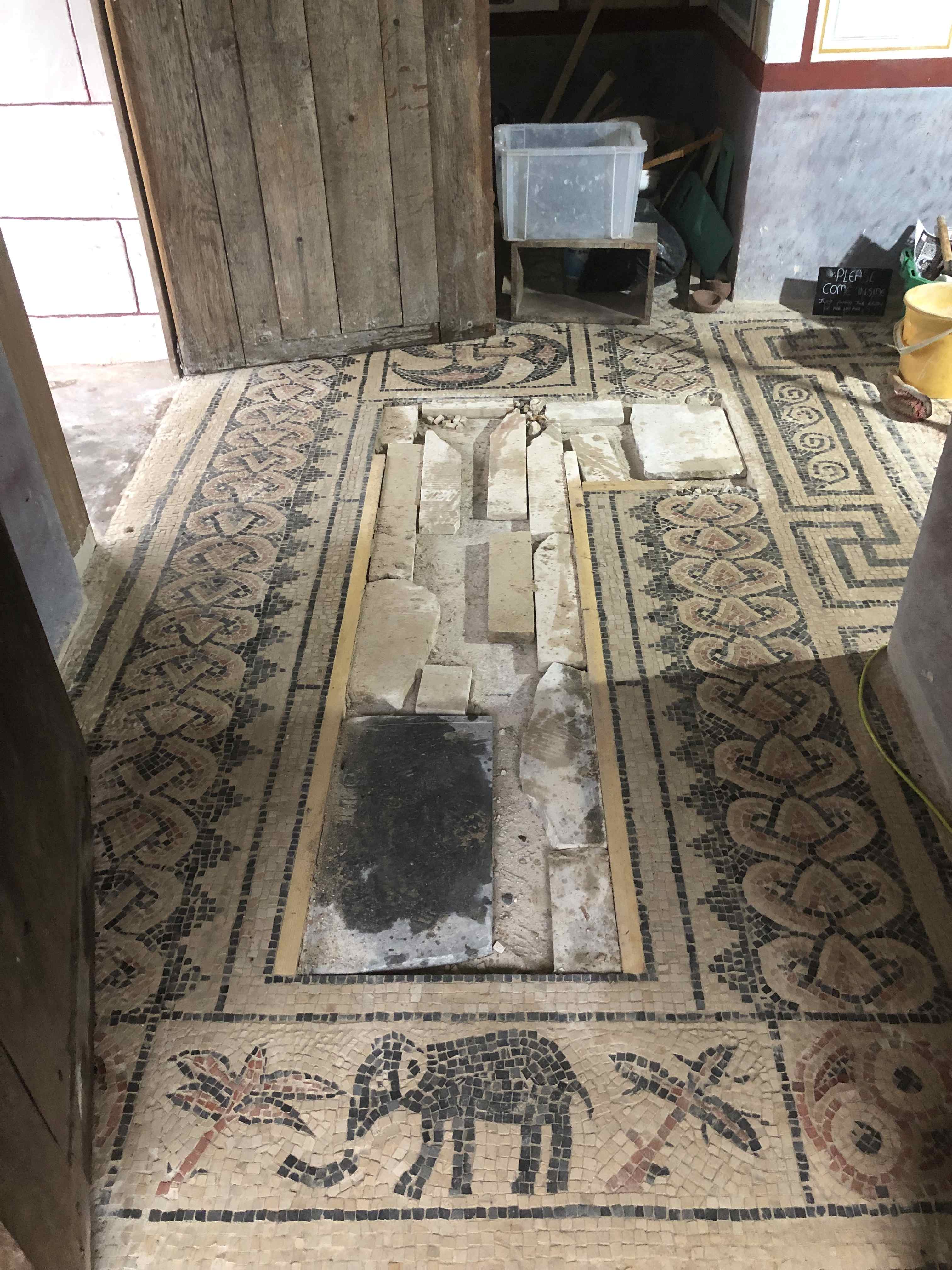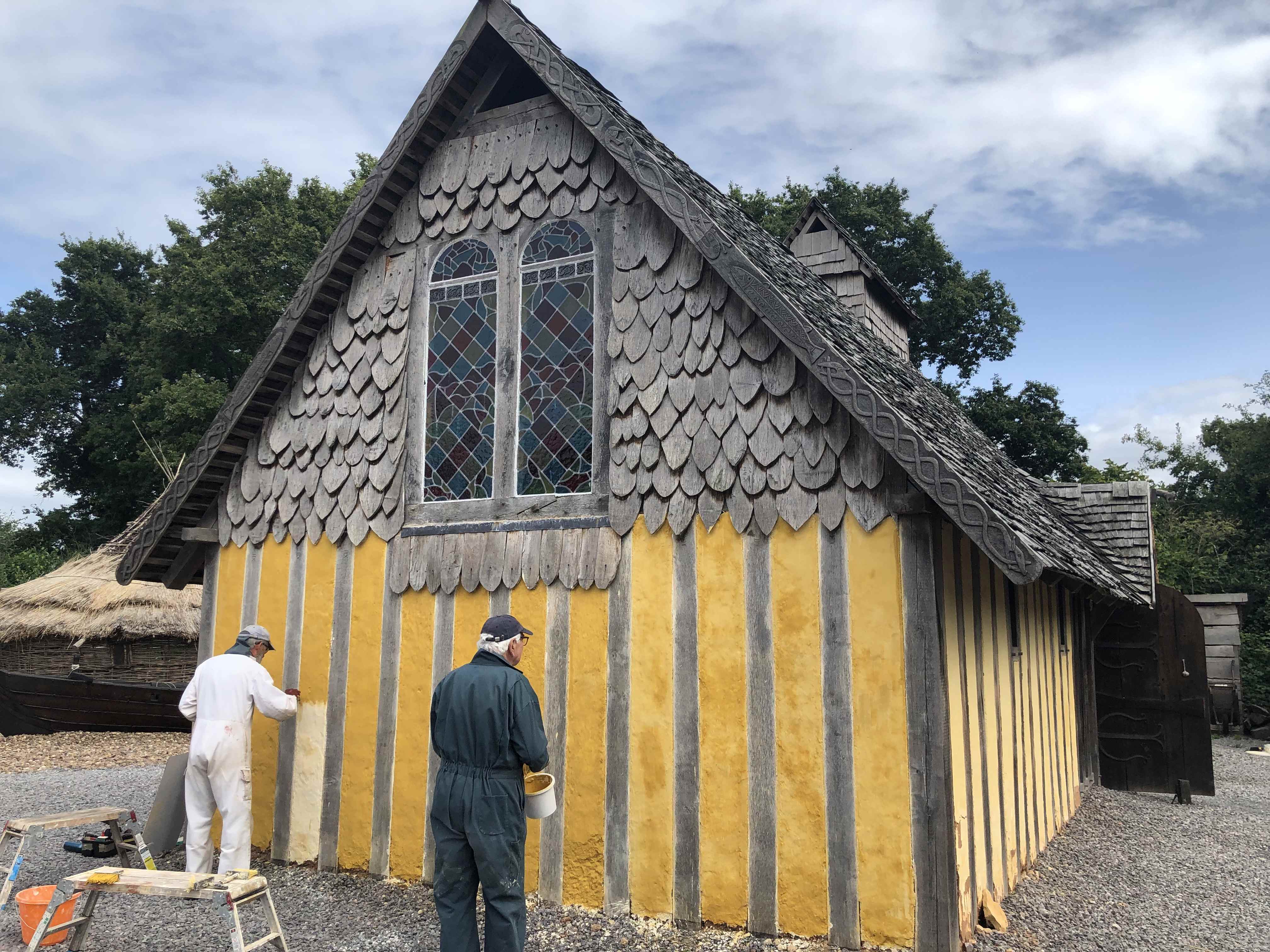 The gable end of the longhall takes a bit of a battering from the prevailing weather, so it was treated to a refresh, with four new coats of limewash. The last one had iron oxide pigment in it to give the warming yellow colour. Like all limewash the rain gives a darker colour to the wall, as you can see in the last image. The Quantock National Landscape volunteers and some staff also visited for a working day, helping to make tesserae and laying some more of the mosaic floor.