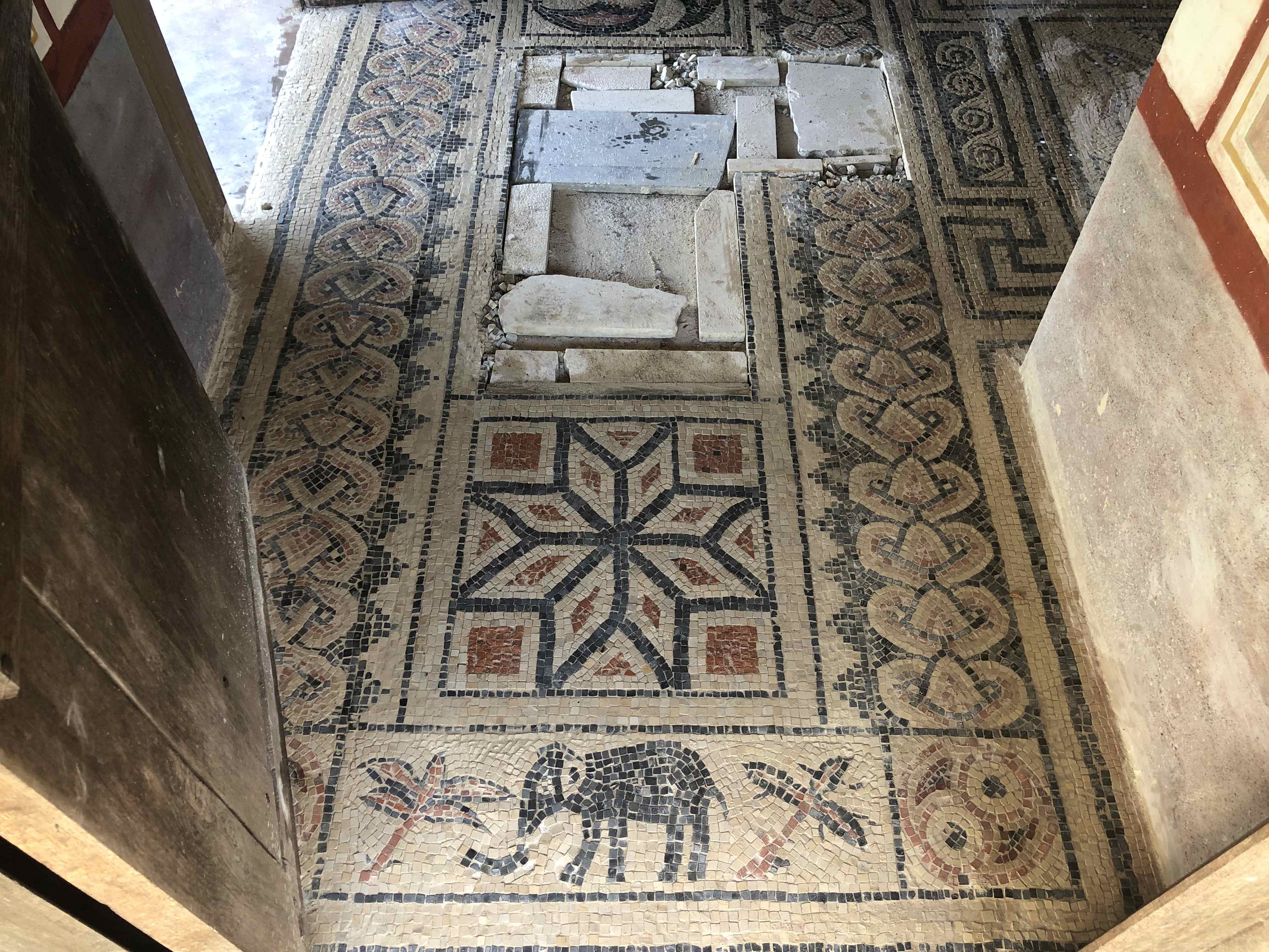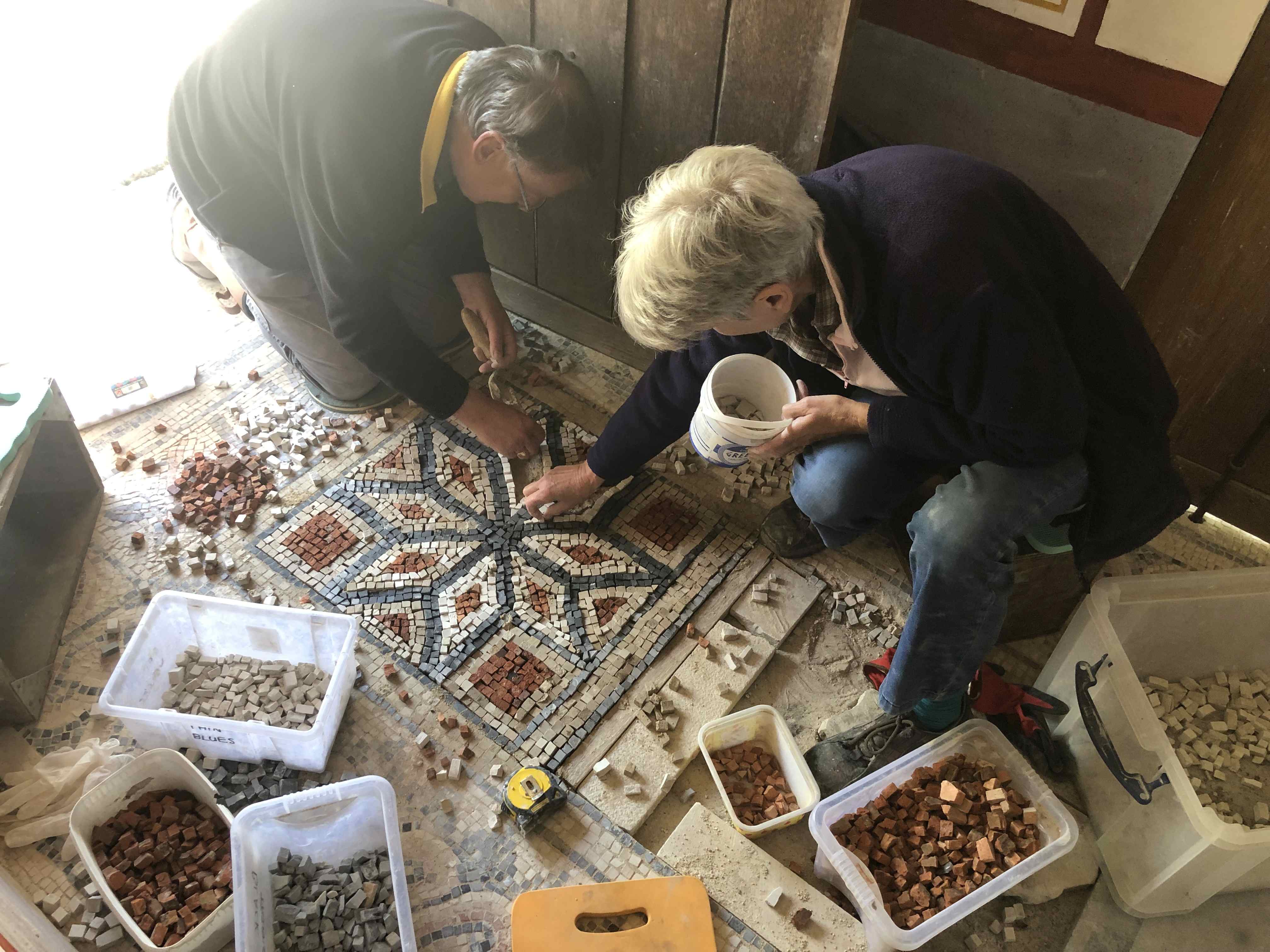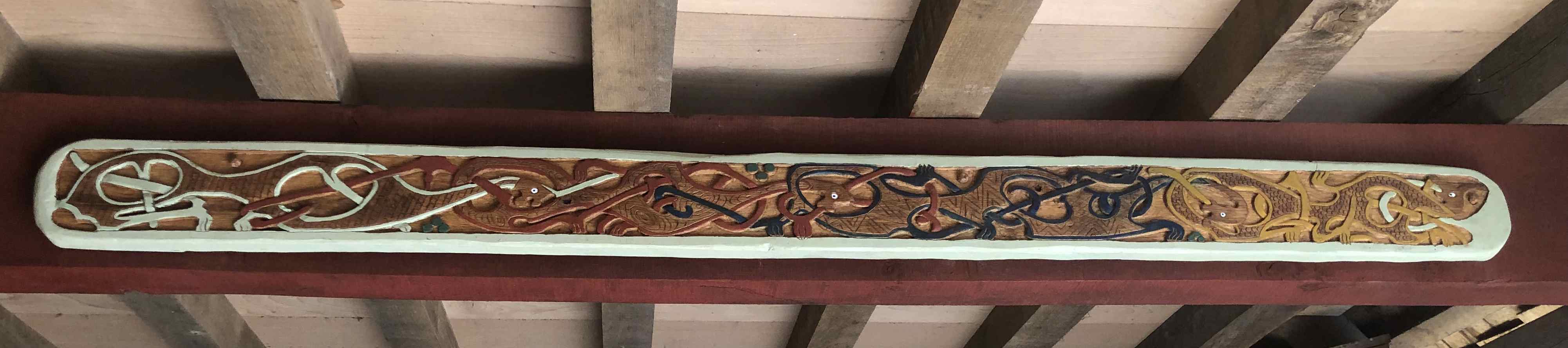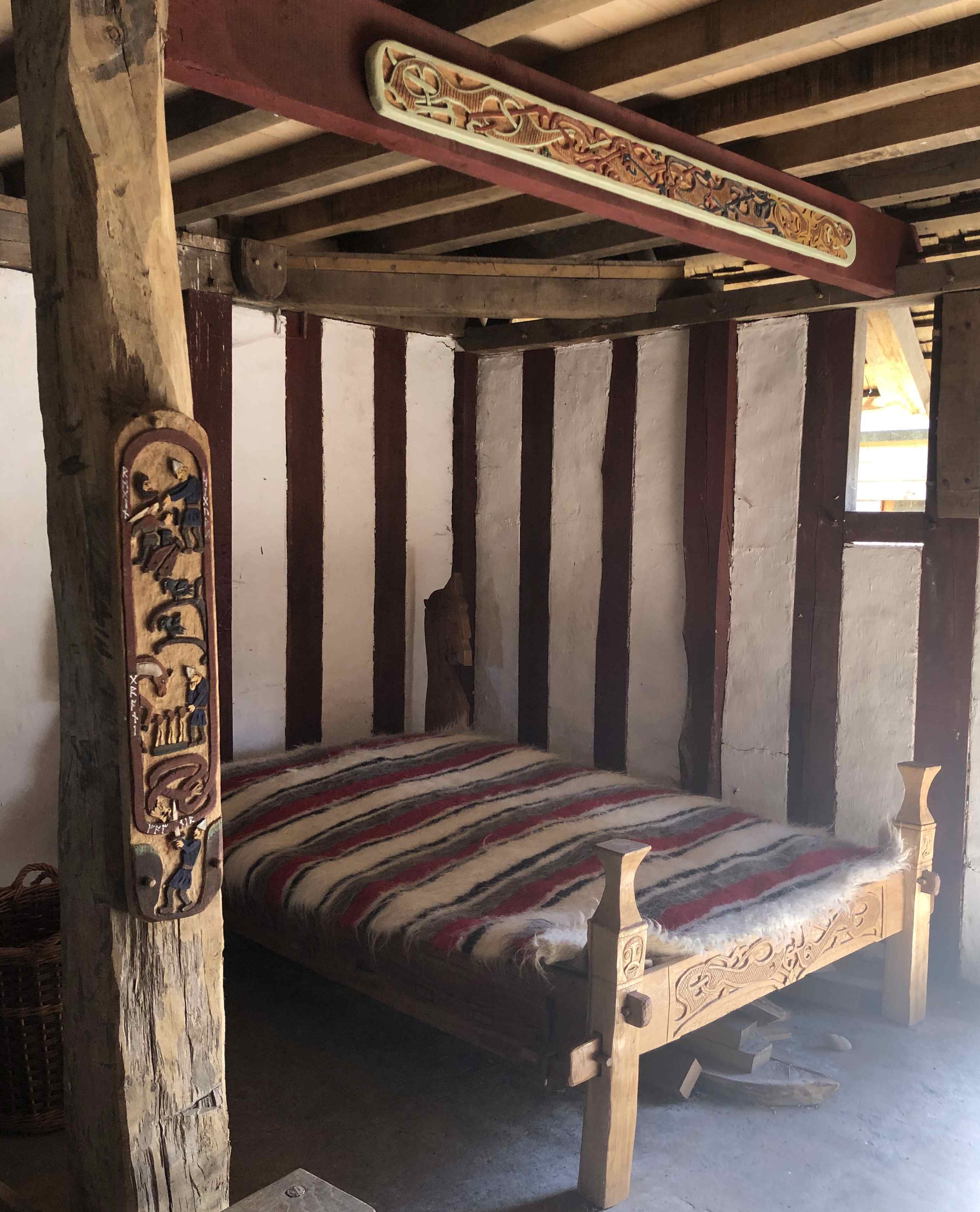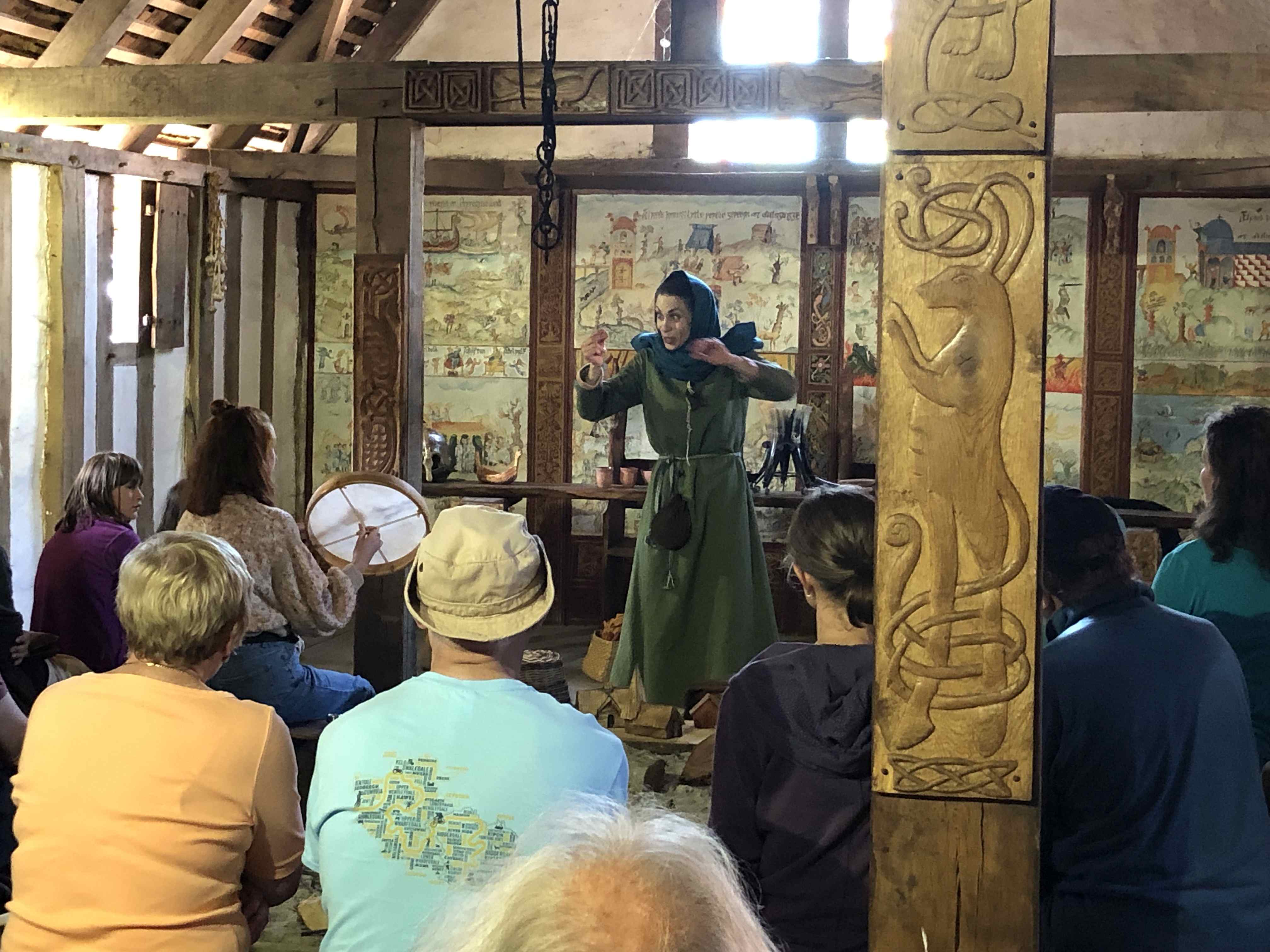 Kath’s wonderful carving based on the prow of the Norwegian Oseberg ship has now taken pride of place above the replica bed, that was also based on the example from the Oseberg ship burial. In the Roman building the mosaic took another step nearer final completion, with the flowers/cubes trompe l’oeil pattern. Hands on Heritage volunteer Leela also did another two wonderful performances of her one woman play Kith and Cin in the longhall, before the show goes on tour.