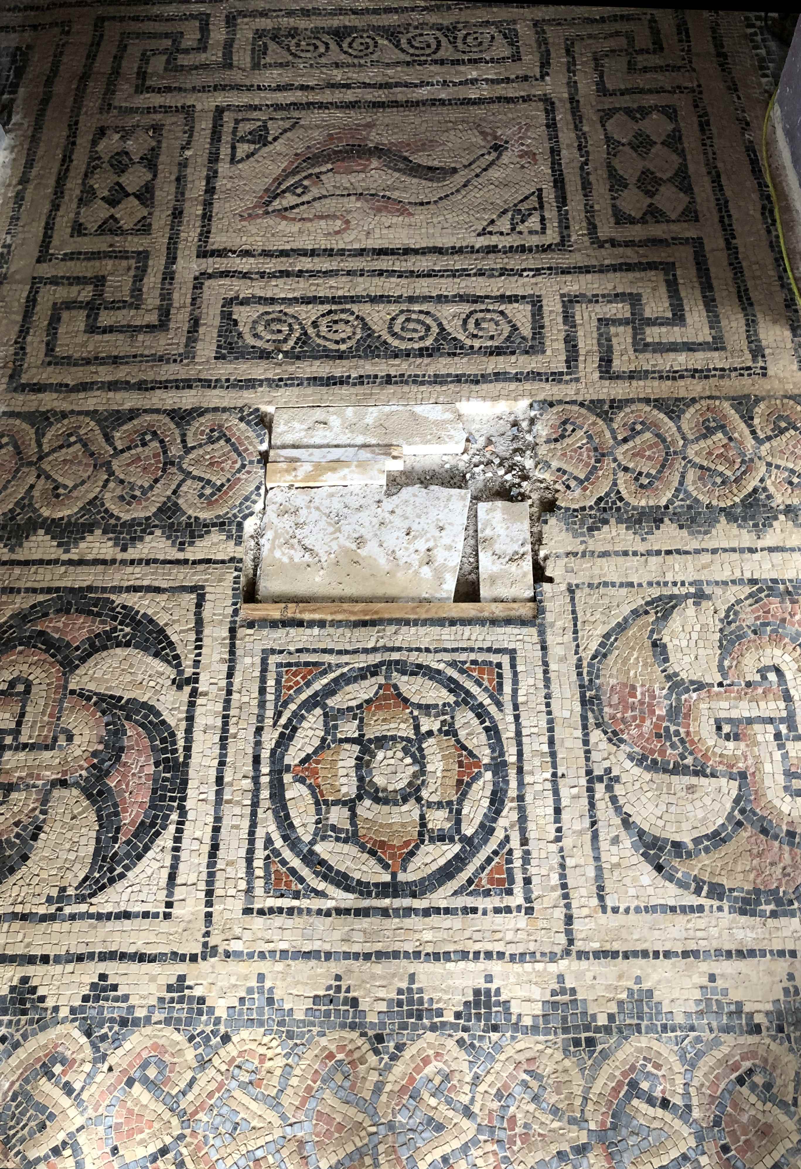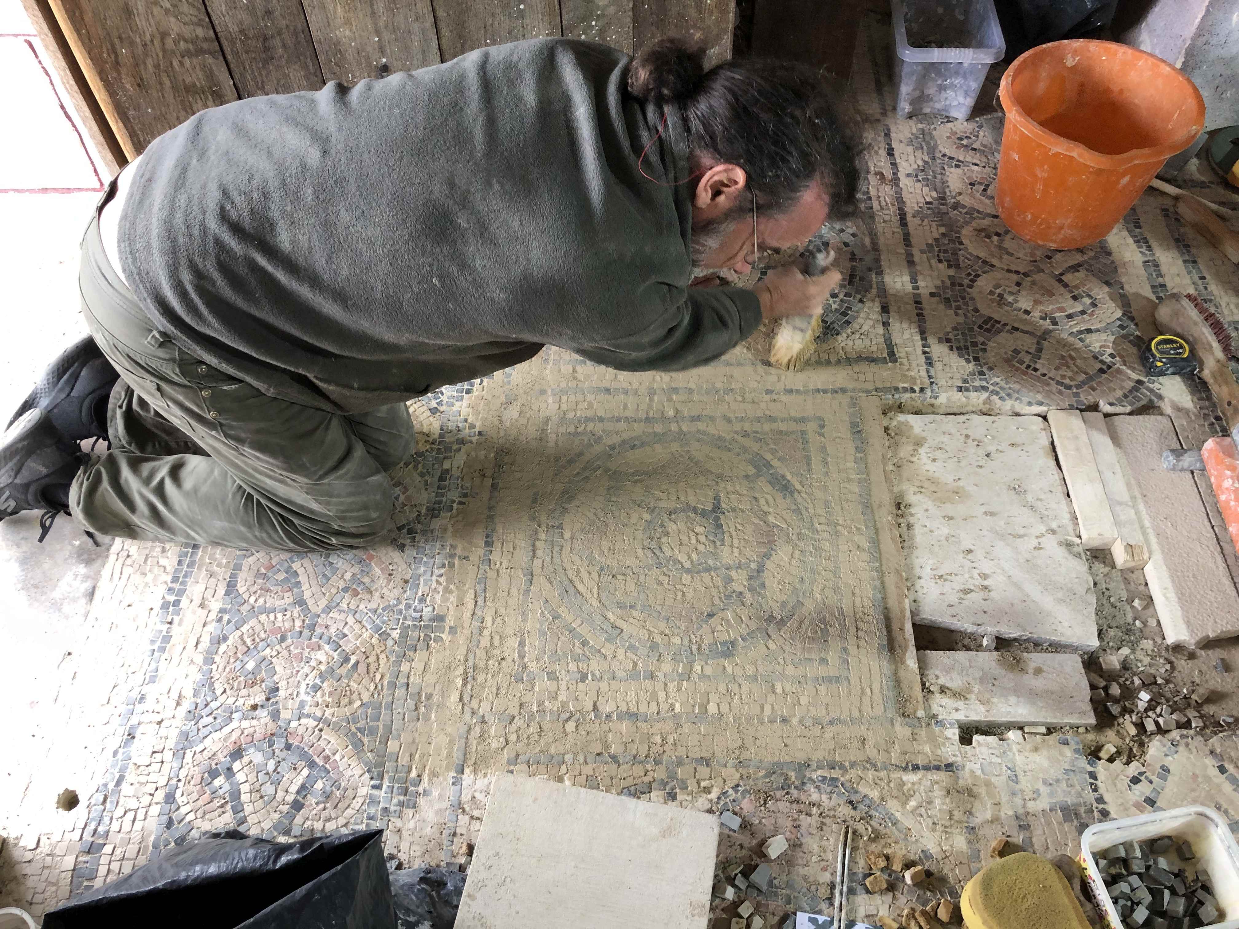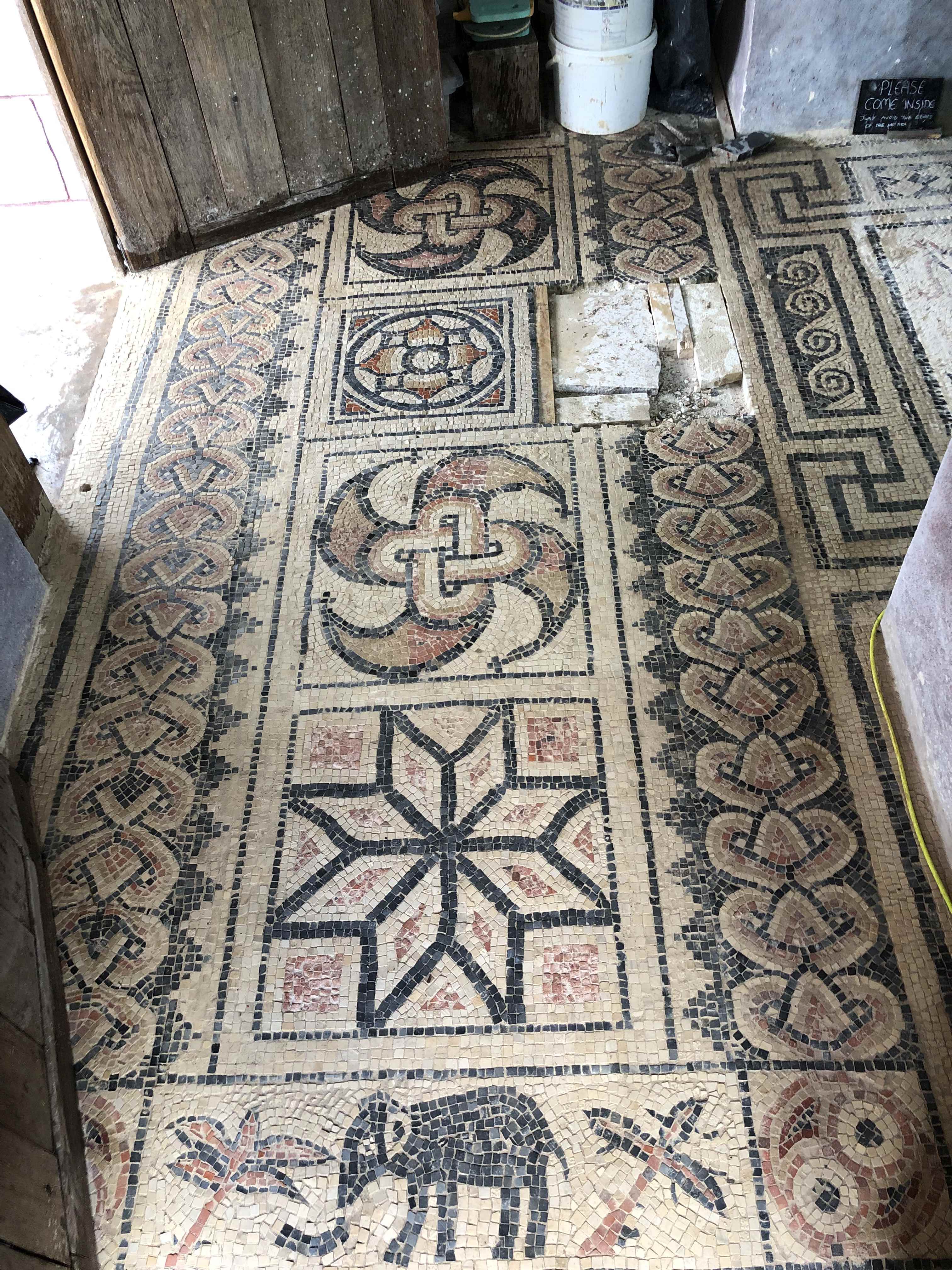 Work on the Roman mosaic is rapidly reaching its conclusion, with the latest flower design being added to the ante room. The gap next to it is for the installation of a tank of fish and eels next week, to keep the Lopen dolphin (aka Bernard the Gurnard) company. Meanwhile the Roman dining couch is almost ready for assembly. One of the turned legs can be seen beside the frame in the picture.