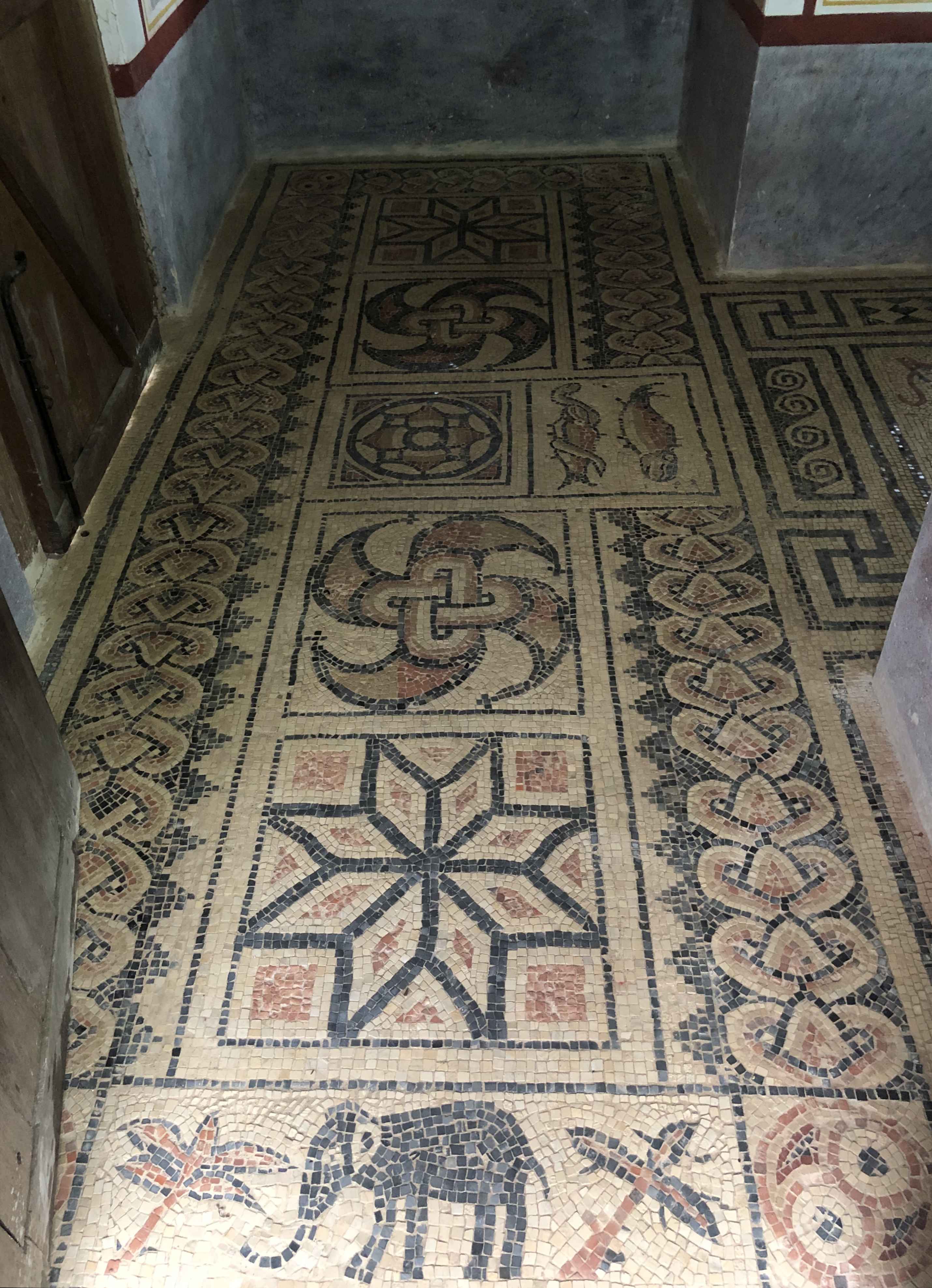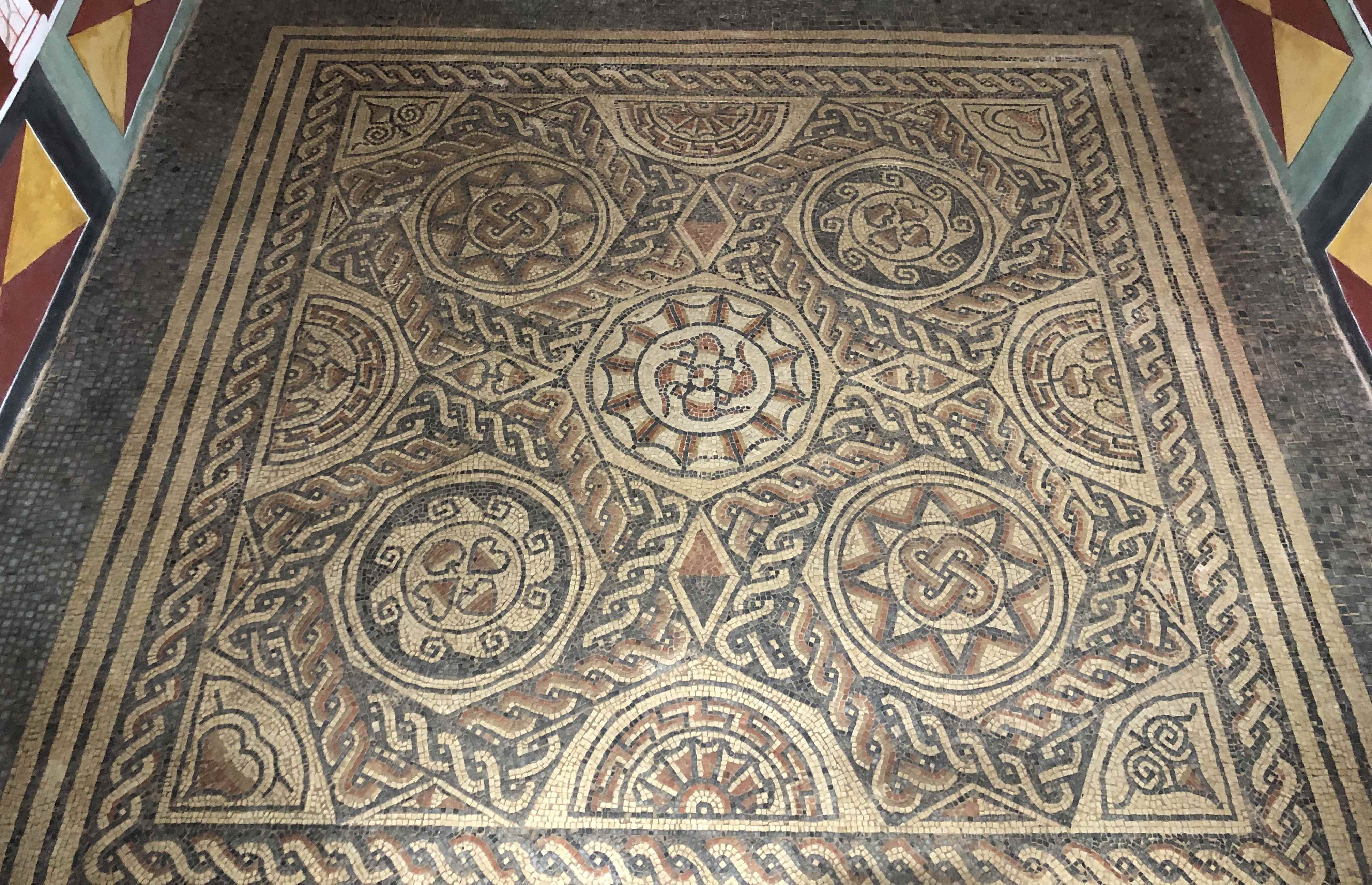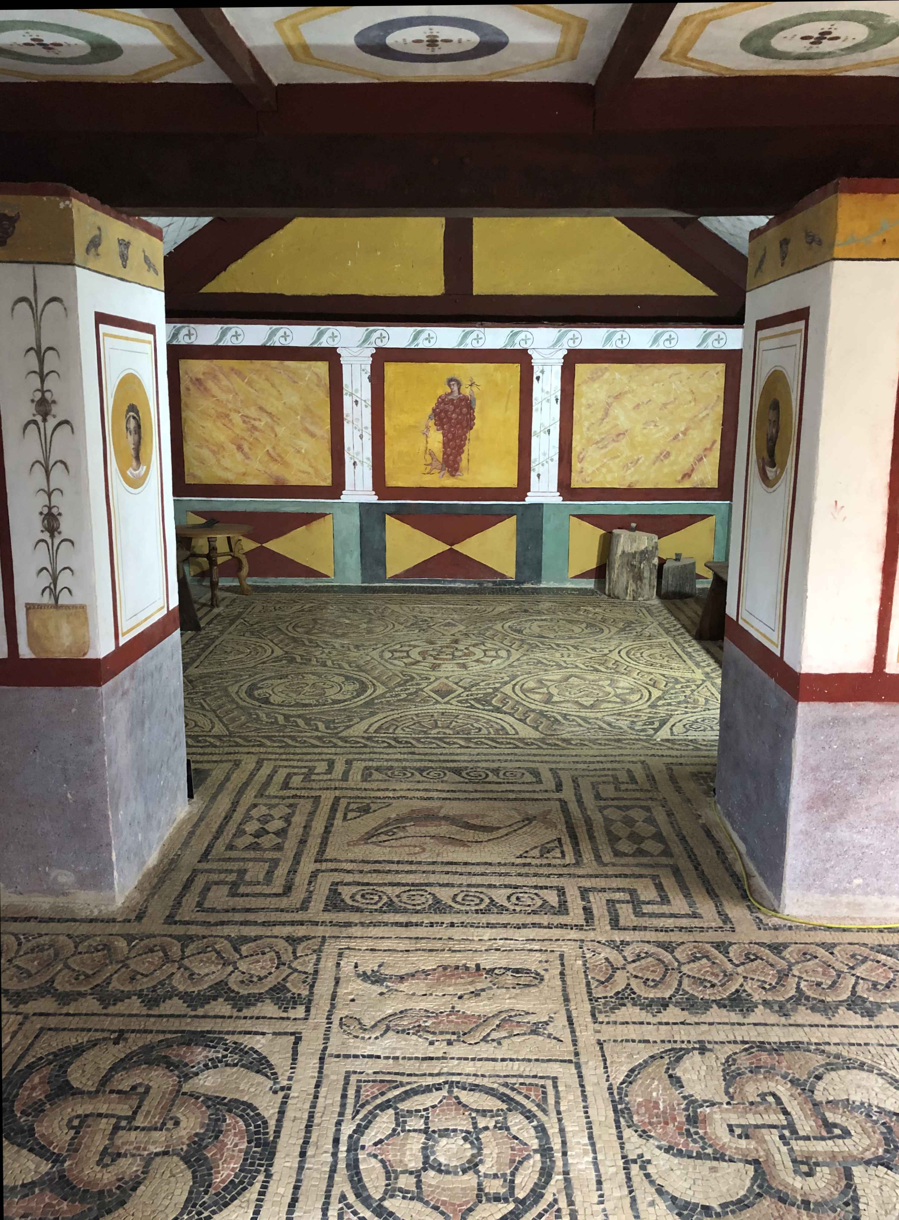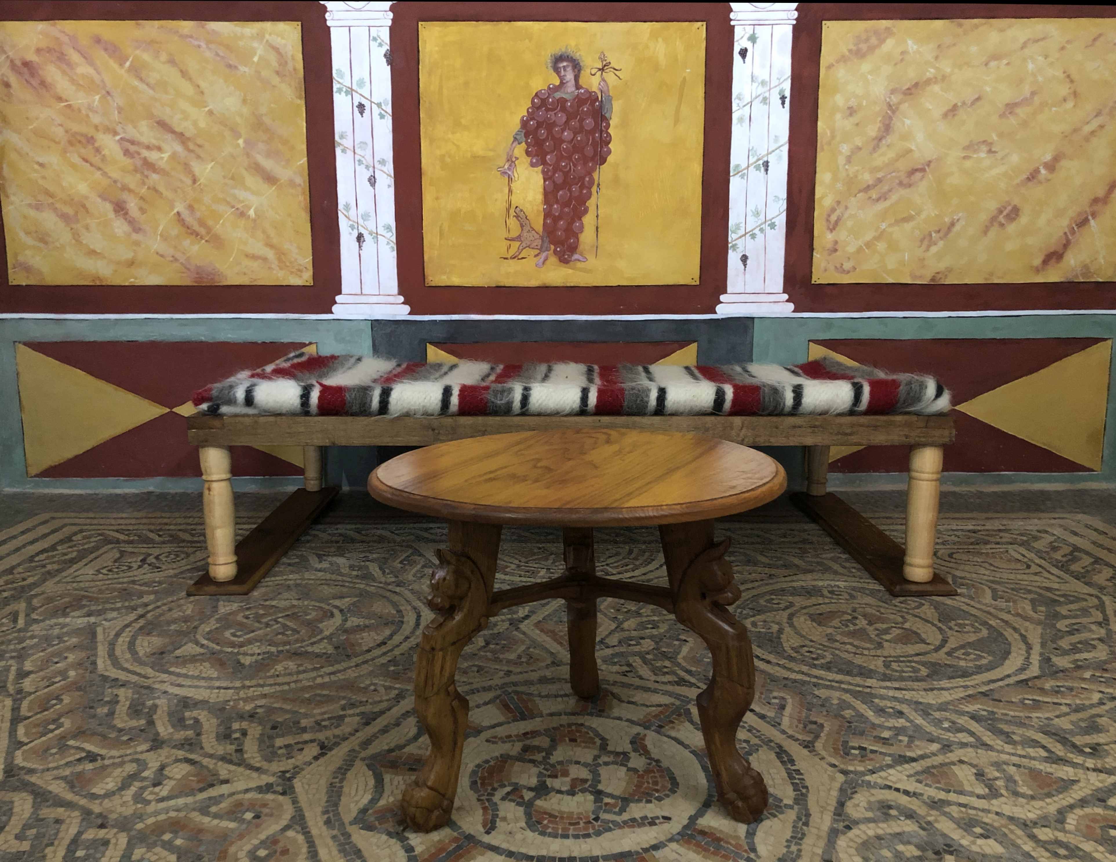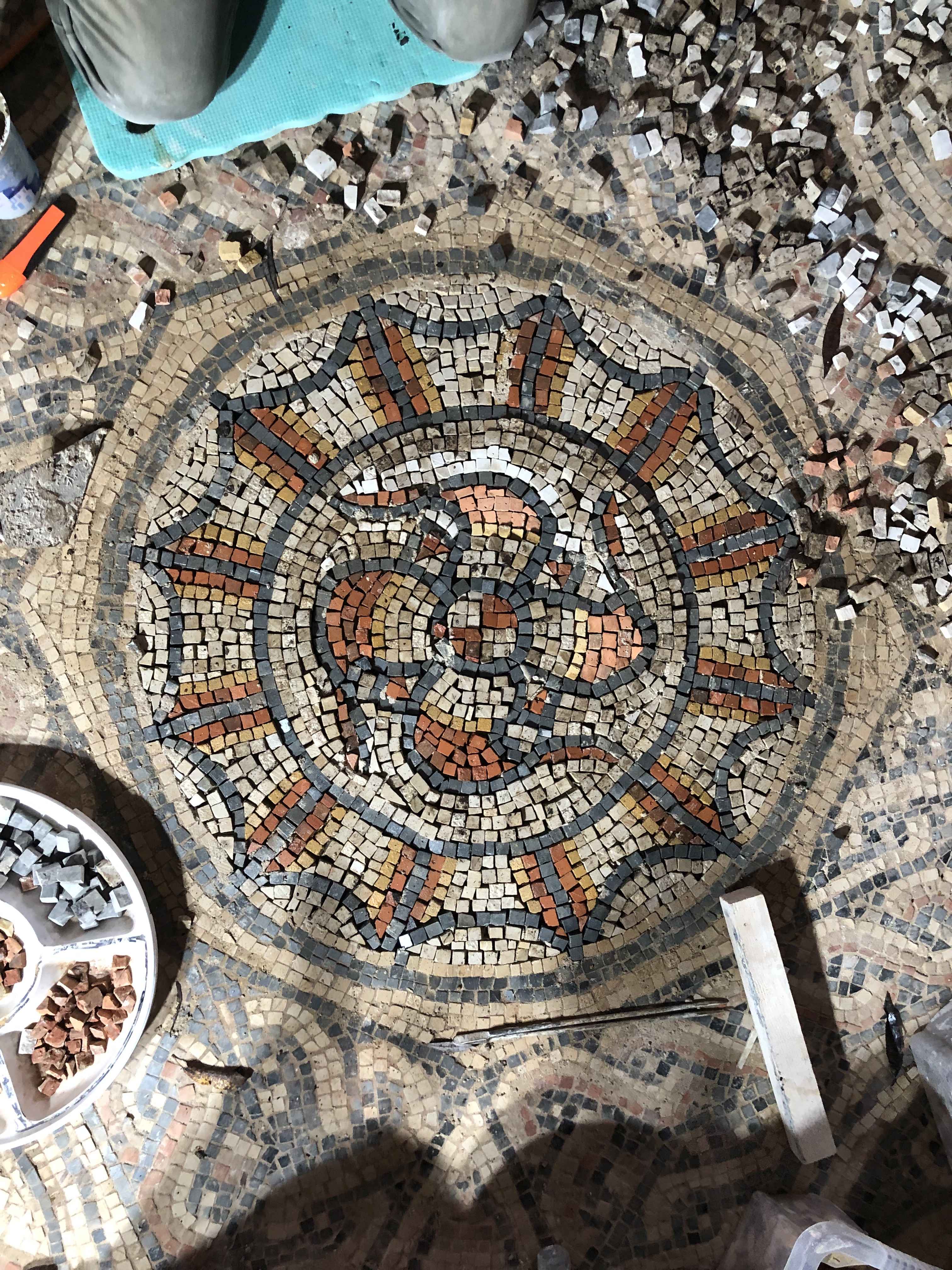 After 3 years and 140,000 tesserae, the Roman mosaic is finally finished. A great achievement by a dedicated and talented group of volunteers who have created a real work of art. The couch base was also completed just in time for the occasion to complement the round table. The pictures speak better than words.