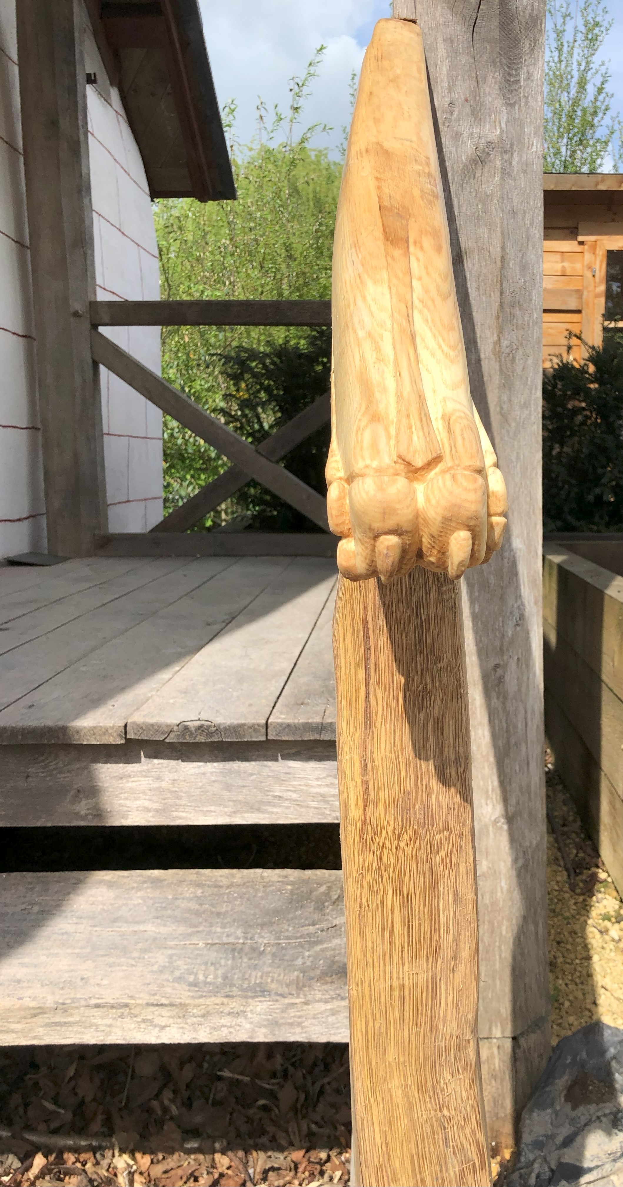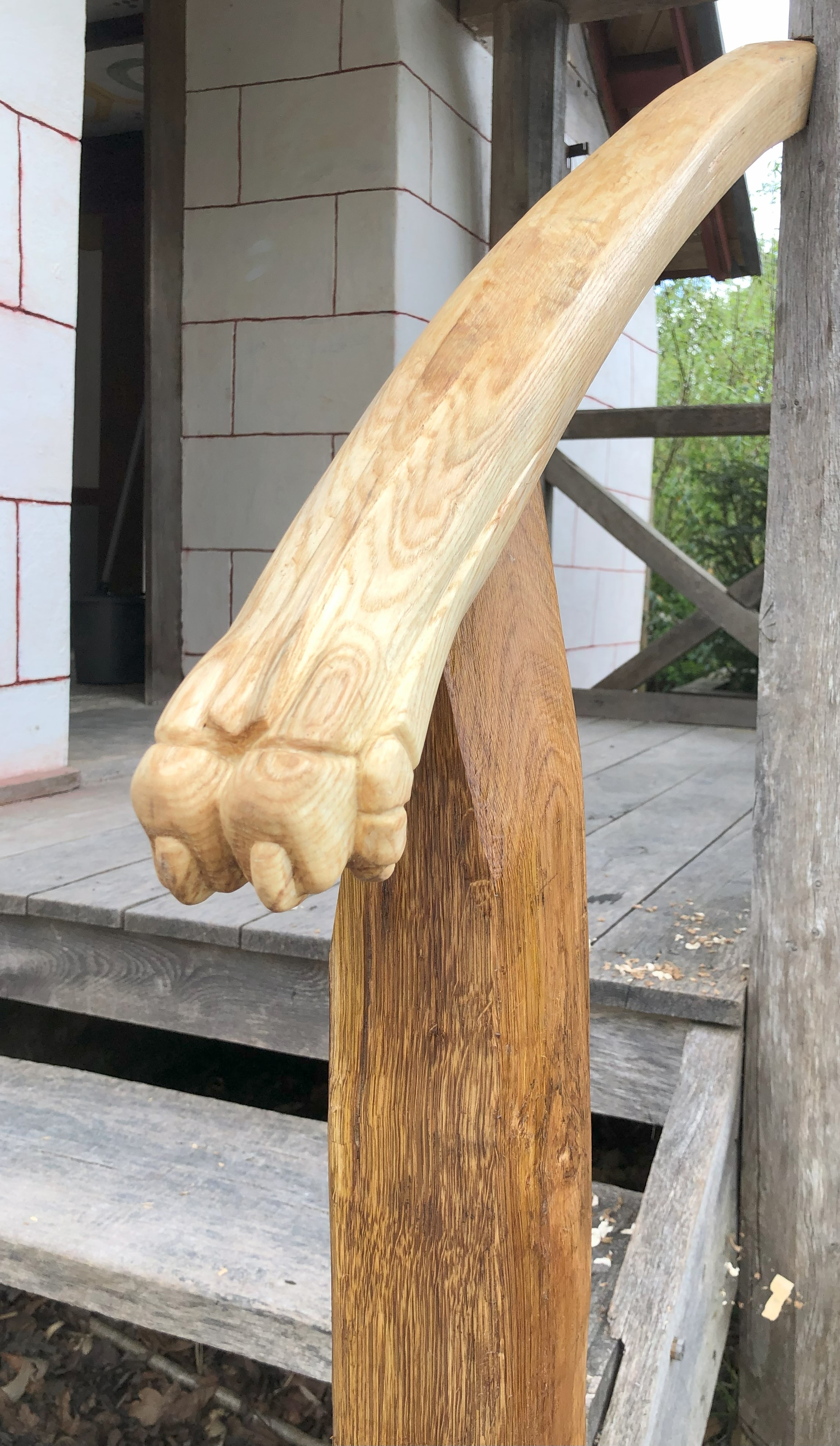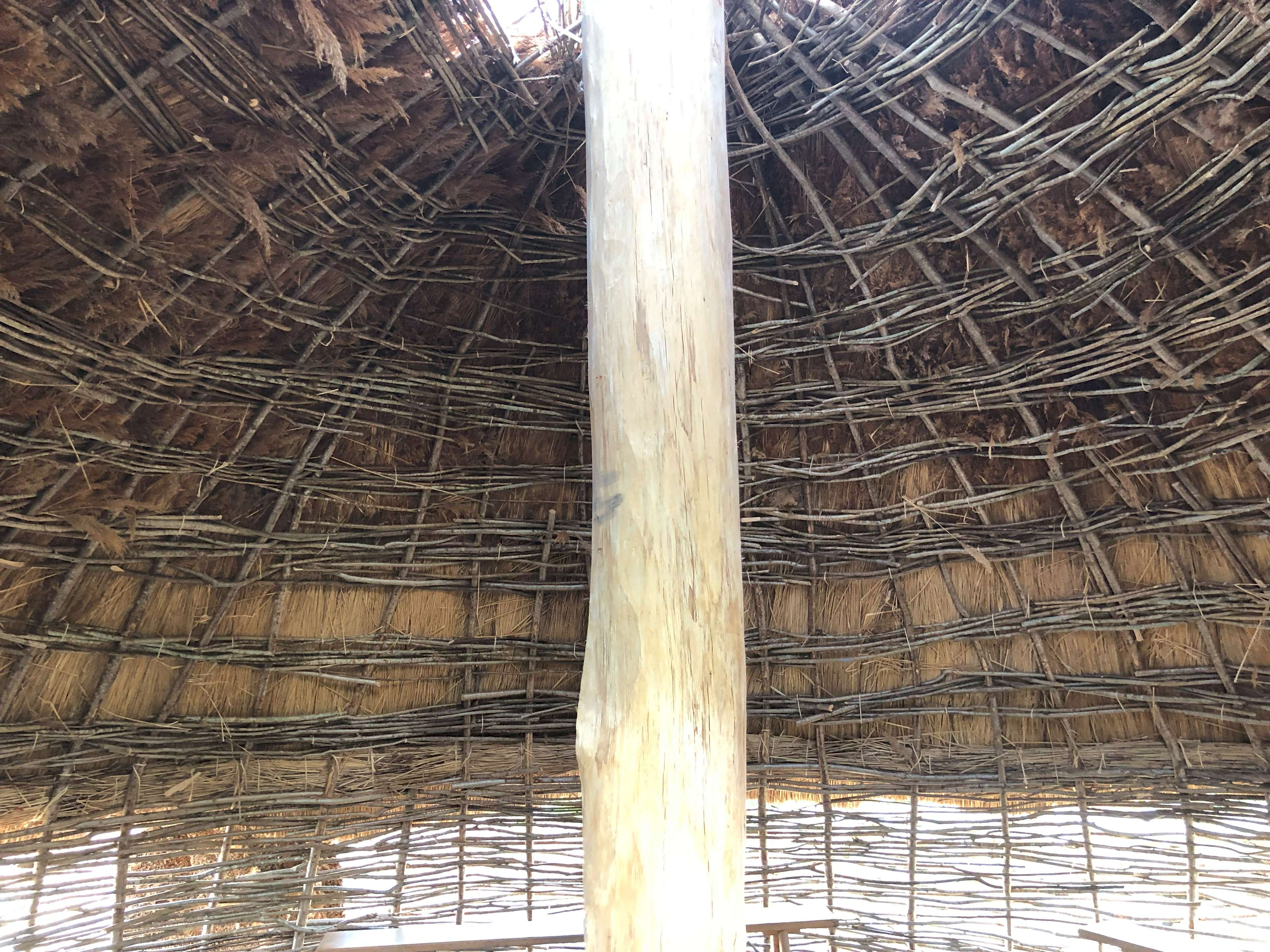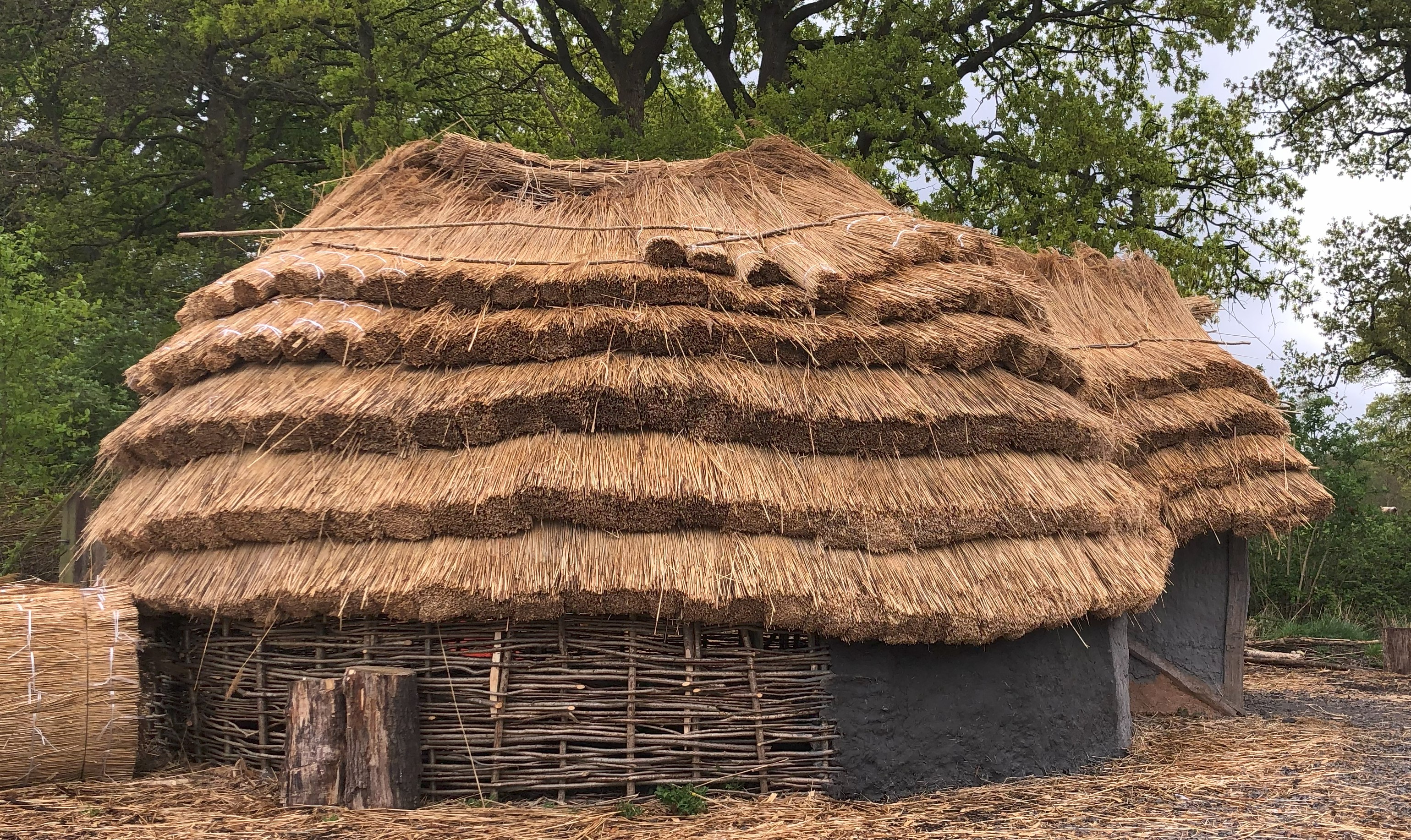 The reed thatch on the roundhouse is nearing completion. Rather thicker than they would probably have gone for in the Iron Age, as the whole building would only be expected to last for a decade. Meanwhile on the steps of the Roman building a lion’s paw handrail has been installed, to complement the design on the legs of the table inside.