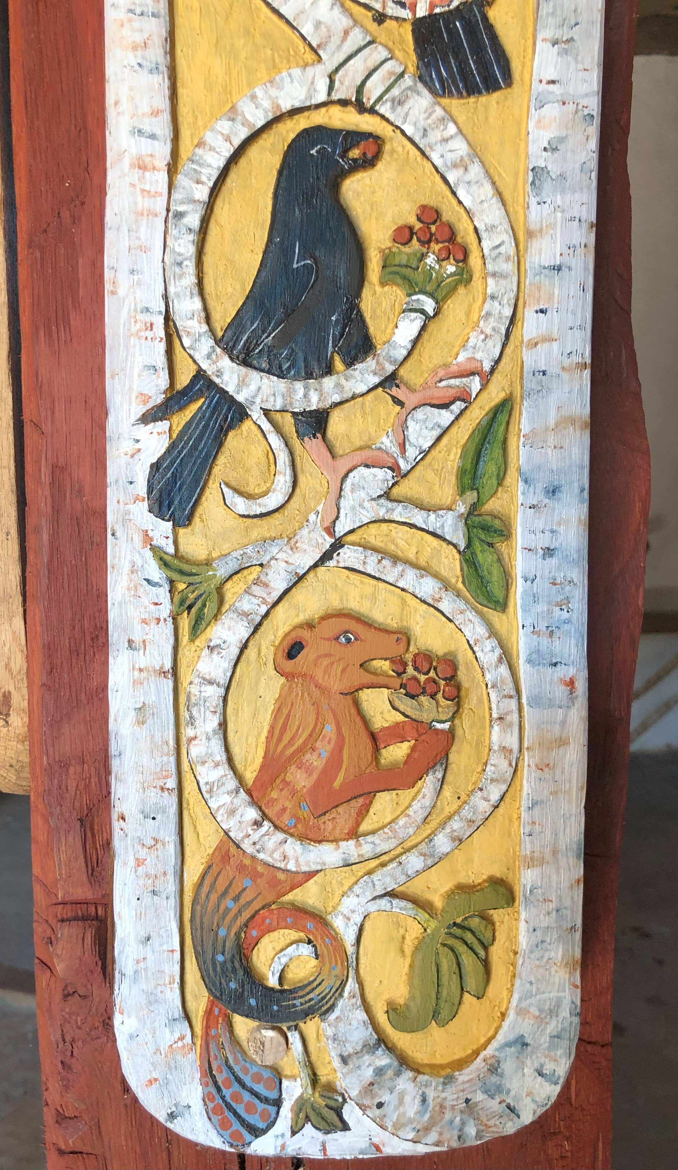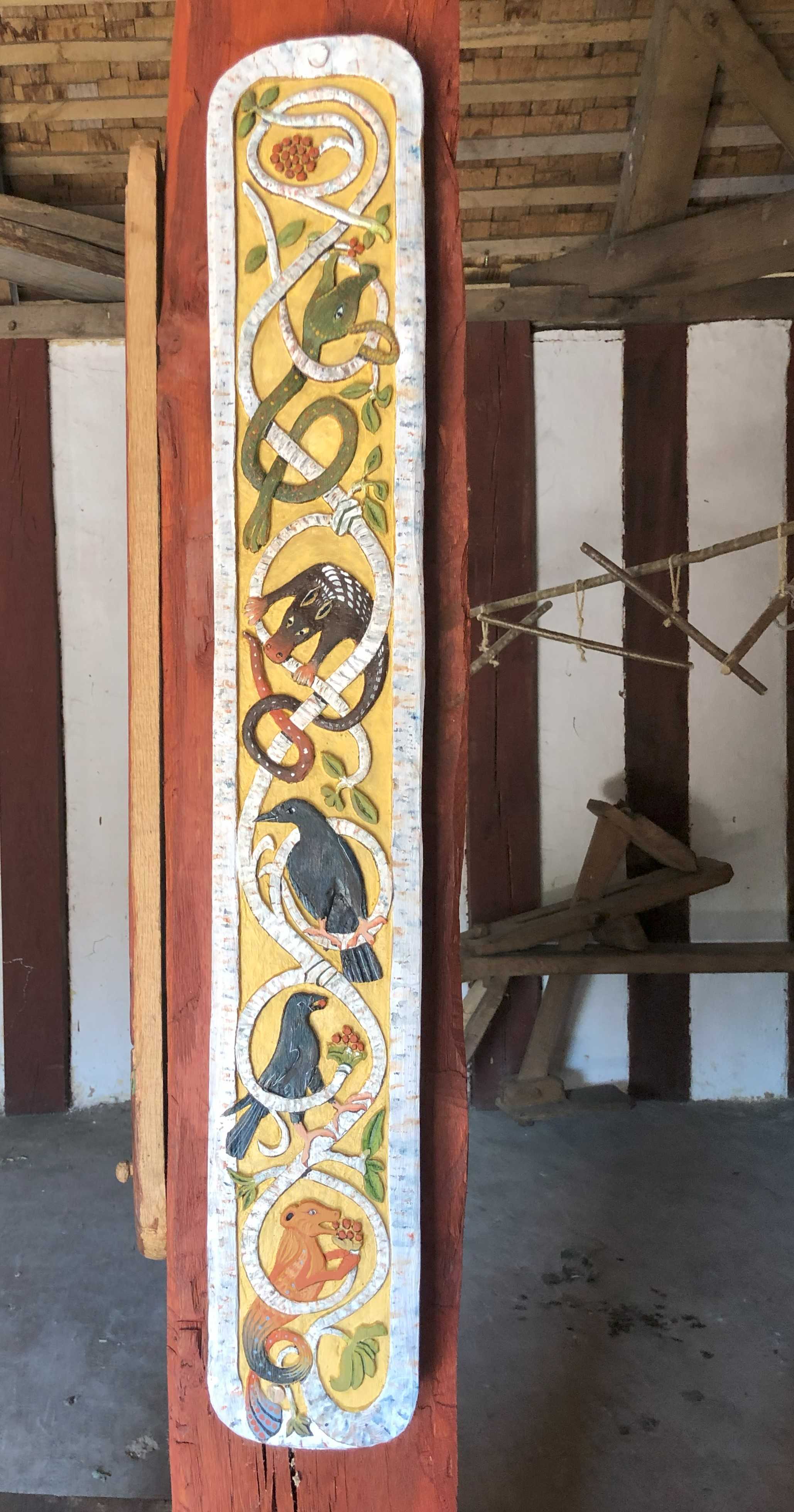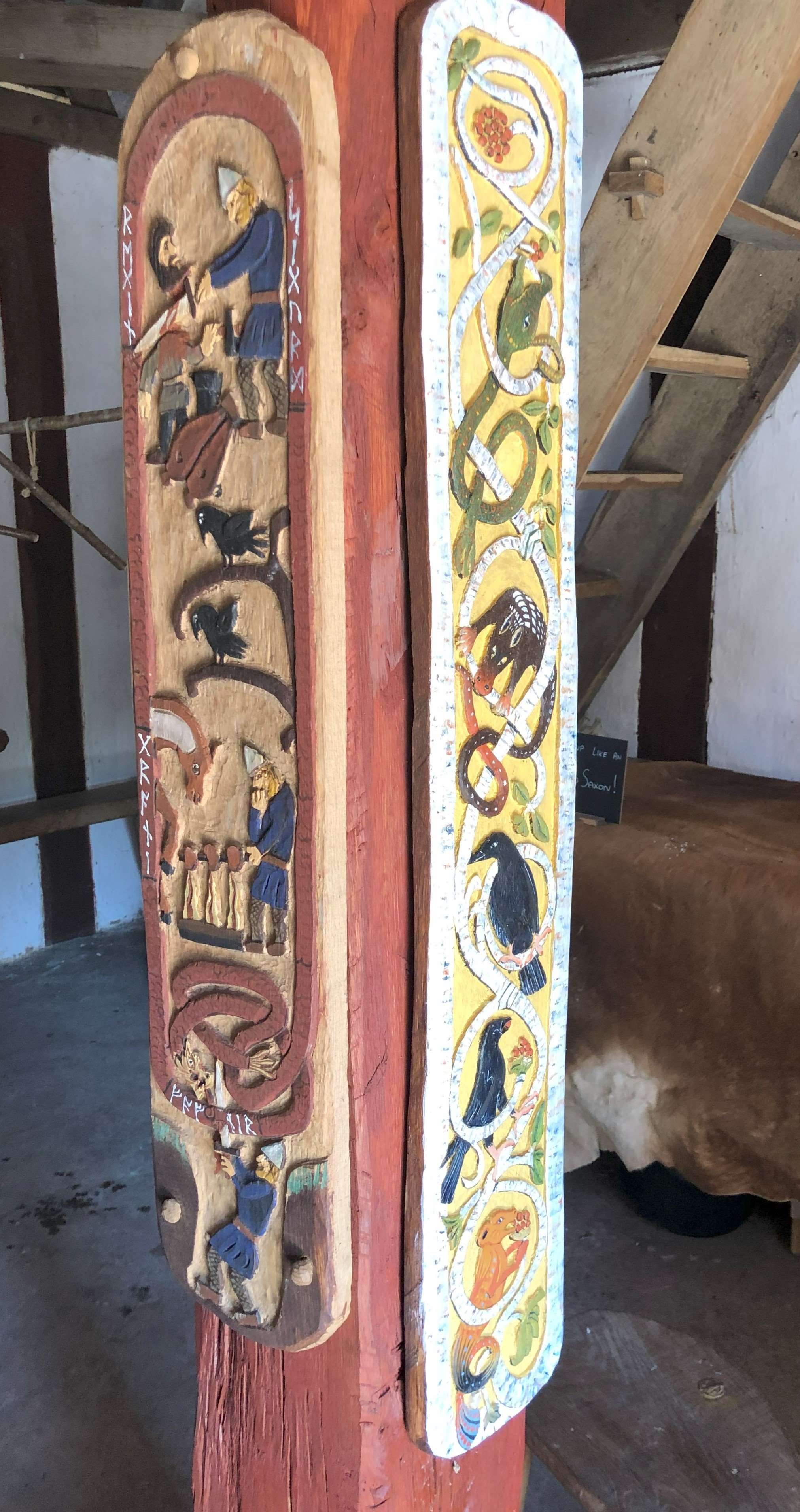 Latest carving in the longhall, based on images on the 8th century Ruthwell Cross in Dumfriesshire, Scotland, a location that was then part of the Kingdom of Northumbria. The animals depicted are a mixture of real and imaginary creatures, a reminder of the unfettered creativity of the original carver. Realistic birds are accompanied by a dragon/worm, a horse/dog/pig/snake and a bear/bird. The colouring is a product of a modern imagination.