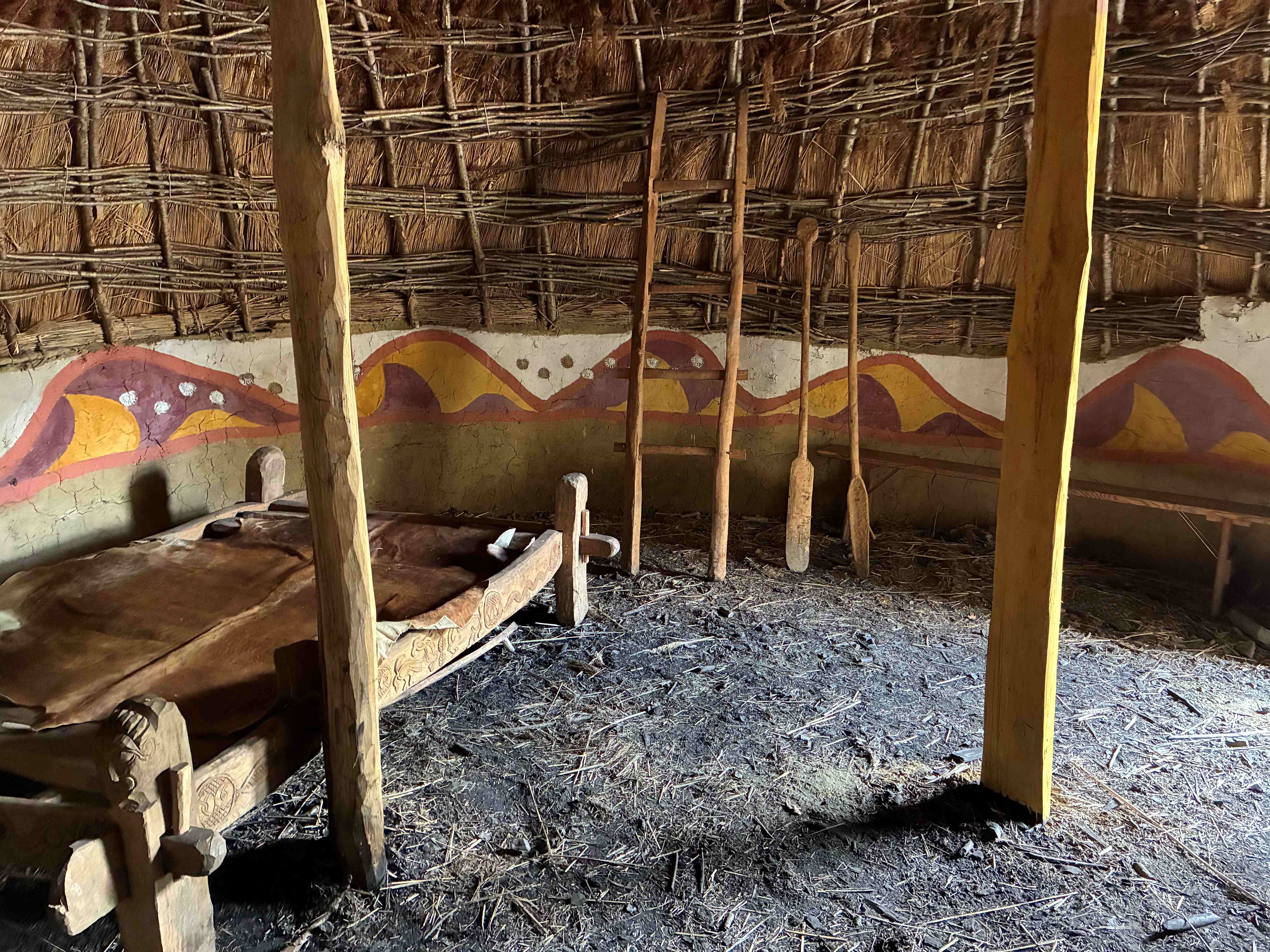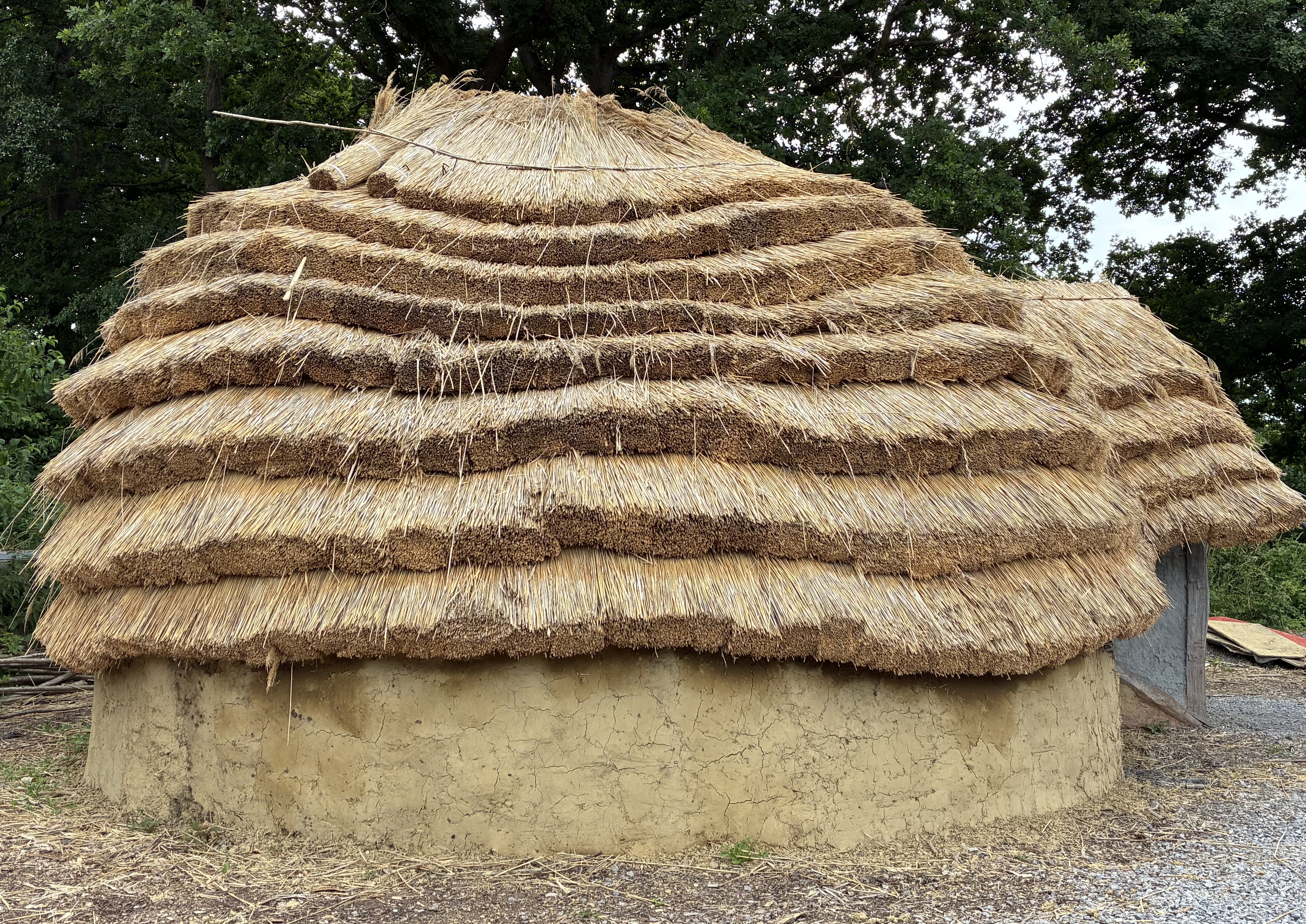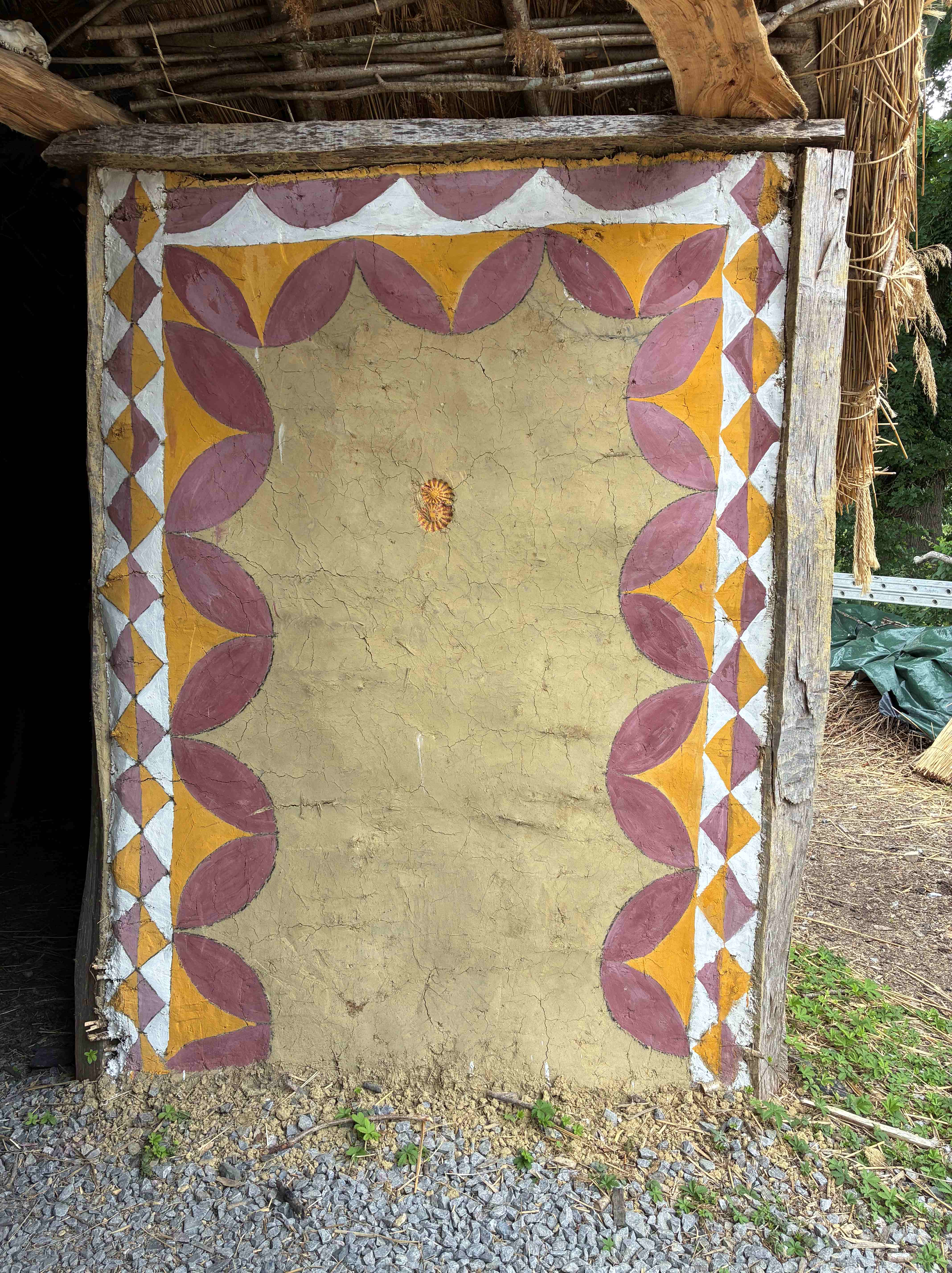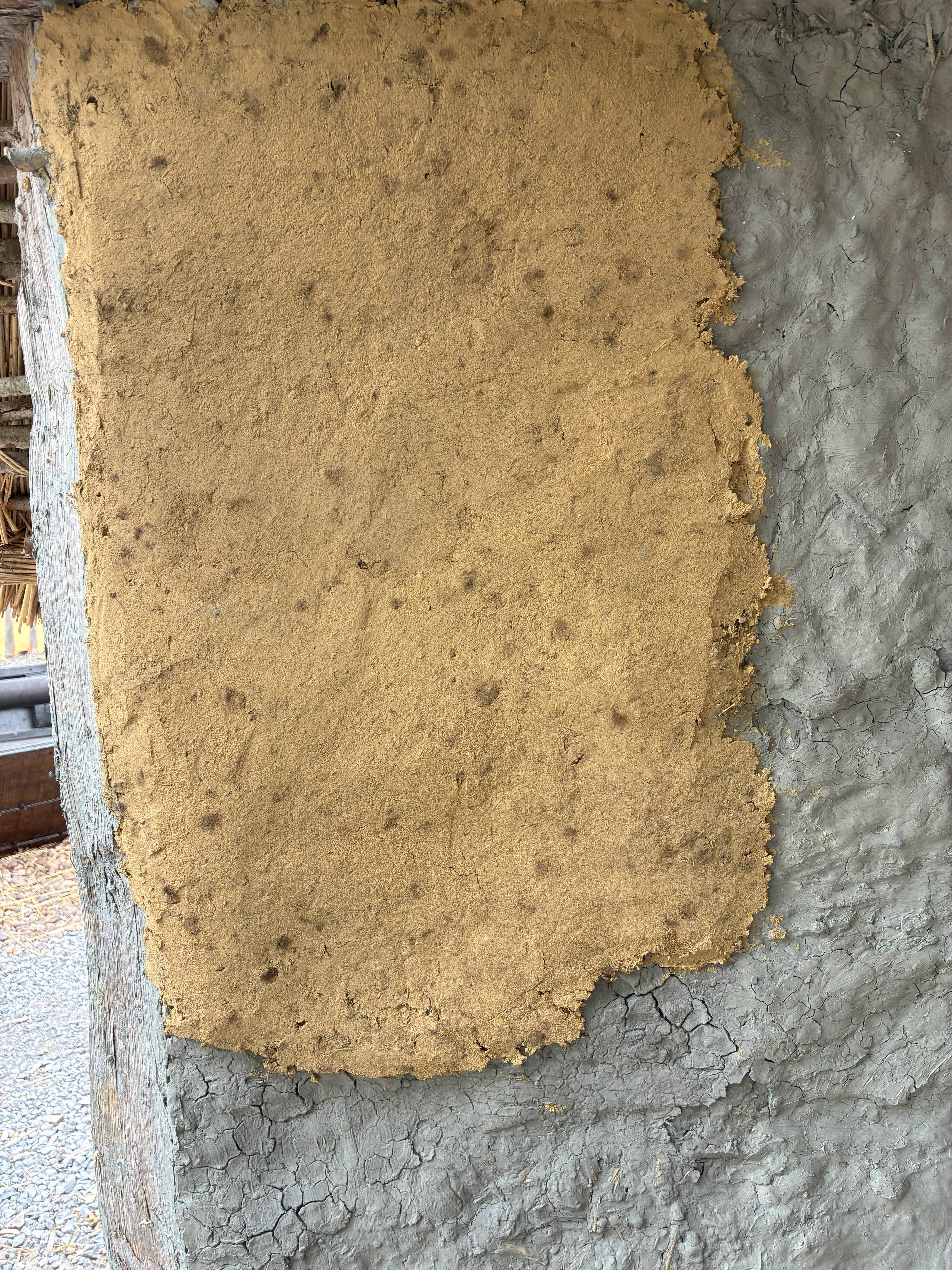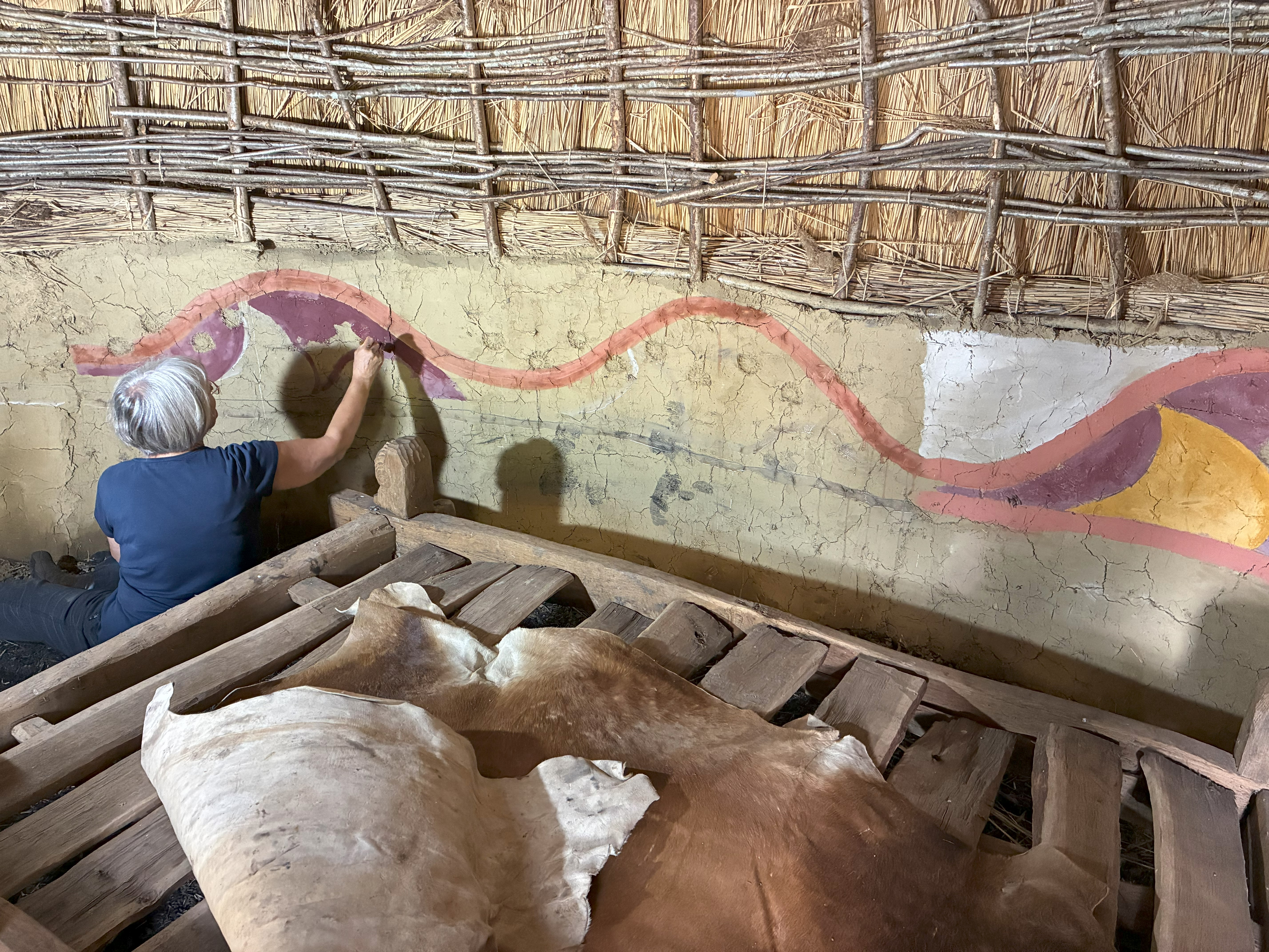 The daubing of the roundhouse wall has now been completed and we have been lucky enough to have had two days of workshops led by the wonderful folk from Pario Gallico, showing people how to make paint from scratch using natural ores and milk curds. Resisting the urge to use the curds for cottage cheese, the painting followed patterns from the pottery and woodwork from Glastonbury Lake Village. The results were surprisingly bold and effective. The designs were augmented by the occasional use of ammonites for impressed decoration, following the unique evidence from the lake village site. We have also experimented with a ‘plaster’ made of clay subsoil, sand and horse poo. It seems to have held well without cracking after 1 week.