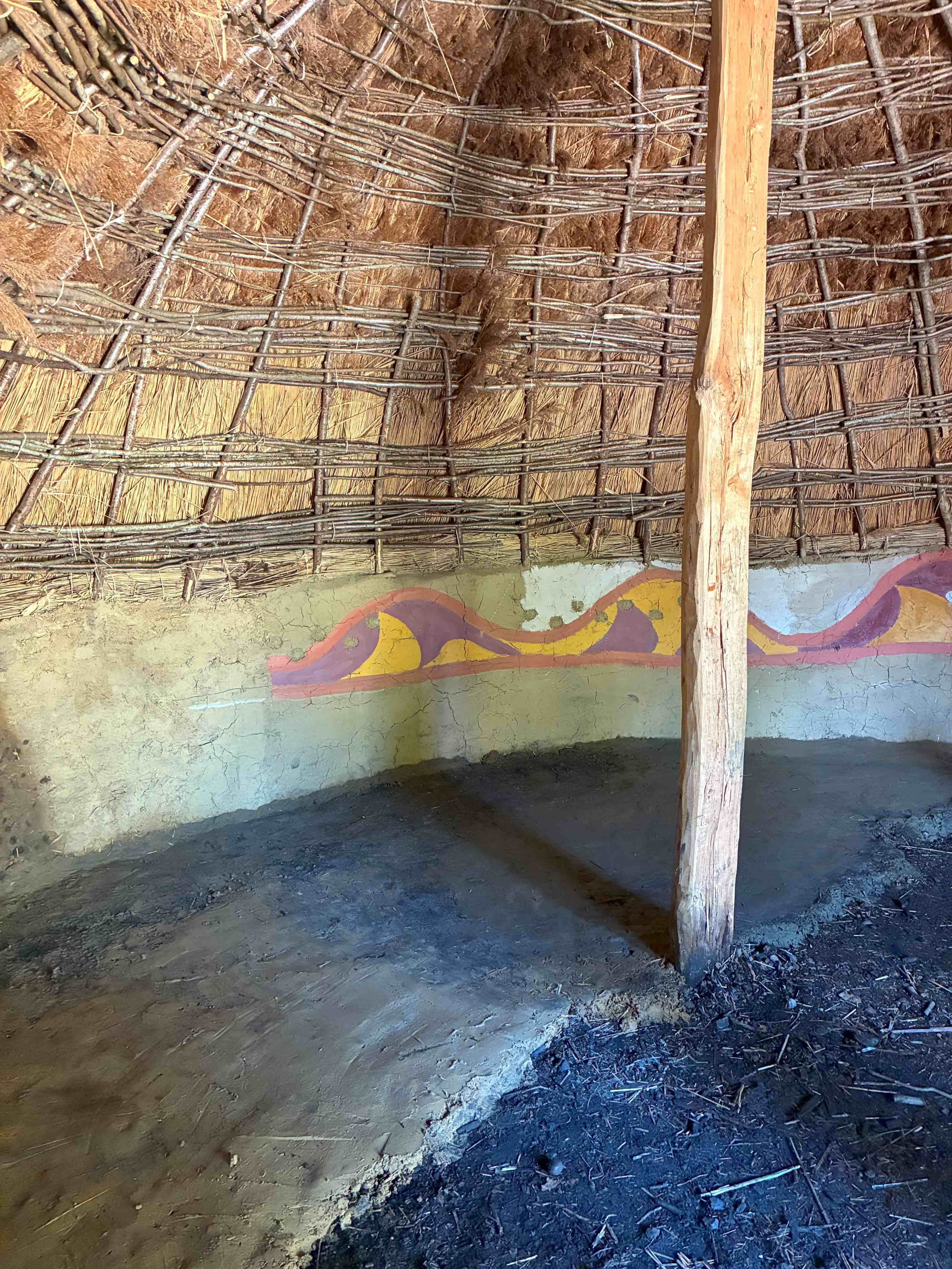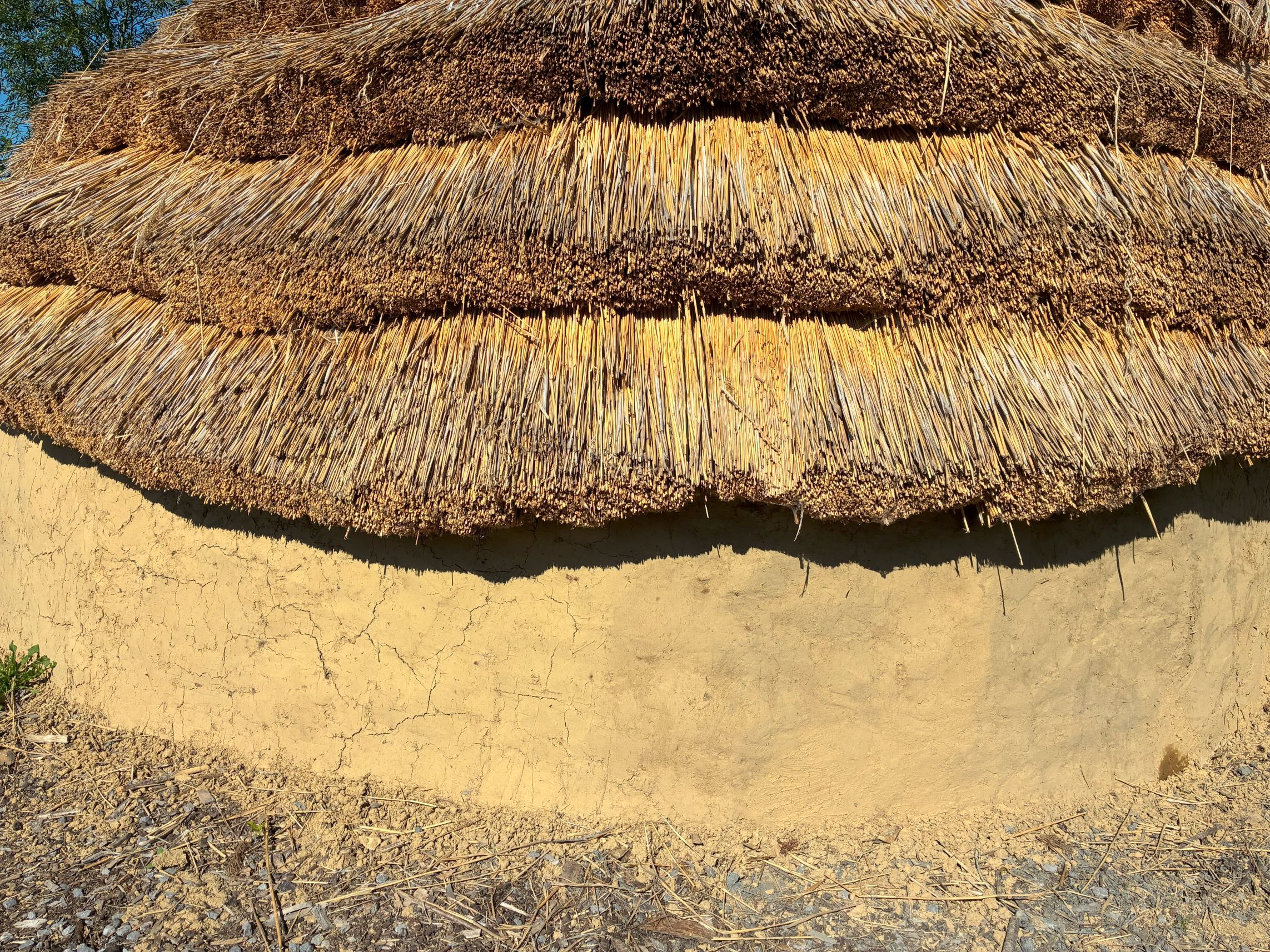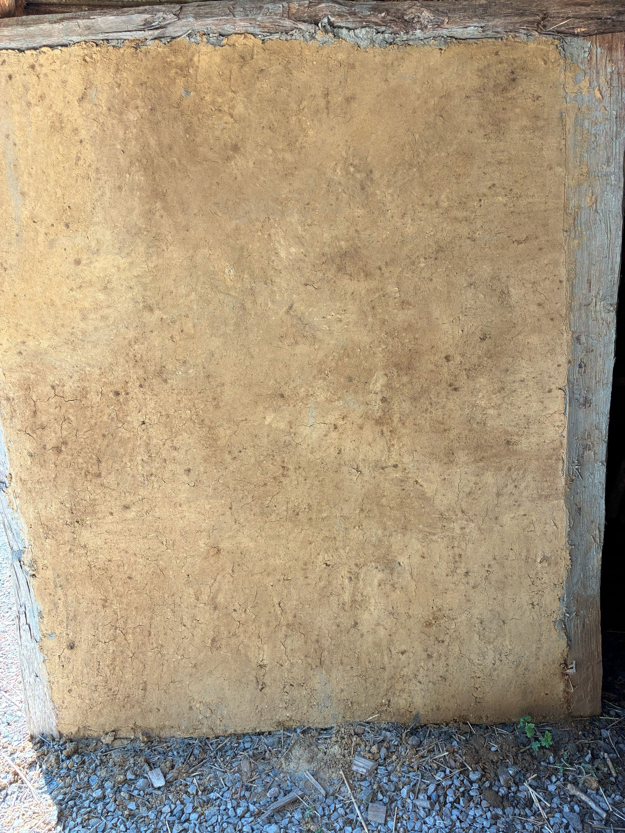 The daub walls of the roundhouse had several small cracks. In a 2m stretch, the cracks were filled with clay subsoil and smoothed over, creating a more visually appealing surface that should also have less water penetration. The ‘clay plaster’ mix of horse poo, clay subsoil and sand was applied over one side of the doorway and had hardly cracked at all after a week. Its application also formed a much smoother surface. Inside the roundhouse some old daub was mixed with new subsoil and water and lain down as a floor. The good insulation means that it will take many weeks to harden off, even in a heatwave.