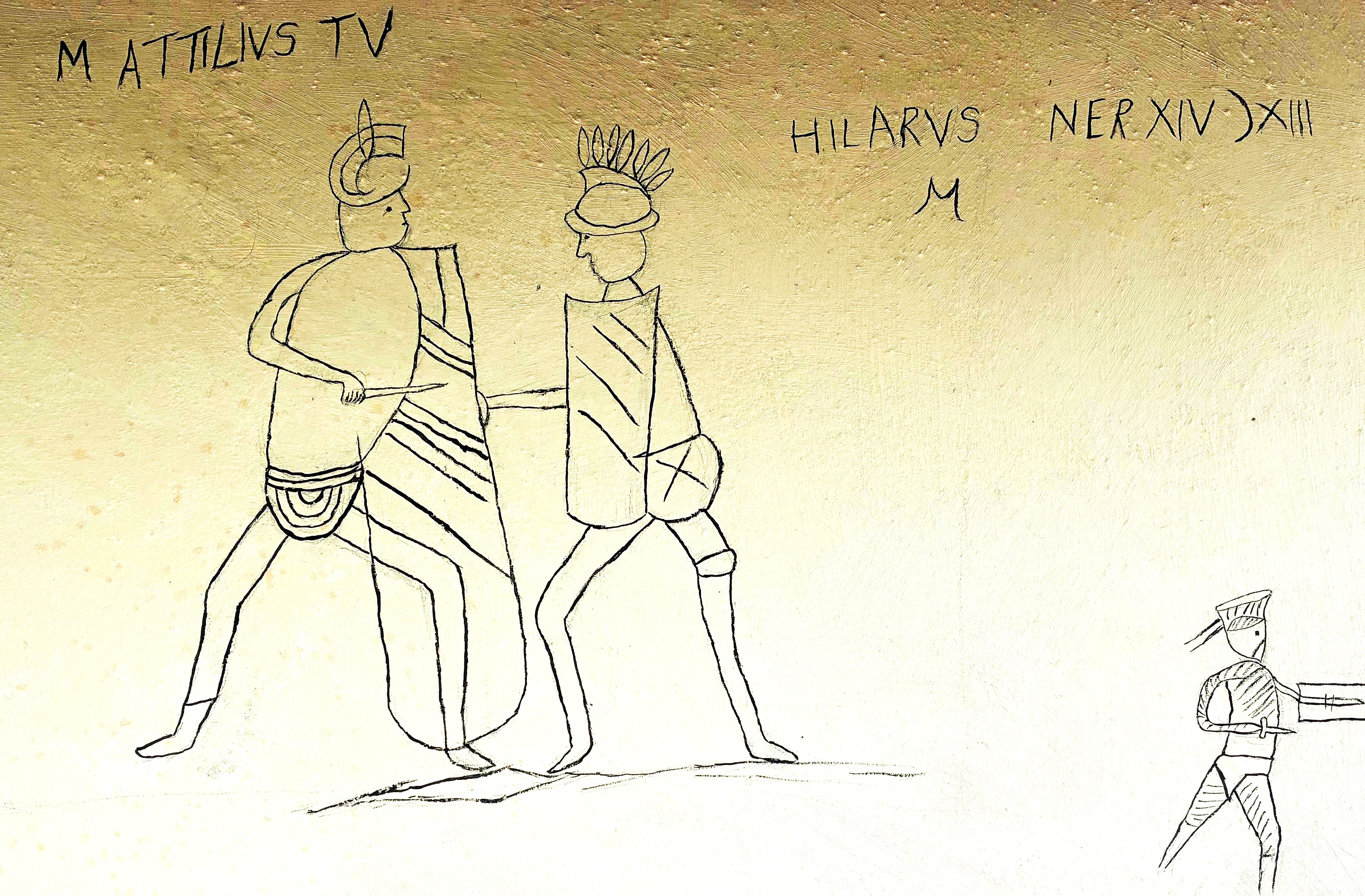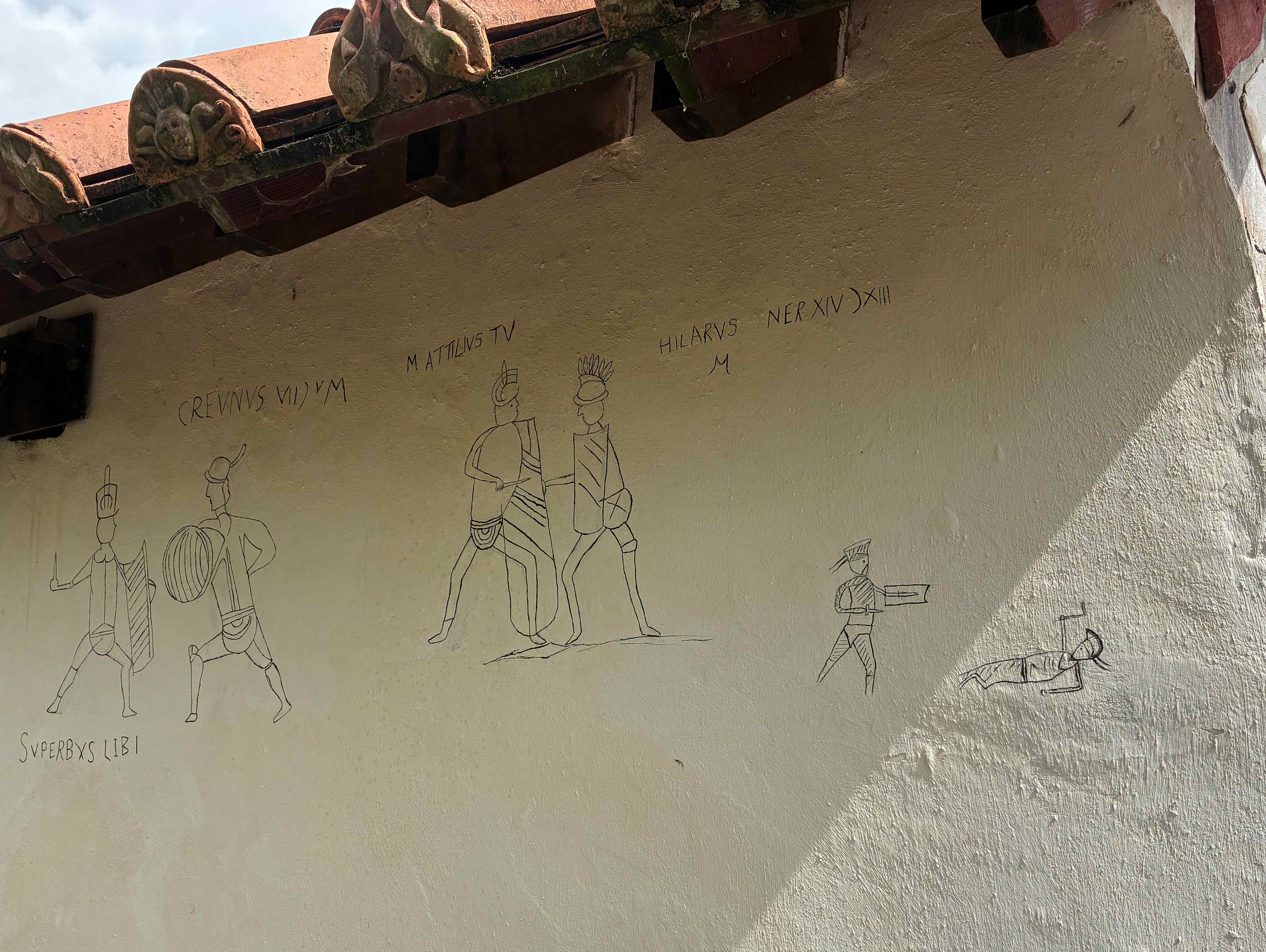 The back wall of the Roman building was subject to some vandalism by fans returning from the recent gladiatorial games at the amphitheatre at Charterhouse. As you can see from the pictures, two fights proved to be of particular interest. In the notable combat between the self effacing Superbus the murmillo and Creunus, the hoplomachus, who had triumphed in 5 of his 7 fights, the crowd were so pleased by the spectacle that Creunus earned a pardon for the crimes which had led him into the arena and the slave Superbus was given his freedom. The surprise of the day came when Atillus the murmillo, emerged victorious over that great champion Hilarius the parmularius, of Nero’s troupe, who had won 12 victory crowns from his 14 fights. Although badly wounded, the adulation of the crowd ensured that the doughty warrior Hilarius was granted his freedom, after which he chose to continue in the profession as a trainer. Sadly both lions were still too ill from their recent voyage to take part, much to the relief of the condemned, whose fate will have to wait until the next games.