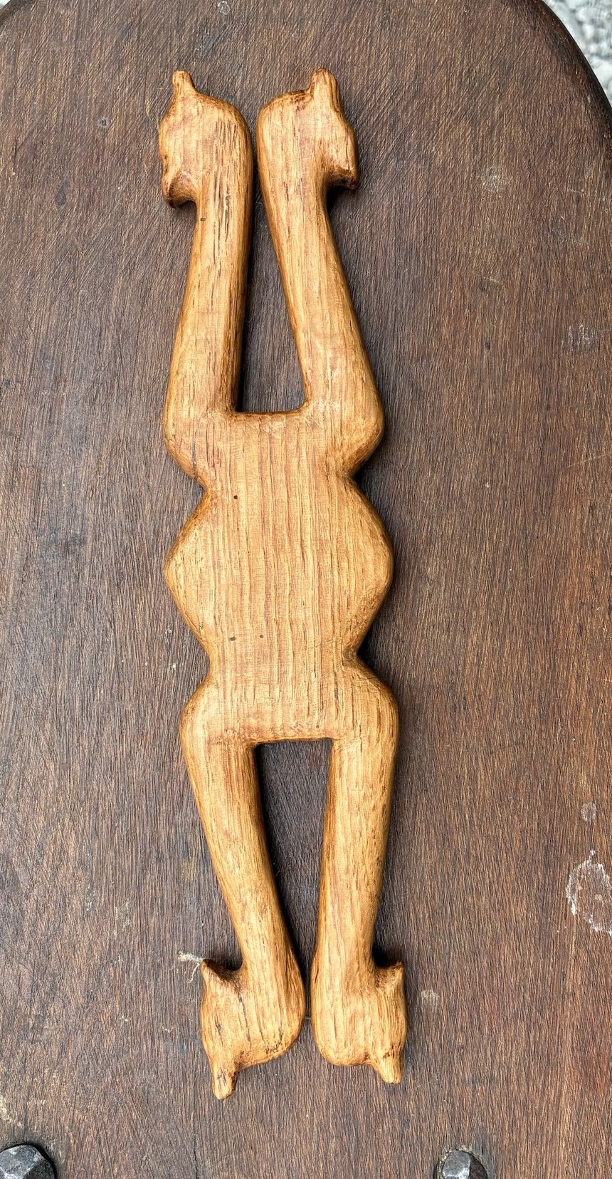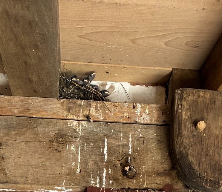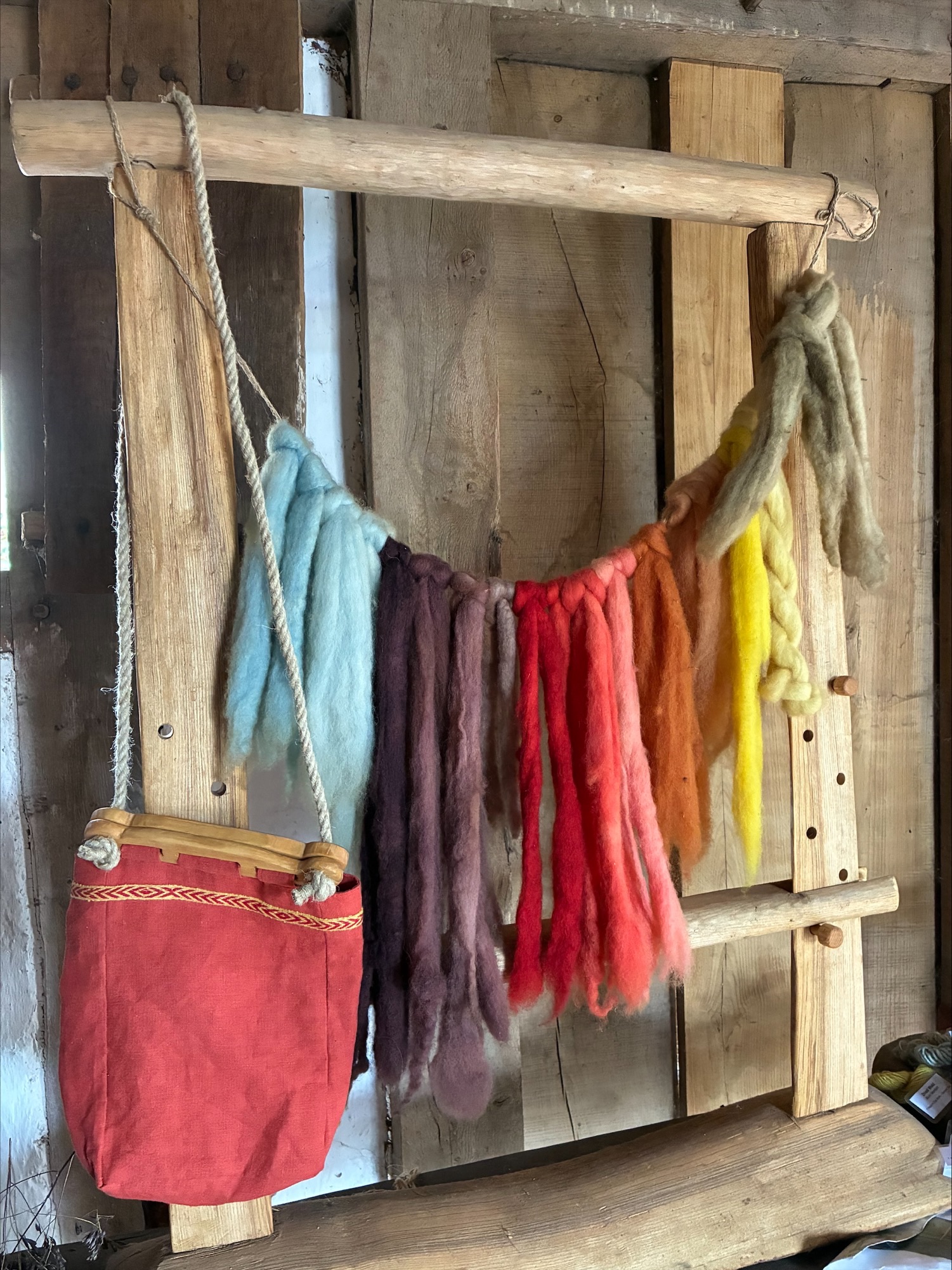We are gradually adding more small items to the longhall. The latest ones include a shuttle from Viking Dublin with pairs of horse heads at either end, a bowl decorated with chip carving from the Oseberg boat burial and a Viking bag. Lots of different designs and sizes have been found for the wooden mouths of such bags. Our version uses linen with a tablet woven strip for decoration, but a leather version could be made in the same way. Meanwhile the second brood of swallow chicks are helping to decorate the hall in their own unique way.