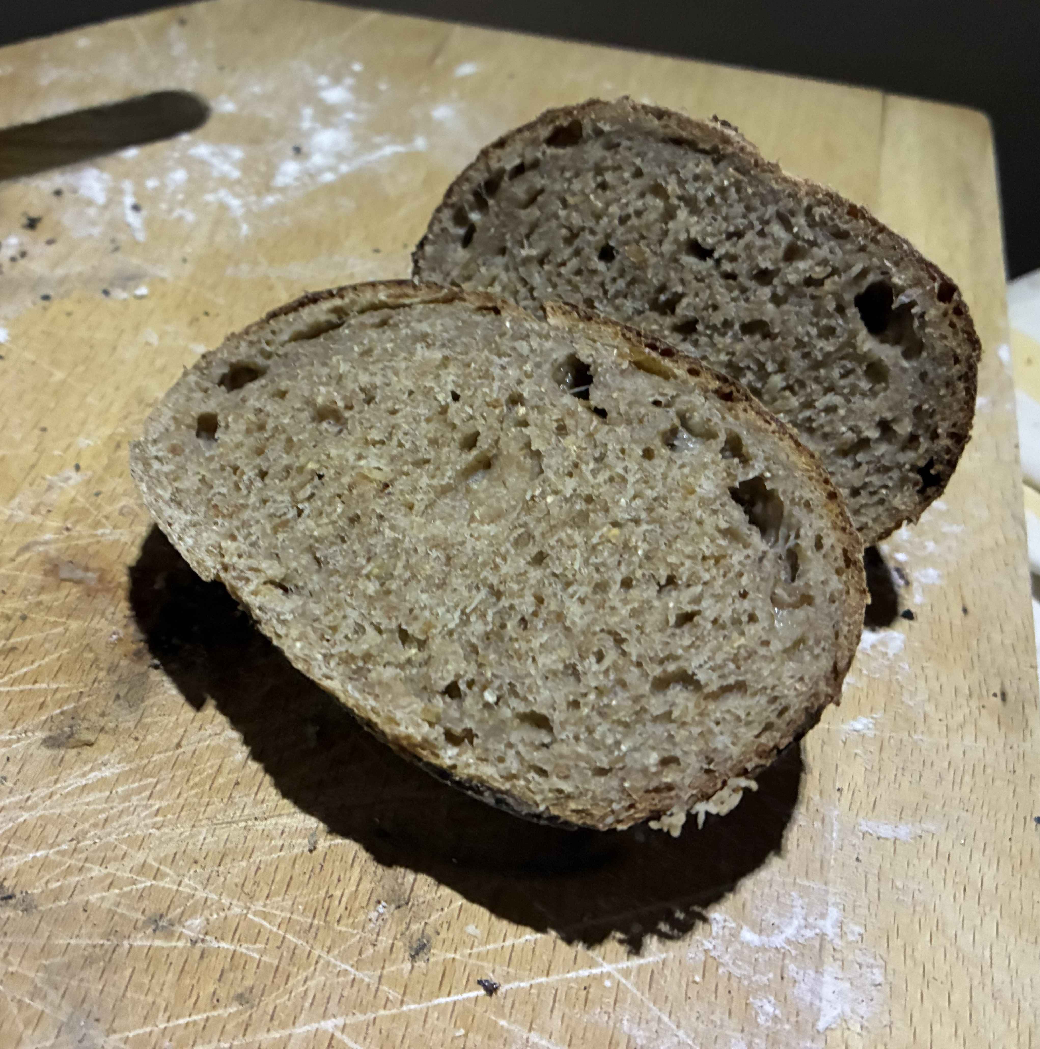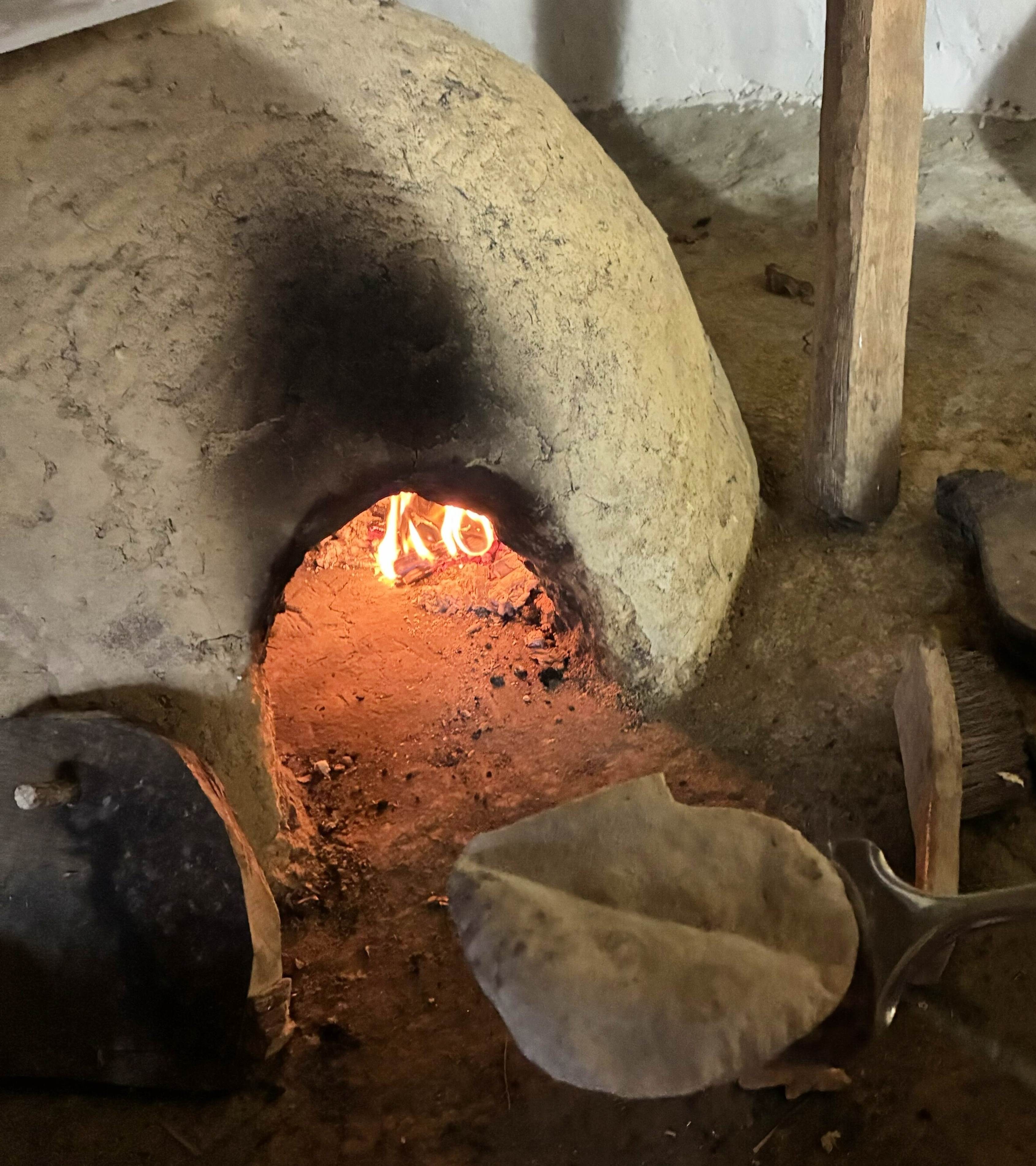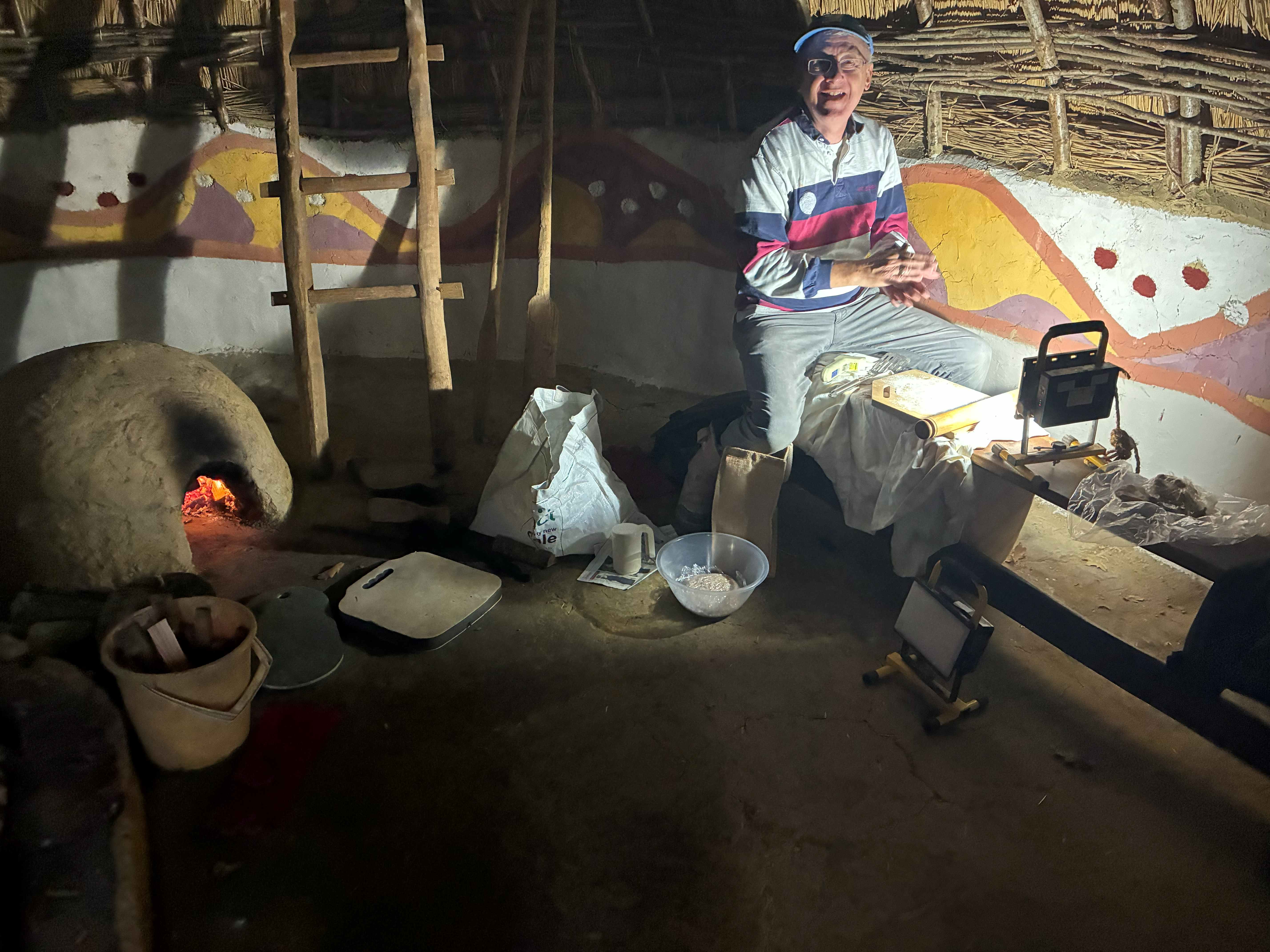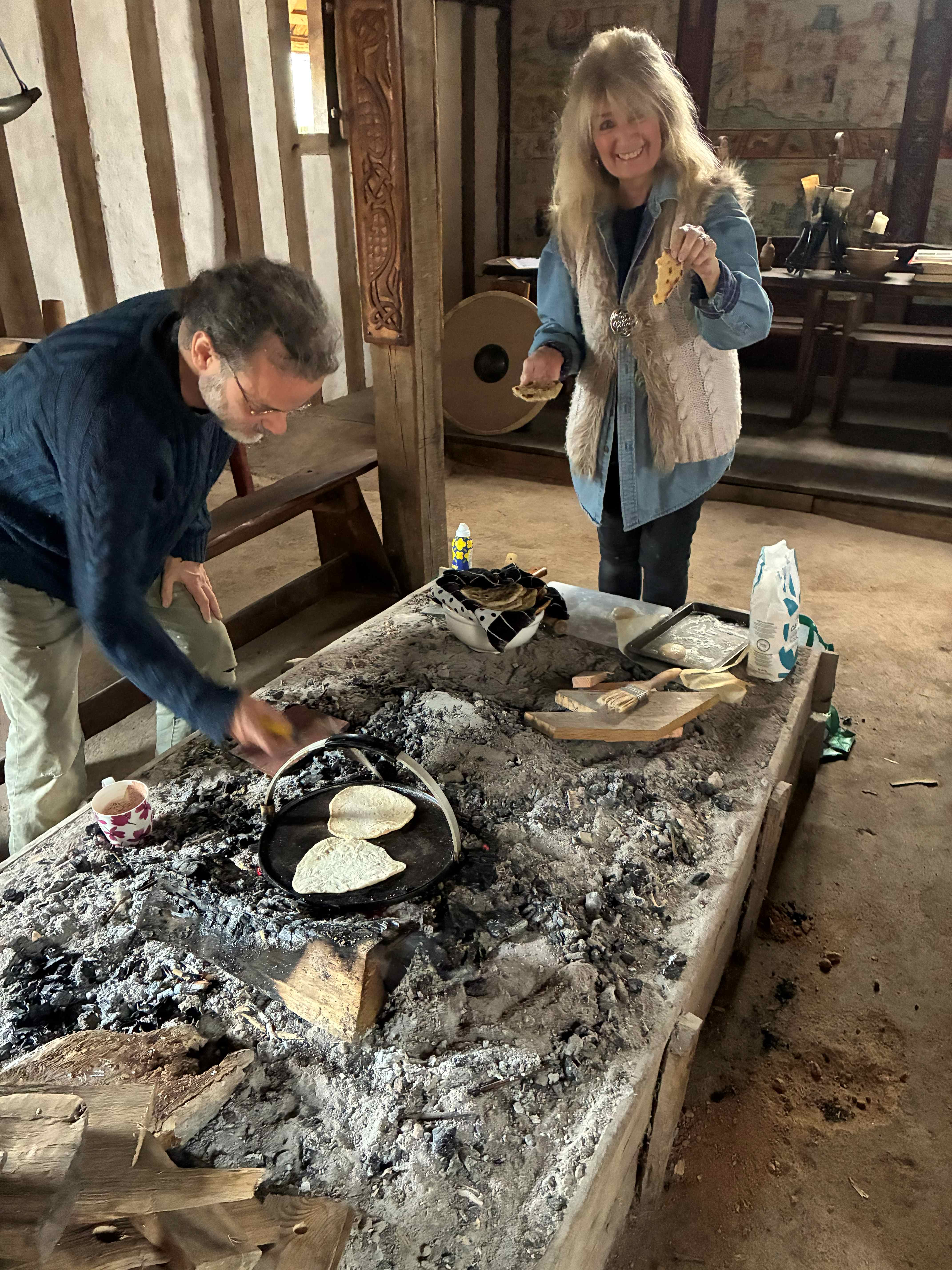 This week we had fun making different breads in the longhall and the new Iron Age oven in the roundhouse. Lee’s naan bread cooked very well on a skillet over some hot embers in the hall. The oven in the roundhouse still has a bit of moisture in the structure to steam off, but when the fire was moved to one side, the oven floor was over 210 degrees. Martin’s unleavened flatbread cooked very well on that floor, with just a few minutes per side. By the time his small loaf went in, the temperature had dropped a bit and it took longer than expected, but when sliced open, you could see that it had risen well.